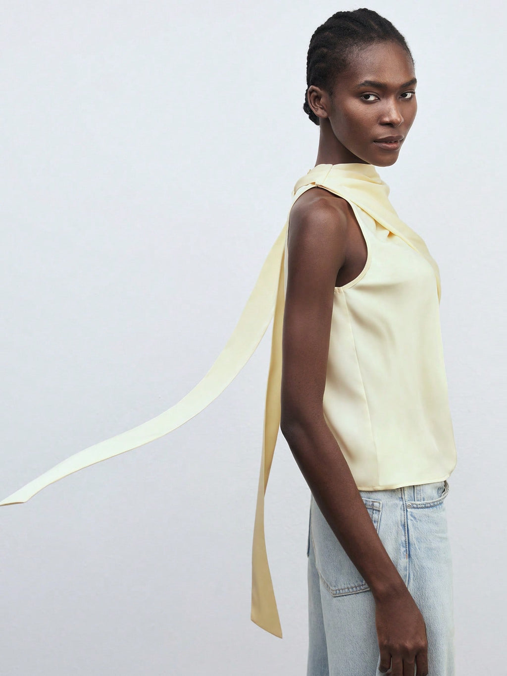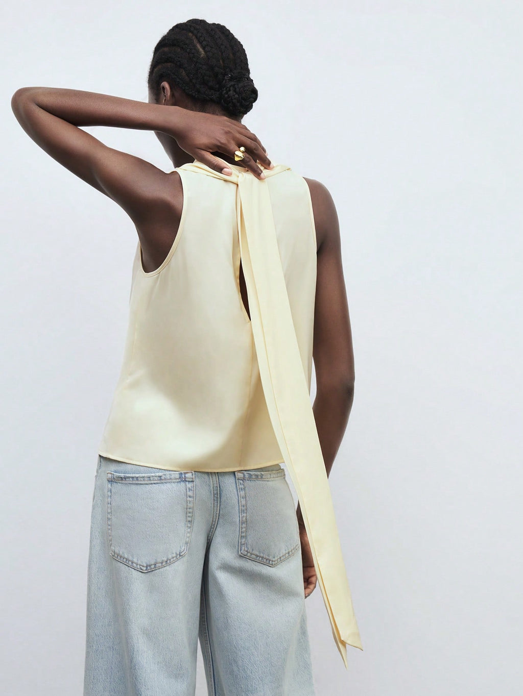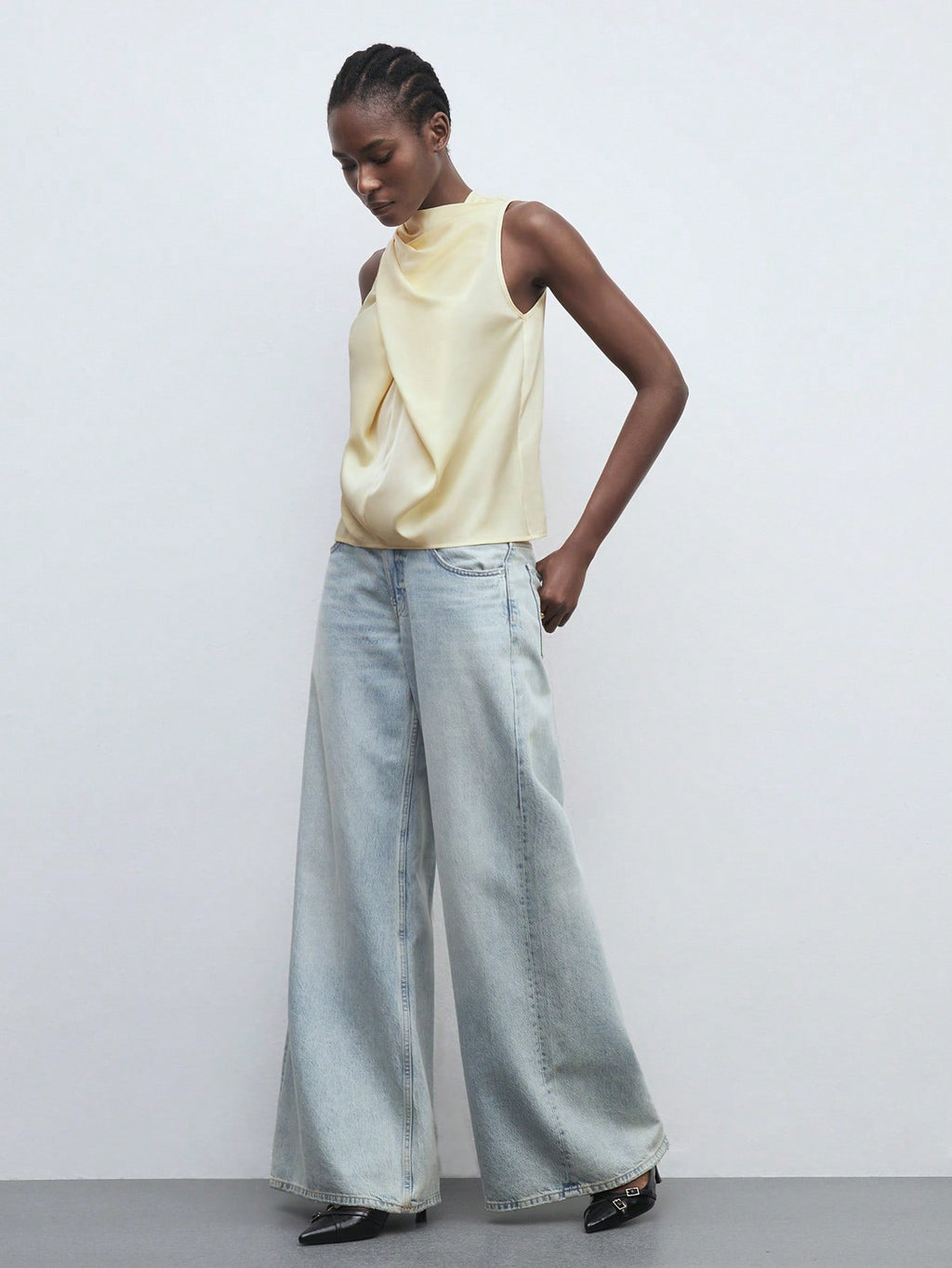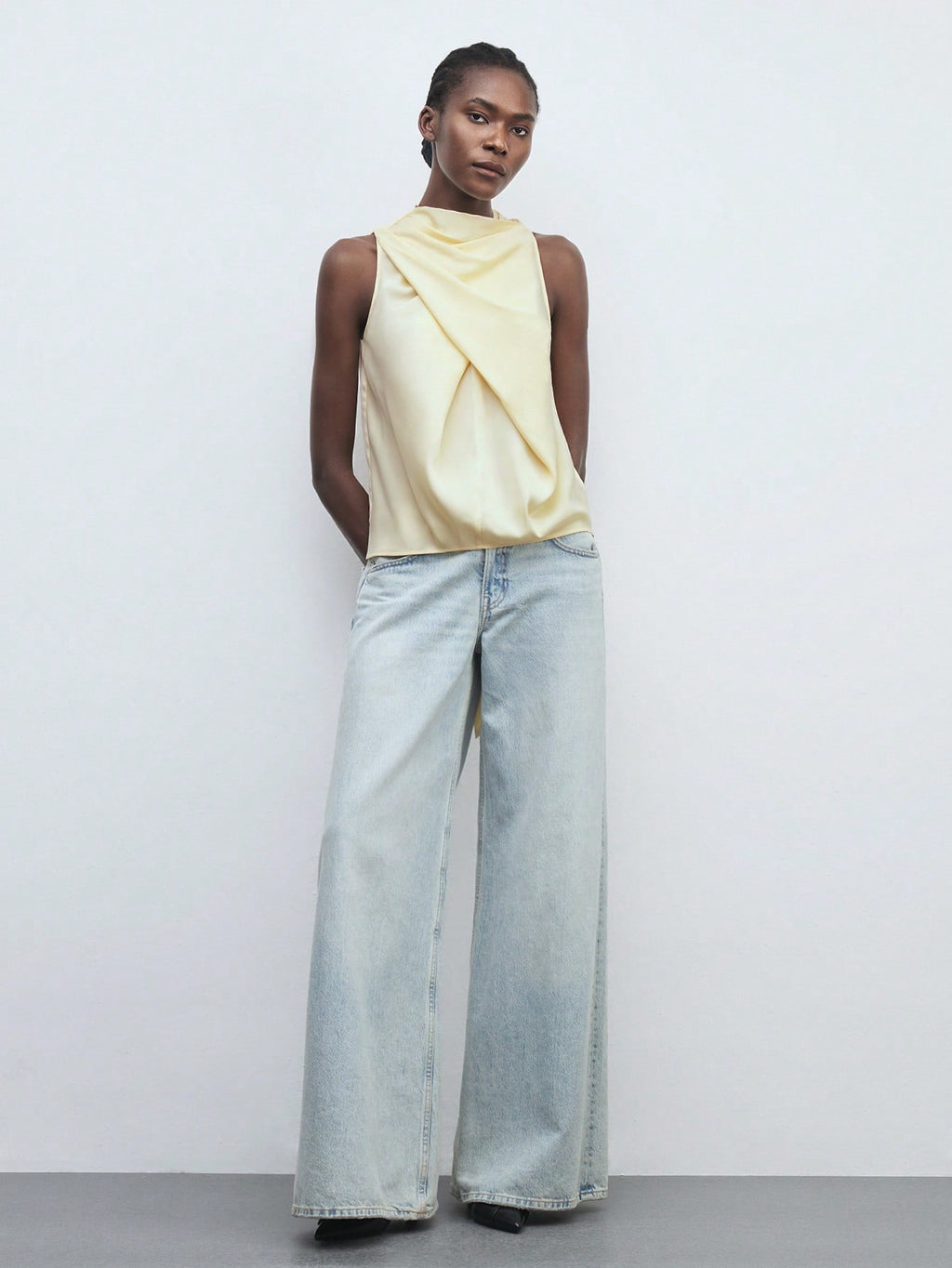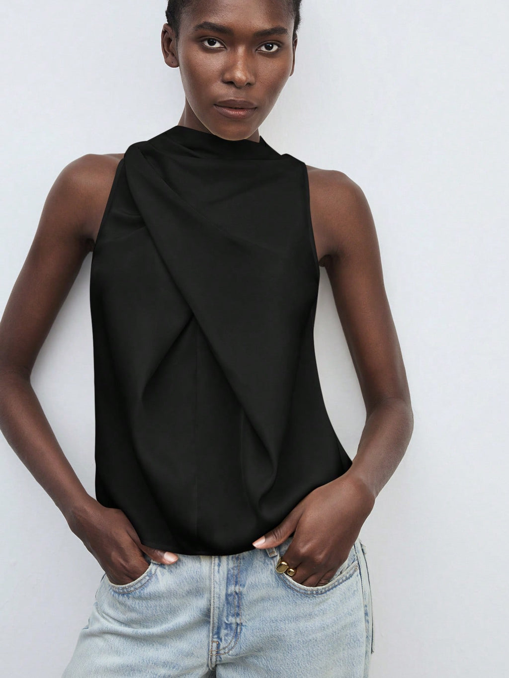MiuVogue Women's Apricot Summer Outfit, Standing Collar Ruched Front With Middle Pleats, Button Placket At Back, Satin Fabric, Elegant