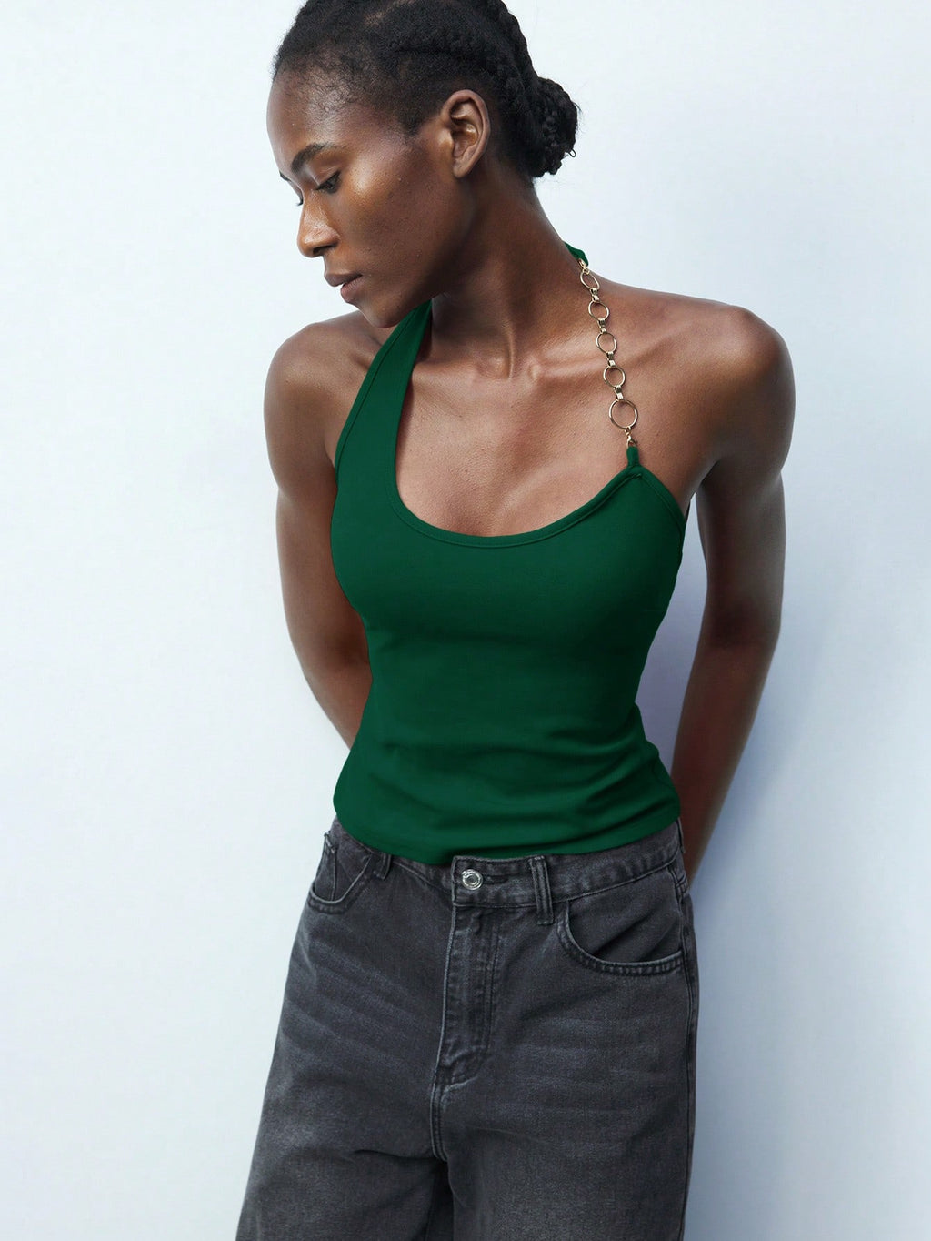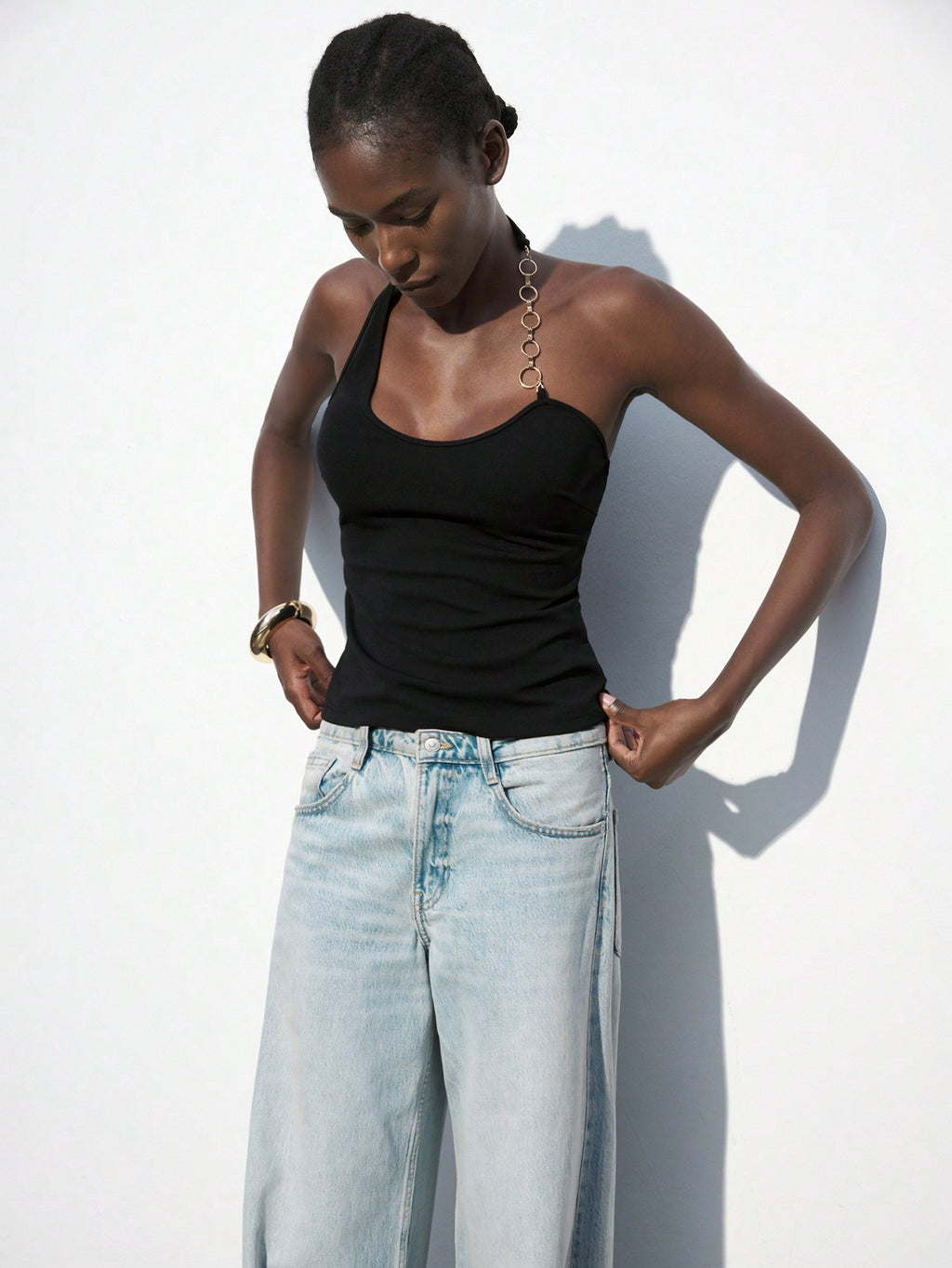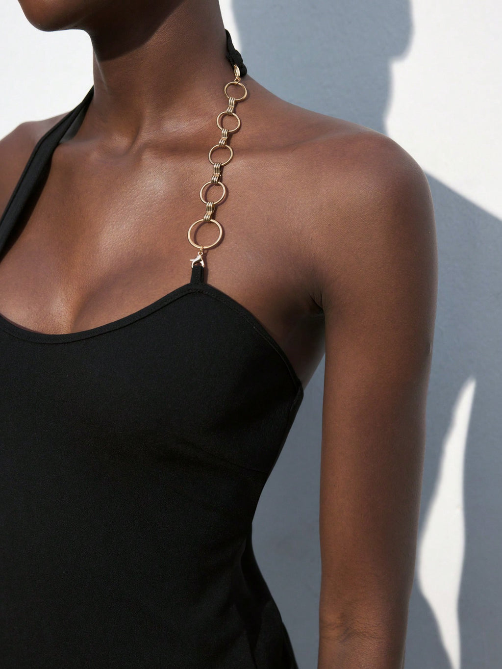 MiuVogue Women's Black Asymmetric Halter Deconstructed Design Metal Decor Versatile Garment, Modern Urban Design Sense, Asymmetric Neckline Design, Black Slim-Fit Ruched Decor, Suitable For Spring And Summer