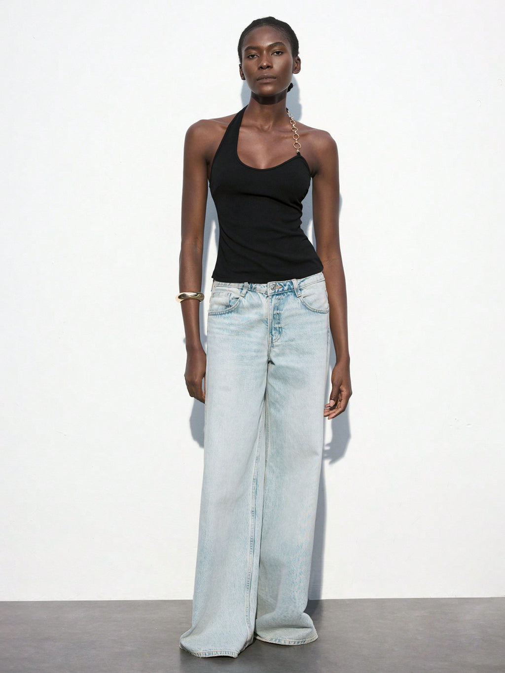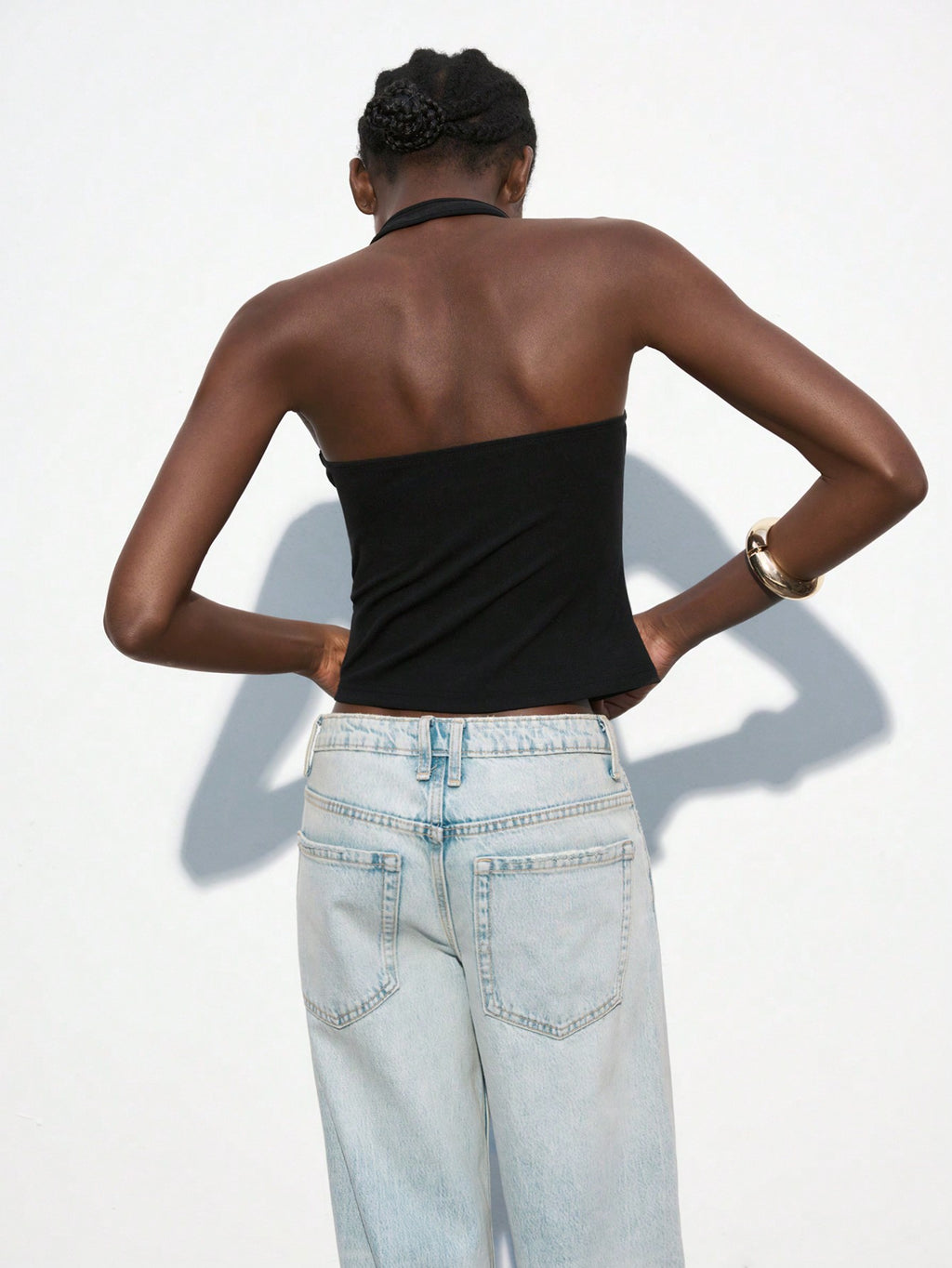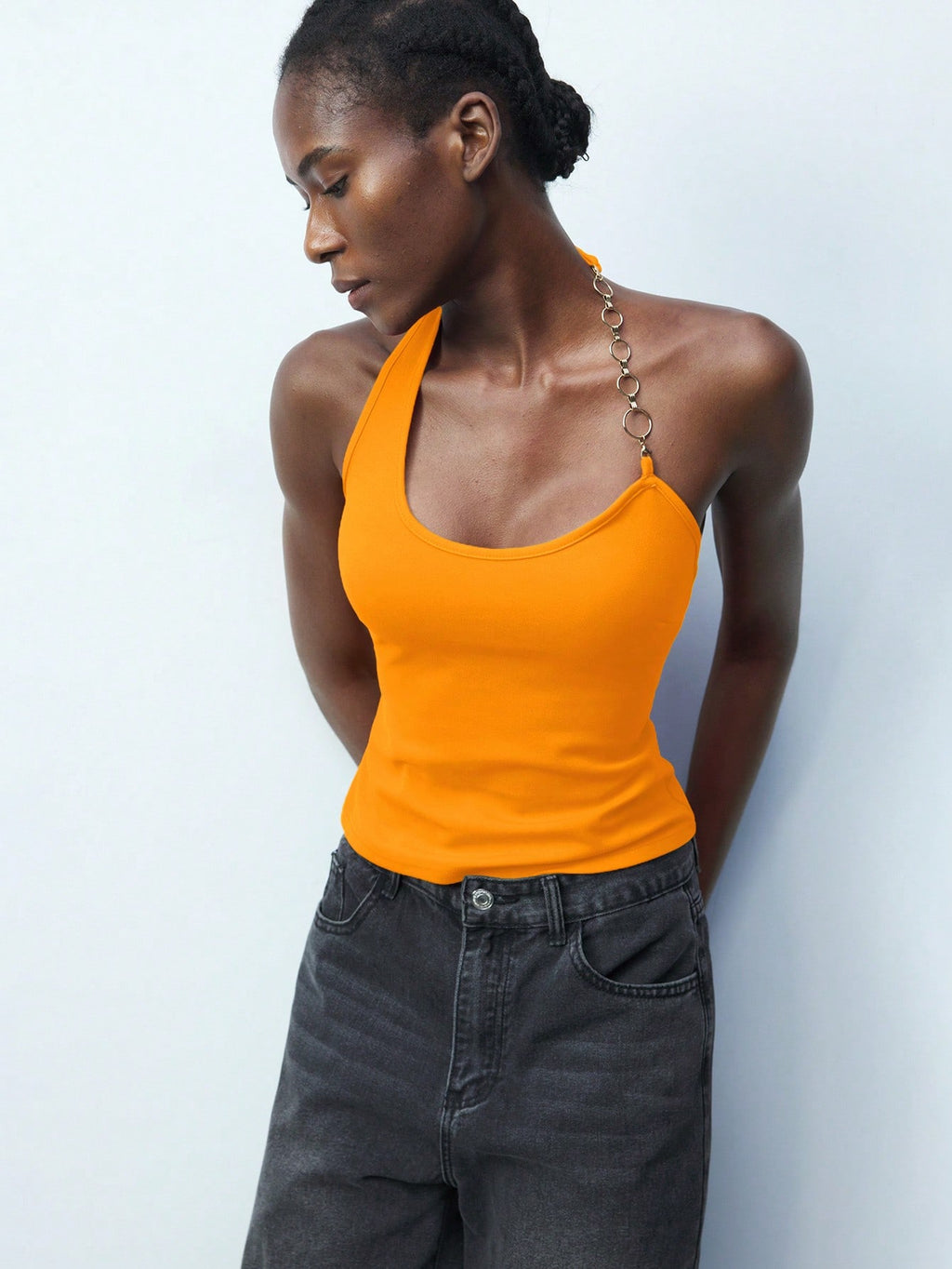MiuVogue Women's Black Asymmetric Halter Deconstructed Design Metal Decor Versatile Garment, Modern Urban Design Sense, Asymmetric Neckline Design, Black Slim-Fit Ruched Decor, Suitable For Spring And Summer