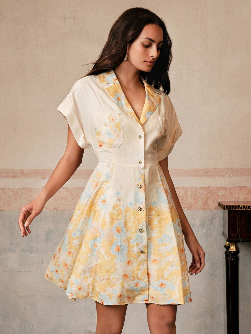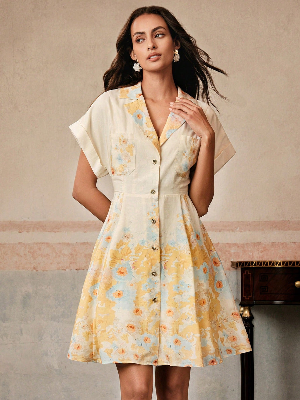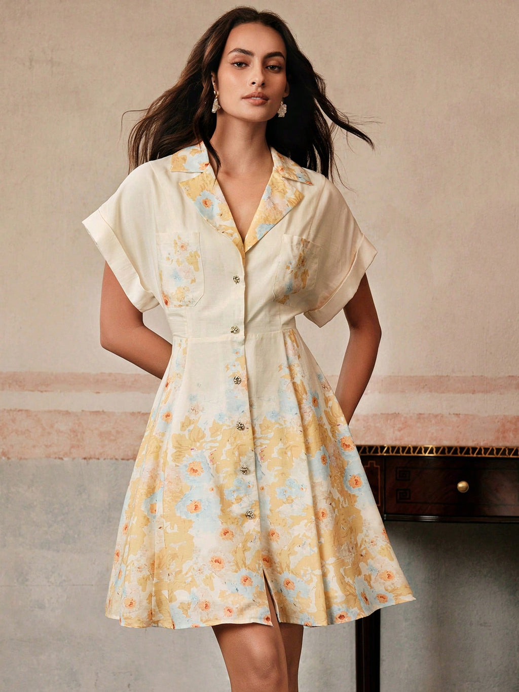 MiuVogue Women's Elegant Collar Lightweight Luxury Resort Floral Print Waist Fitted Shirt Dress, Spring Outfits For Summer Clothes