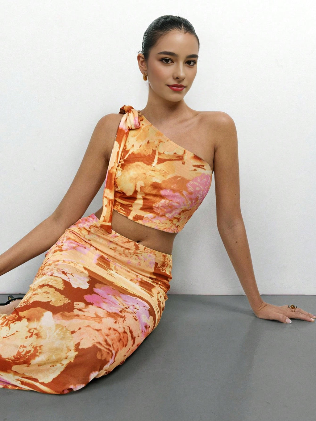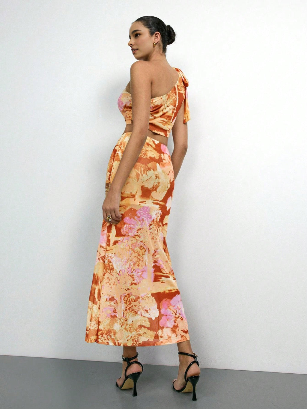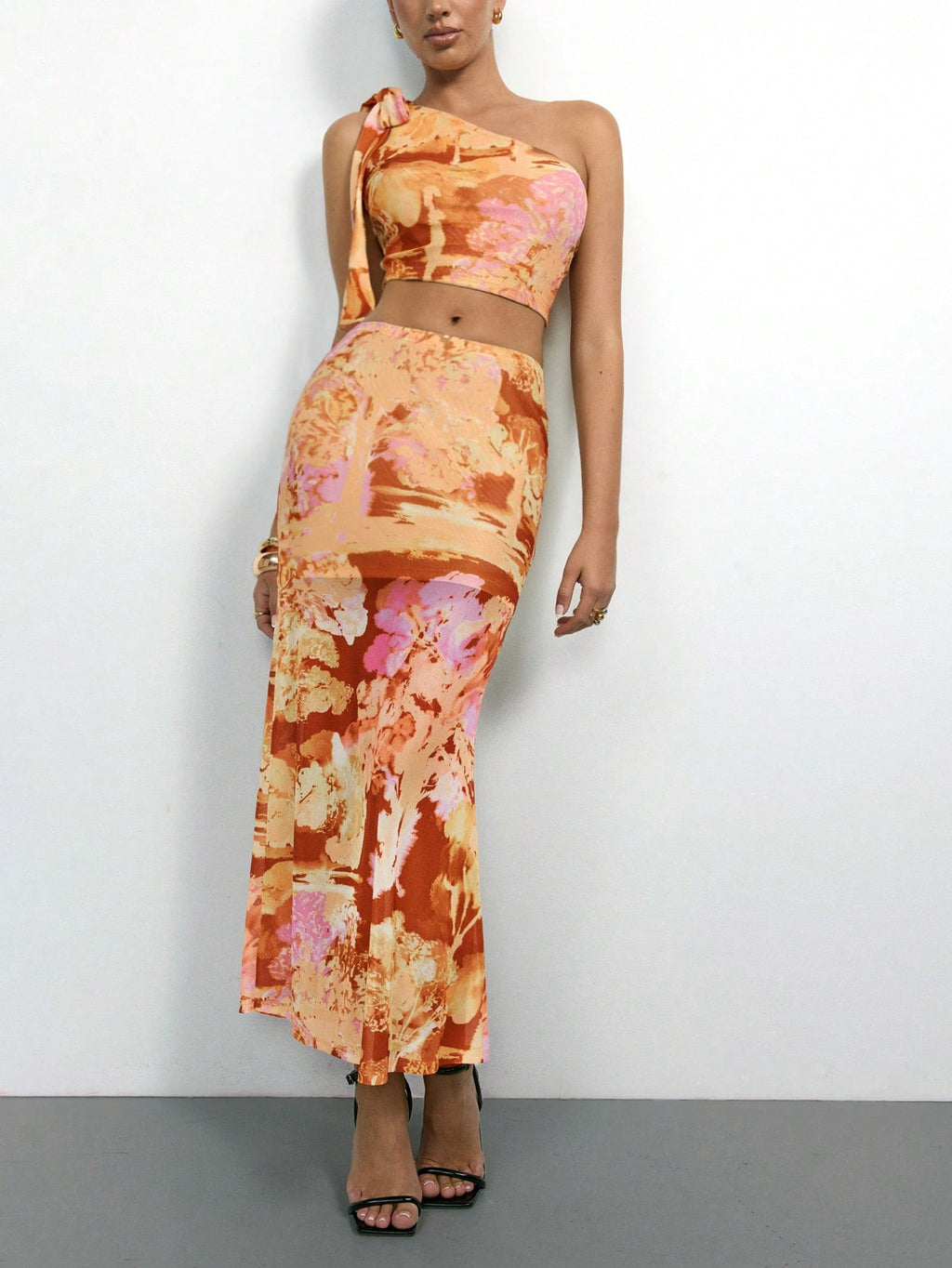 MiuVogue Women's Orange Summer Outfit, Floral Print Spaghetti Strap Cropped Tank Top And High Waist Elastic Waist Printed Mesh Fabric Fitted Long Skirt Set,Elegant, Fashionable, Comfortable And Sexy