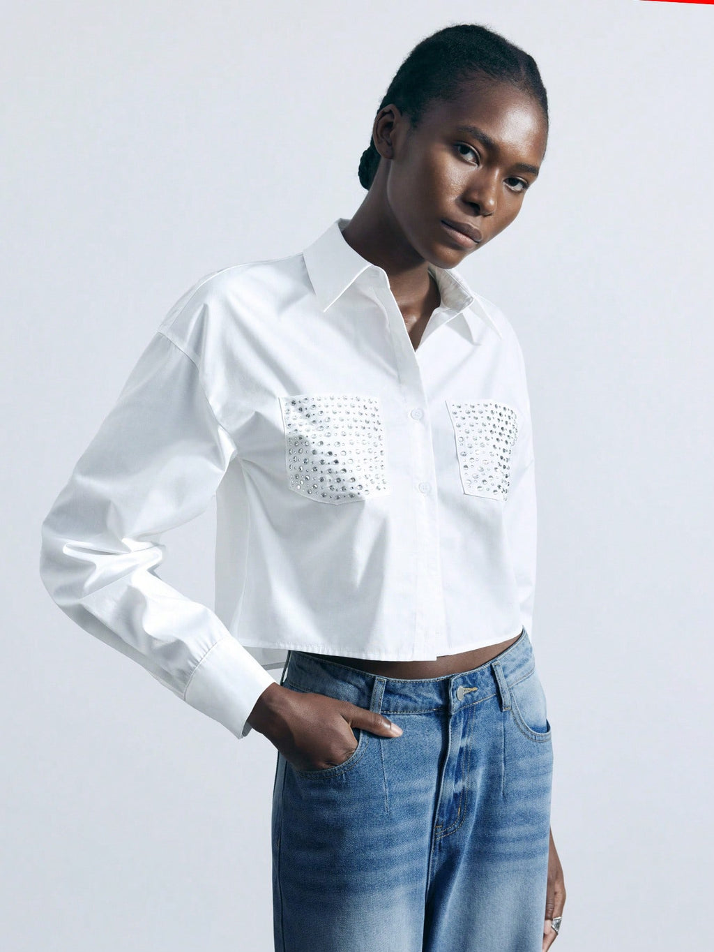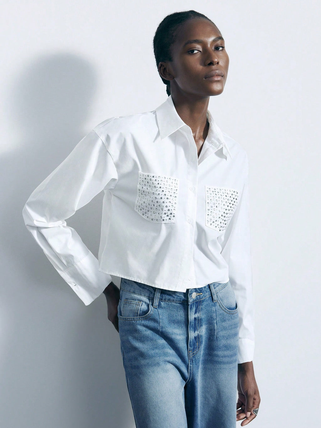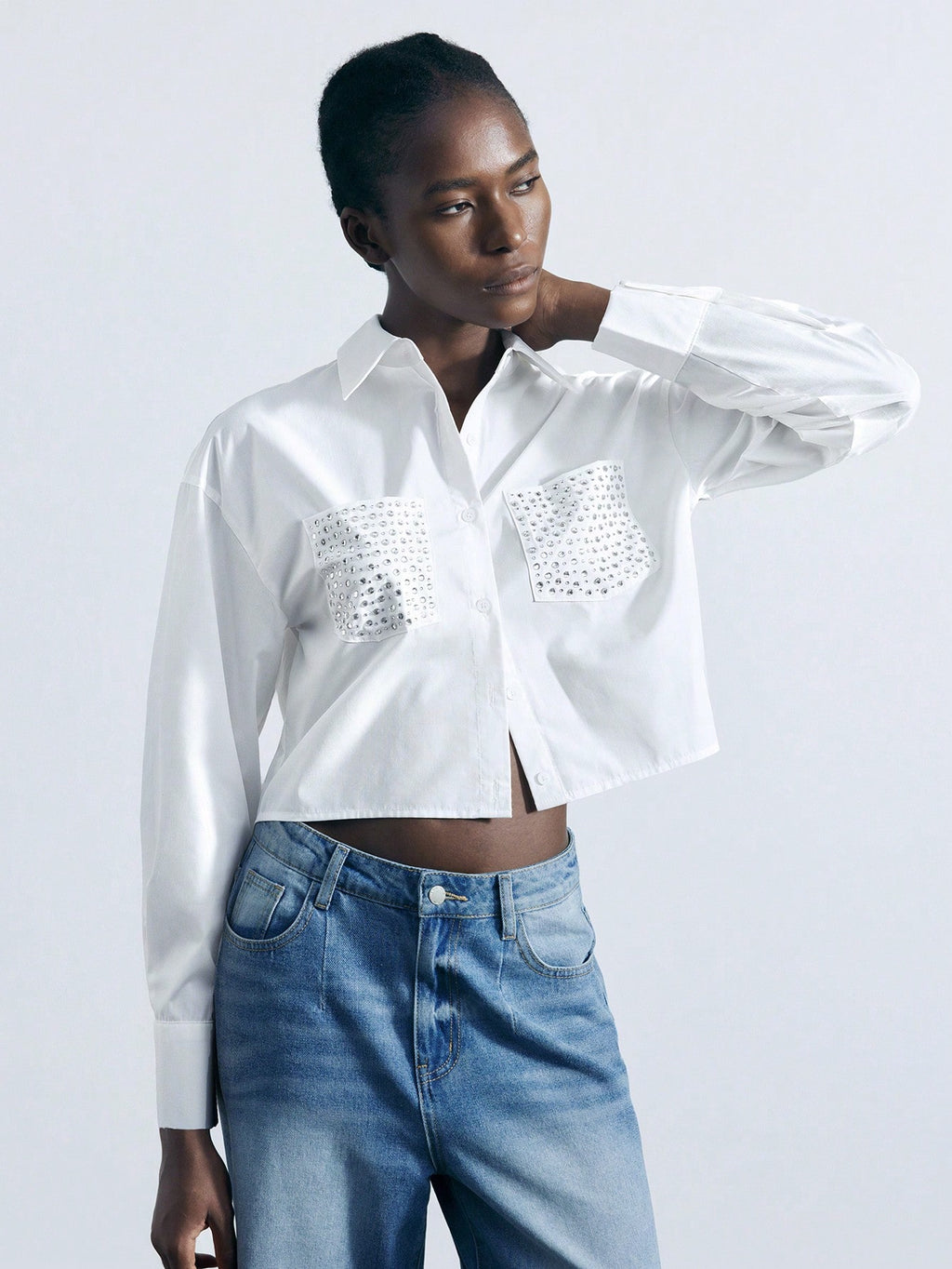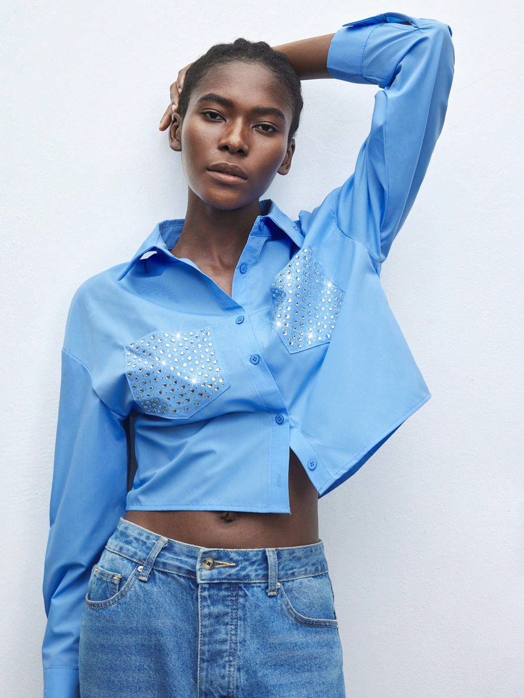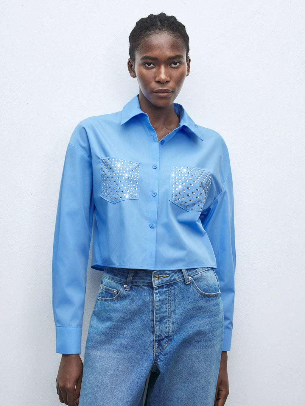 MiuVogue Women's Rhinestoned Urban Design Lapel Front-Open Long Sleeve Short Fashionable Shirt, Suitable For Spring/Summer, St. Patrick's Day, Easter, Chinese New Year, Music Festivals