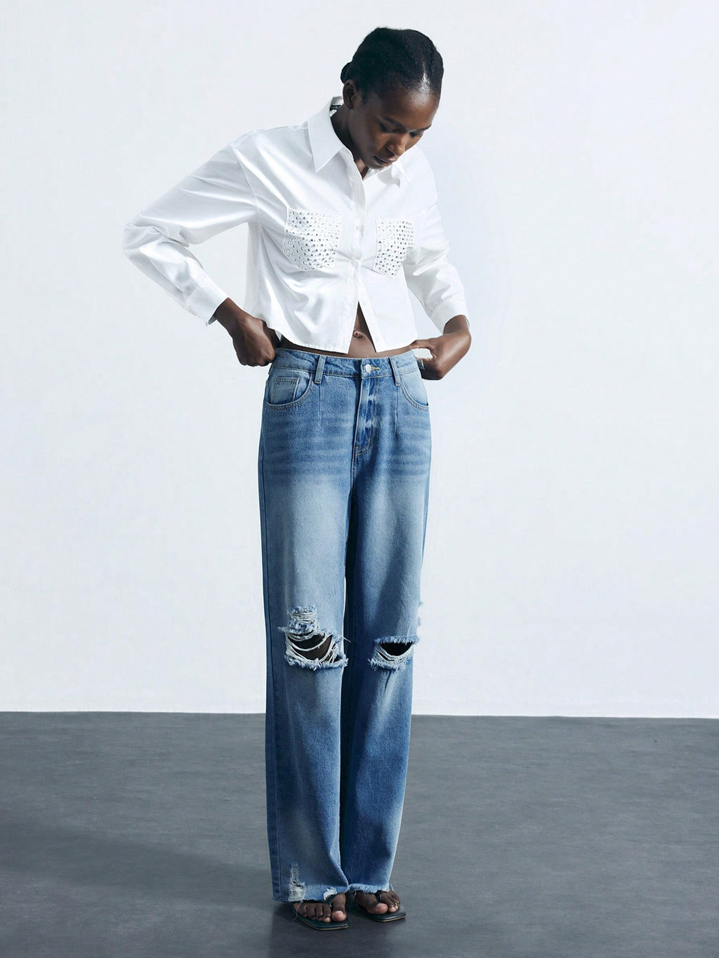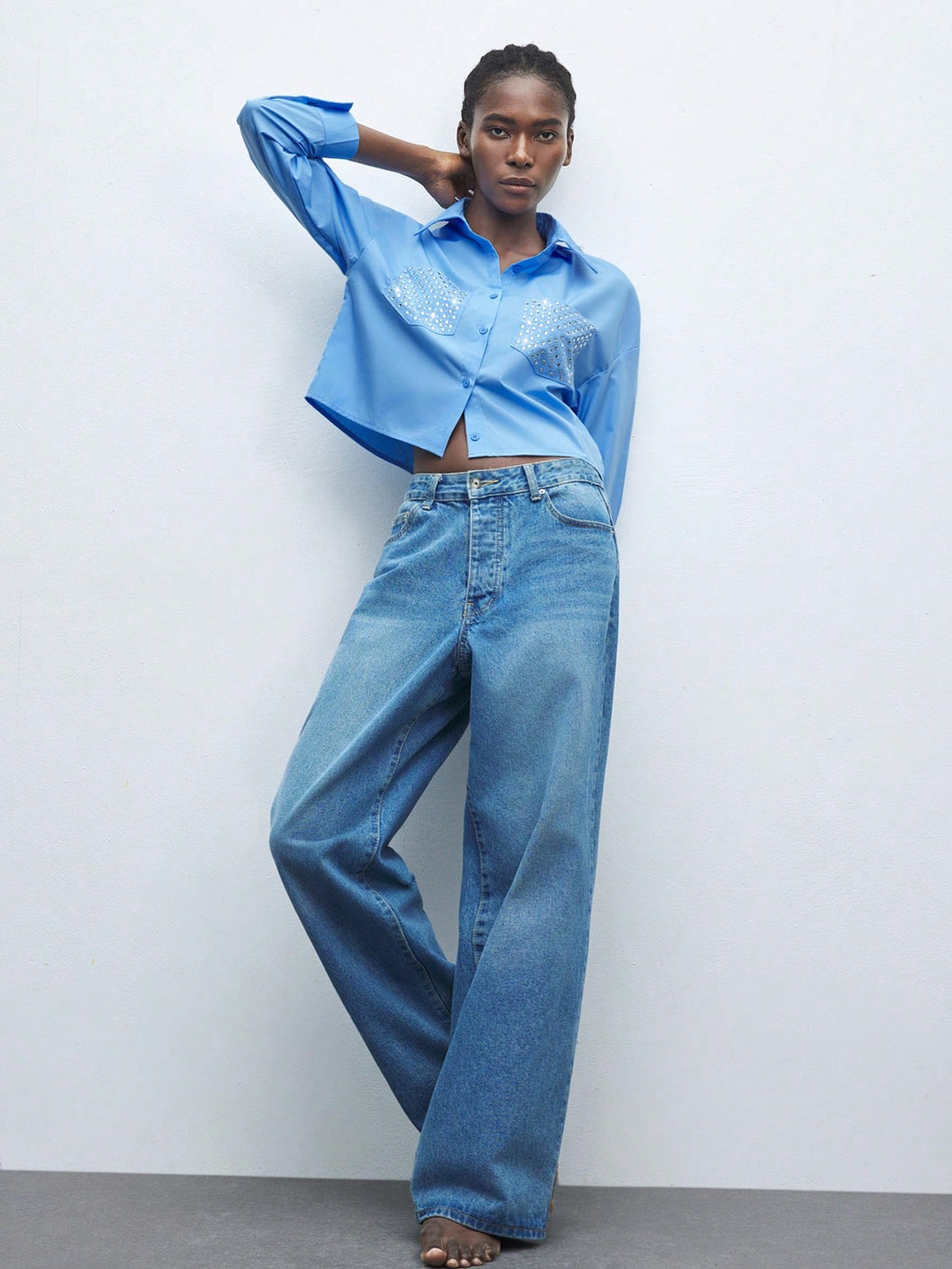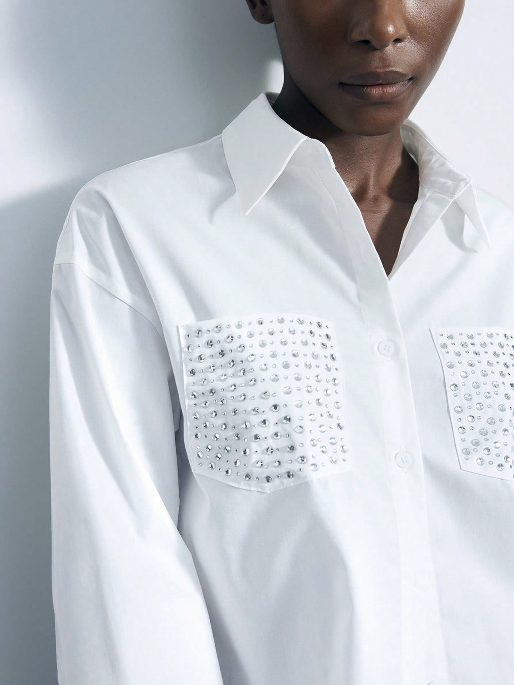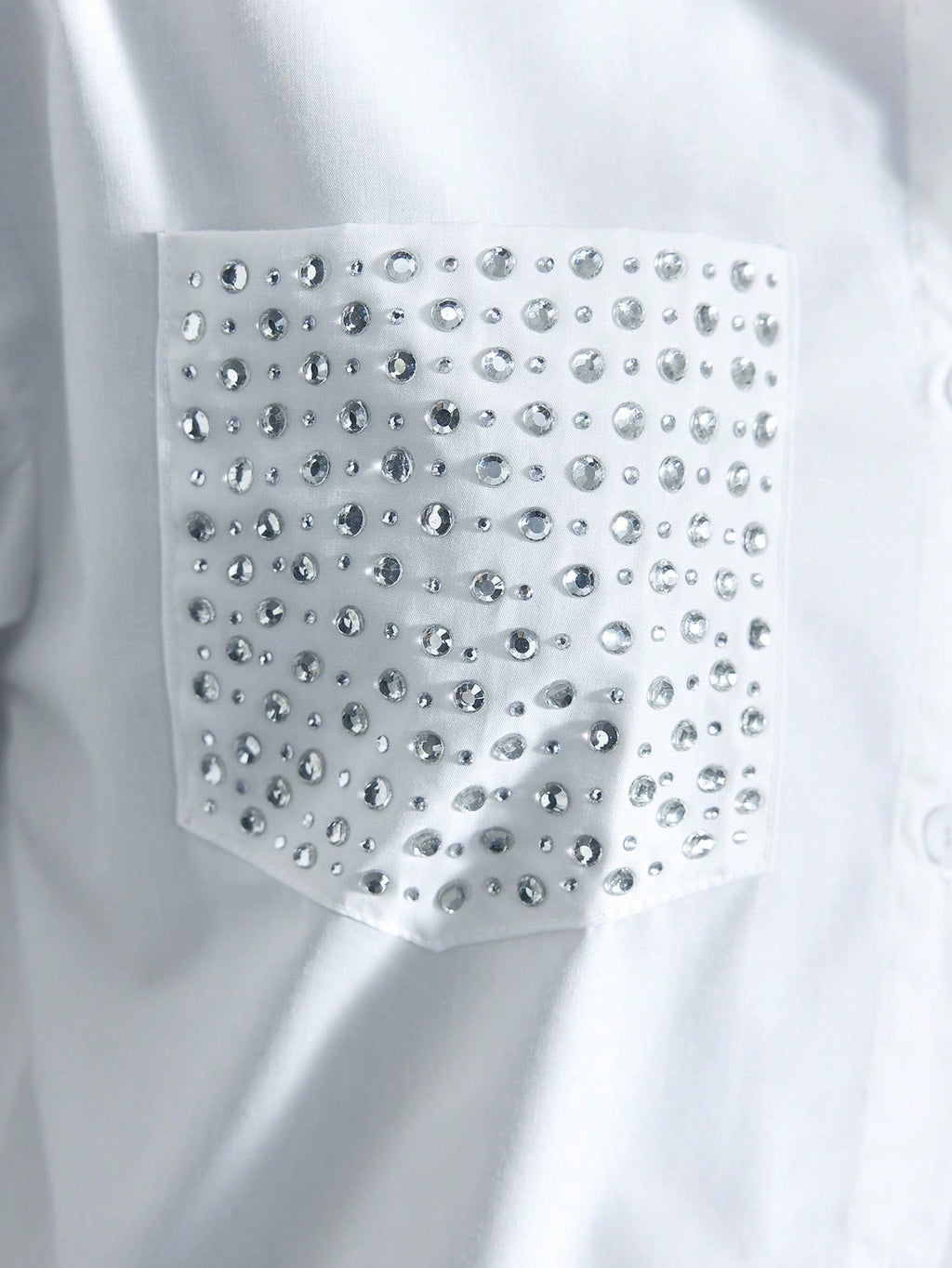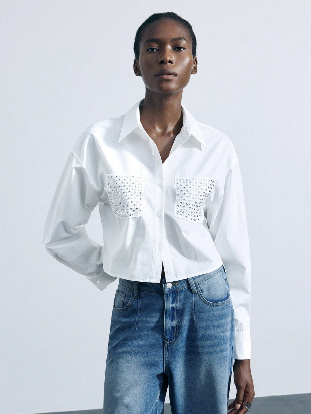 MiuVogue Women's Rhinestoned Urban Design Lapel Front-Open Long Sleeve Short Fashionable Shirt, Suitable For Spring/Summer, St. Patrick's Day, Easter, Chinese New Year, Music Festivals