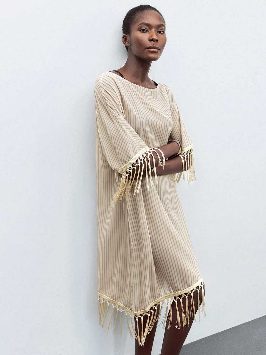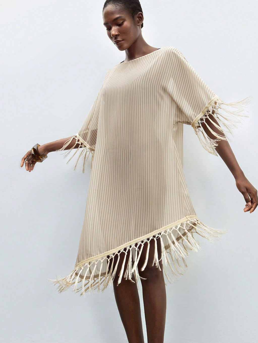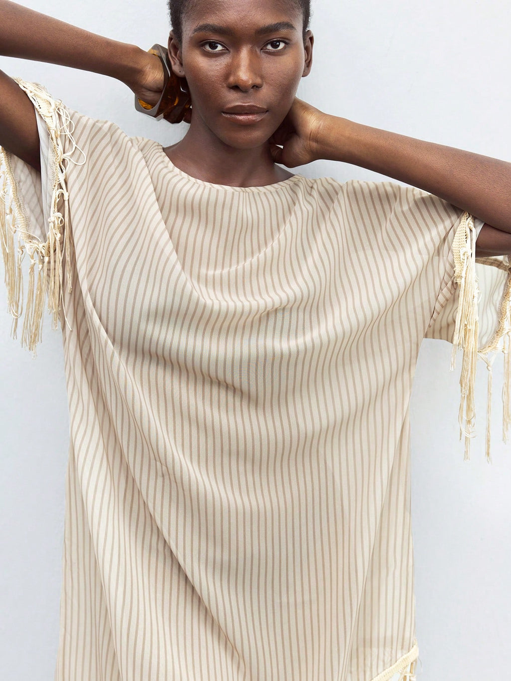 MiuVogue Women's Solid Color Short Sleeve Tassel Smock, Fashionable For Summer
