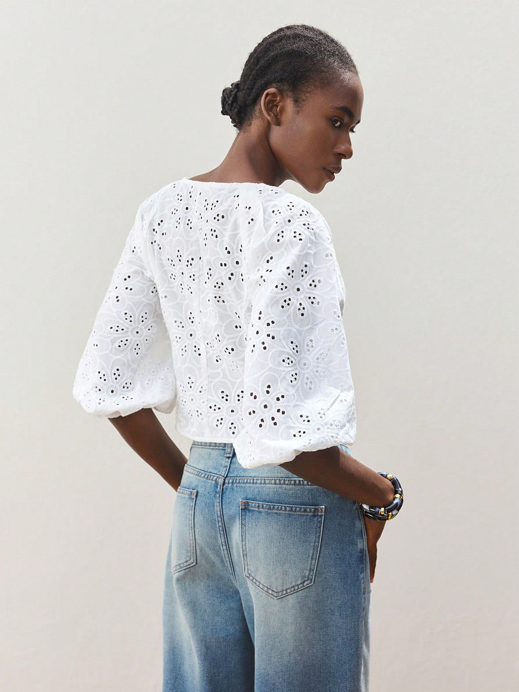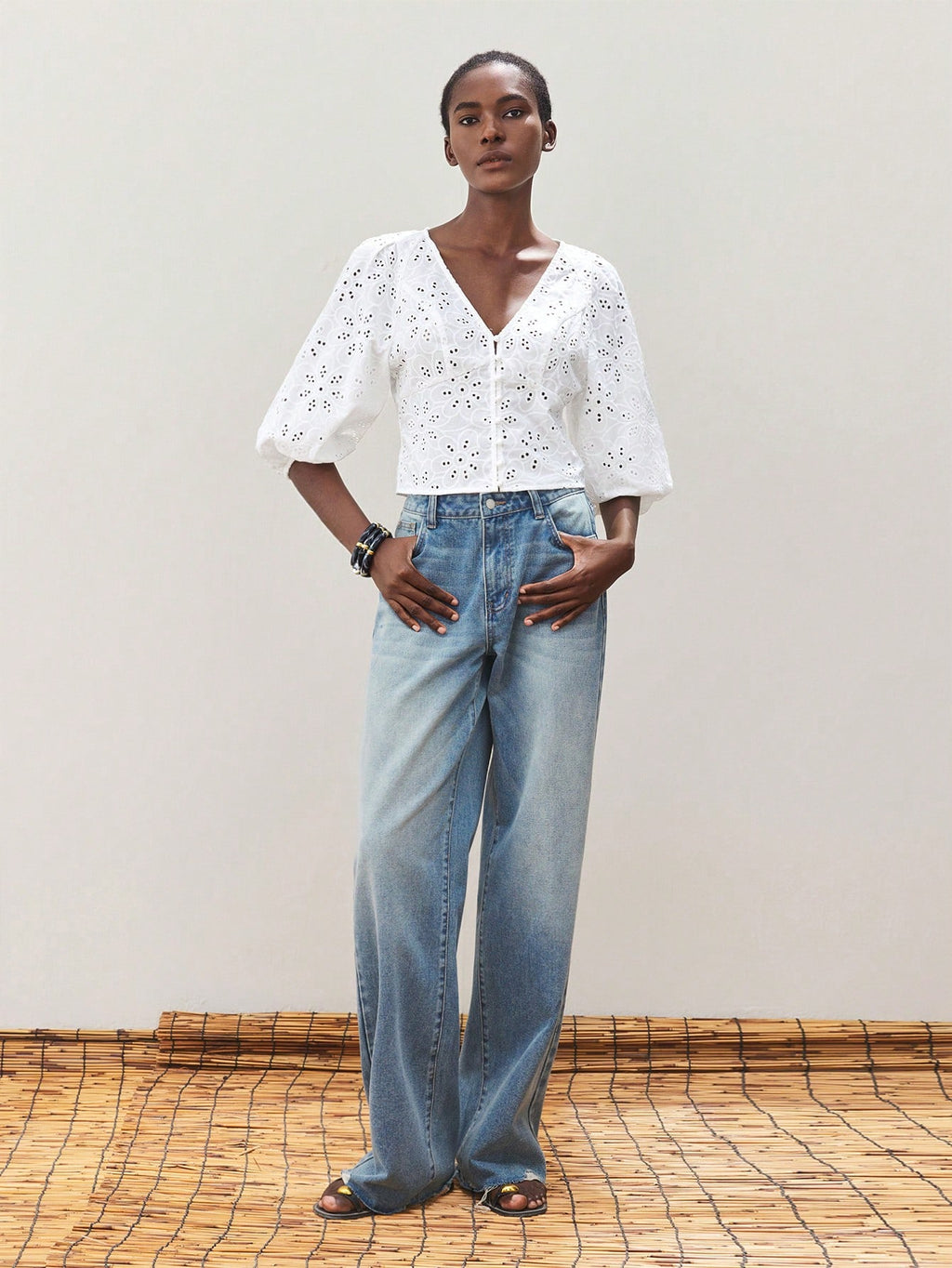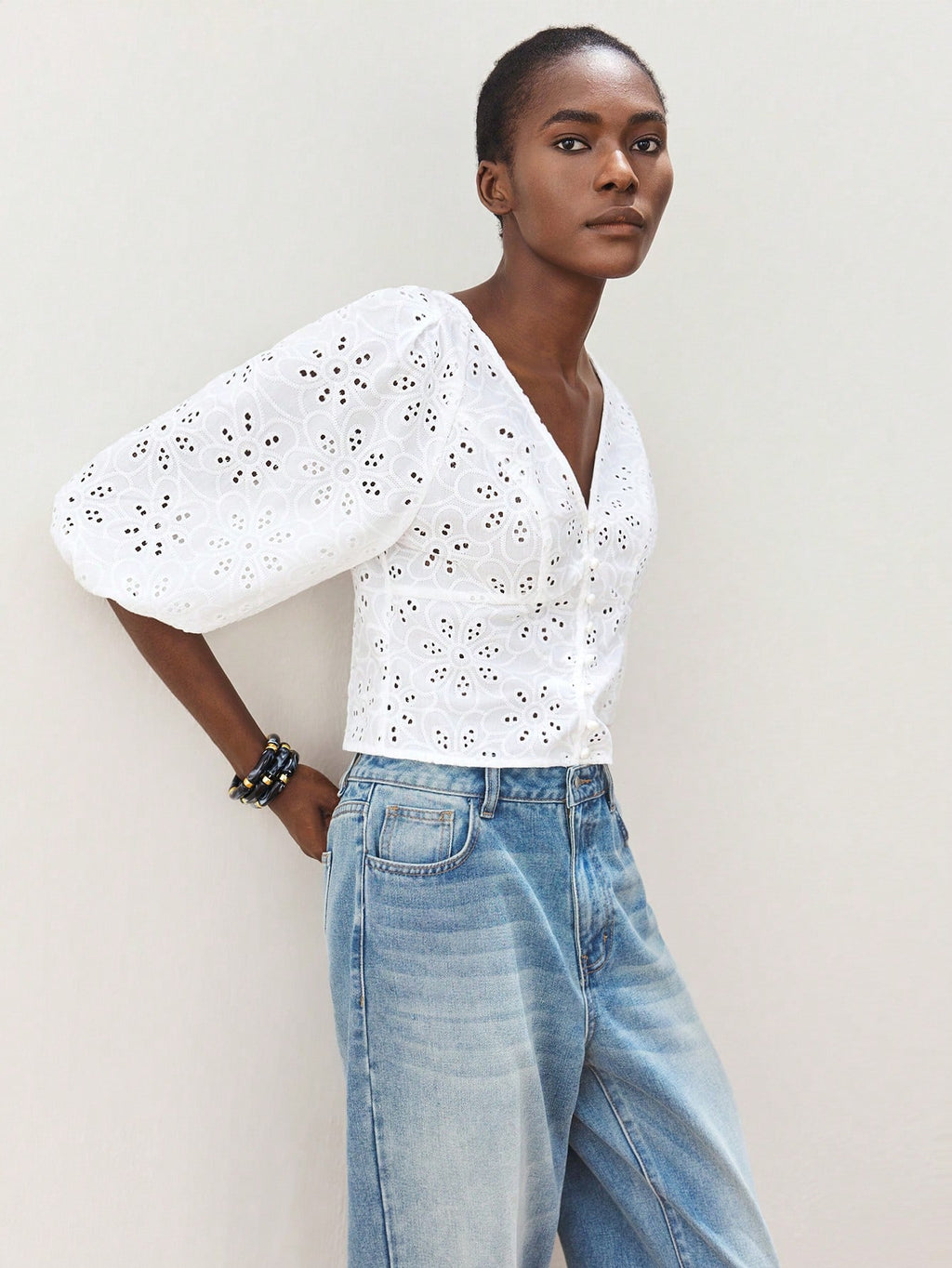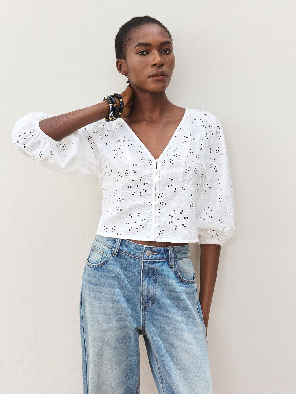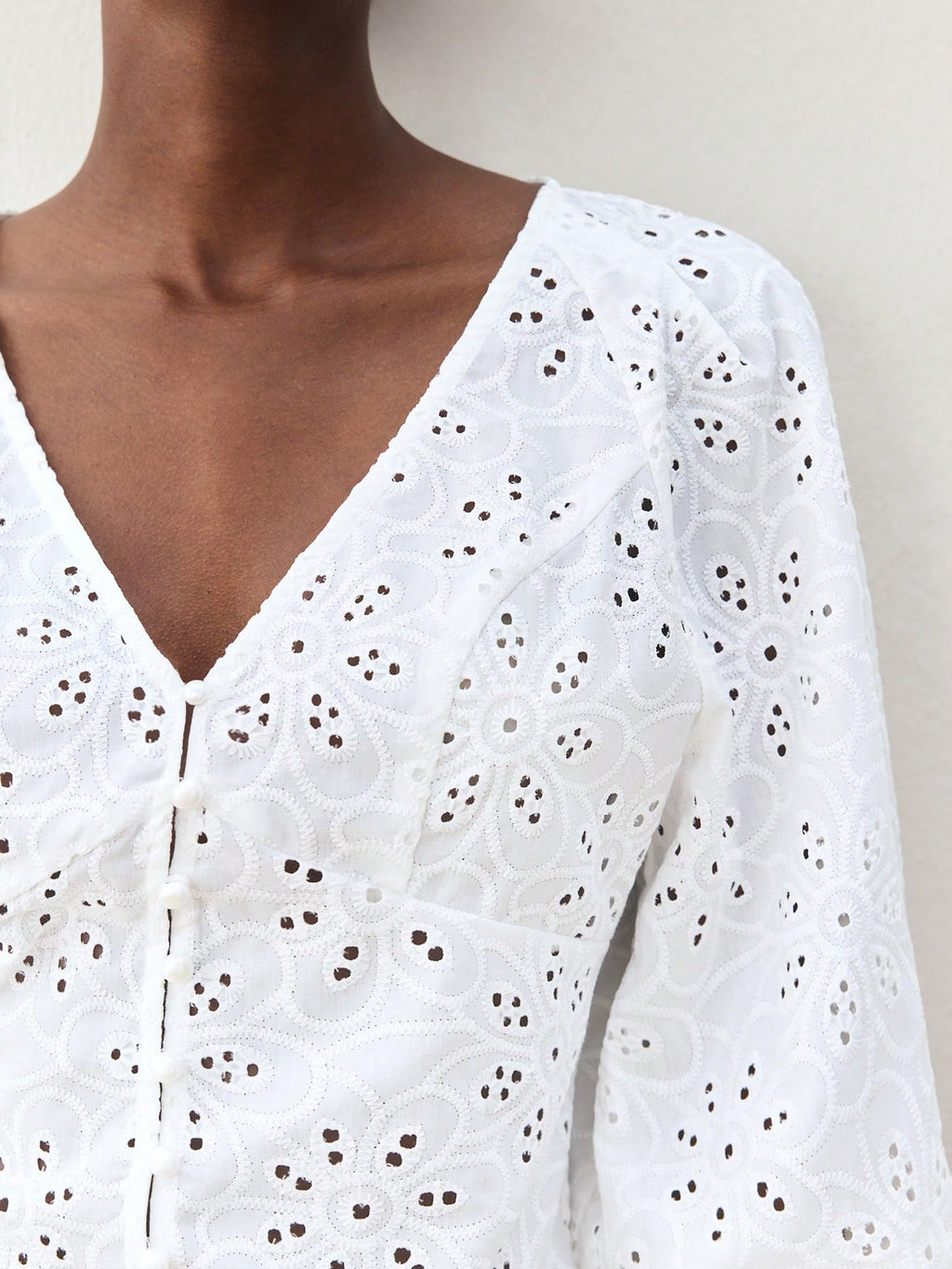 MiuVogue Women's White Summer Wear V-Neck Front Button Closure Casual Beach Holiday Style Cutwork Embroidery Hollow Out Lantern Sleeve Fitted Beach Hawaiian Style Shirt Blouse