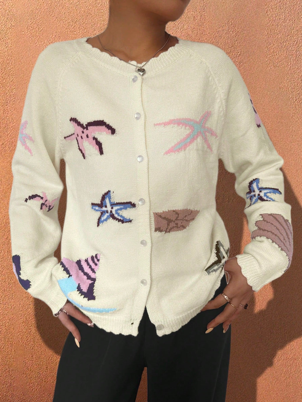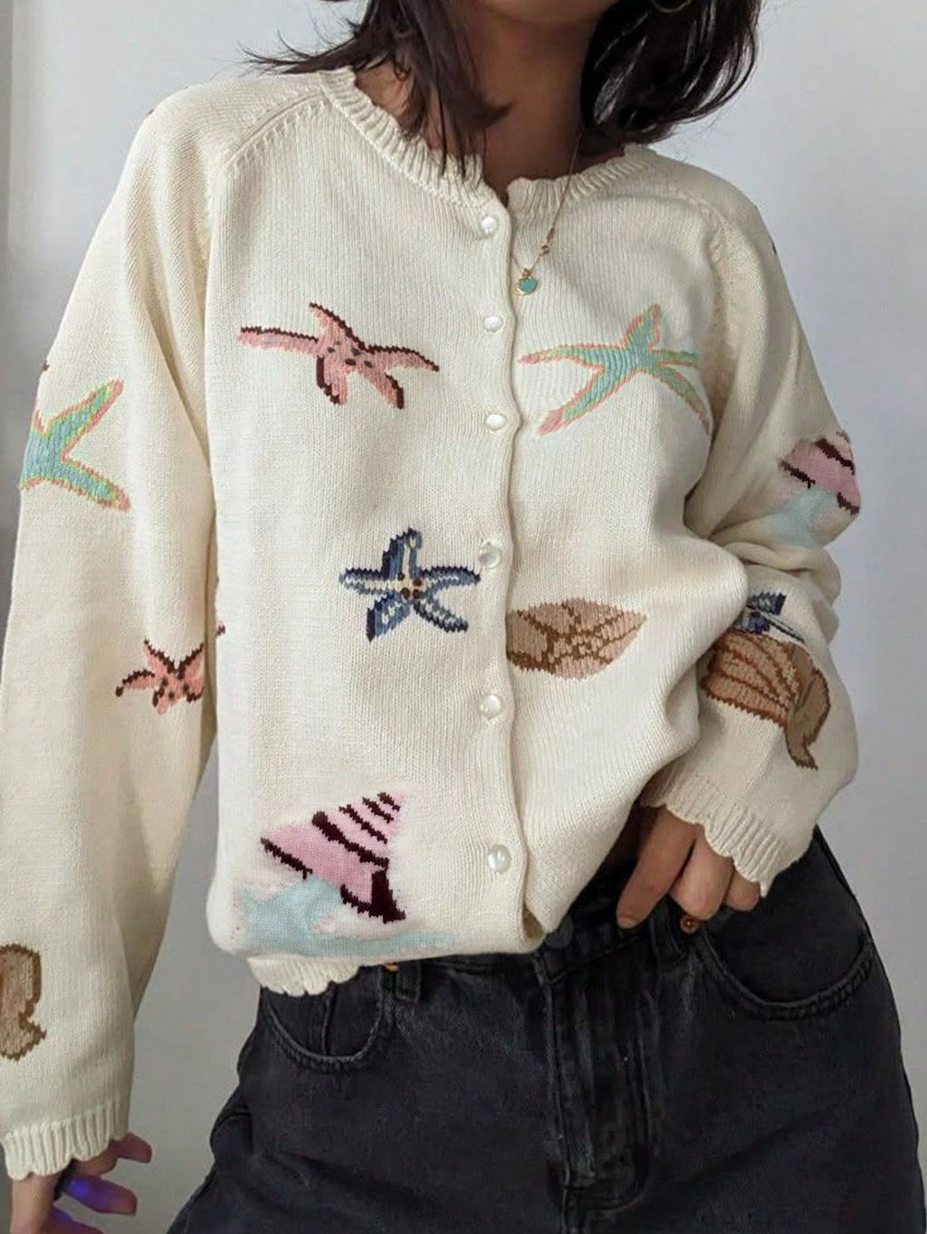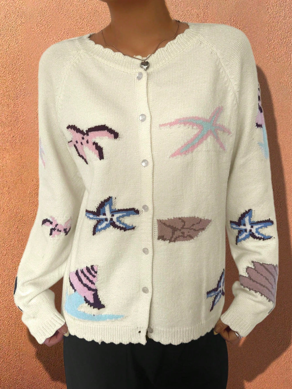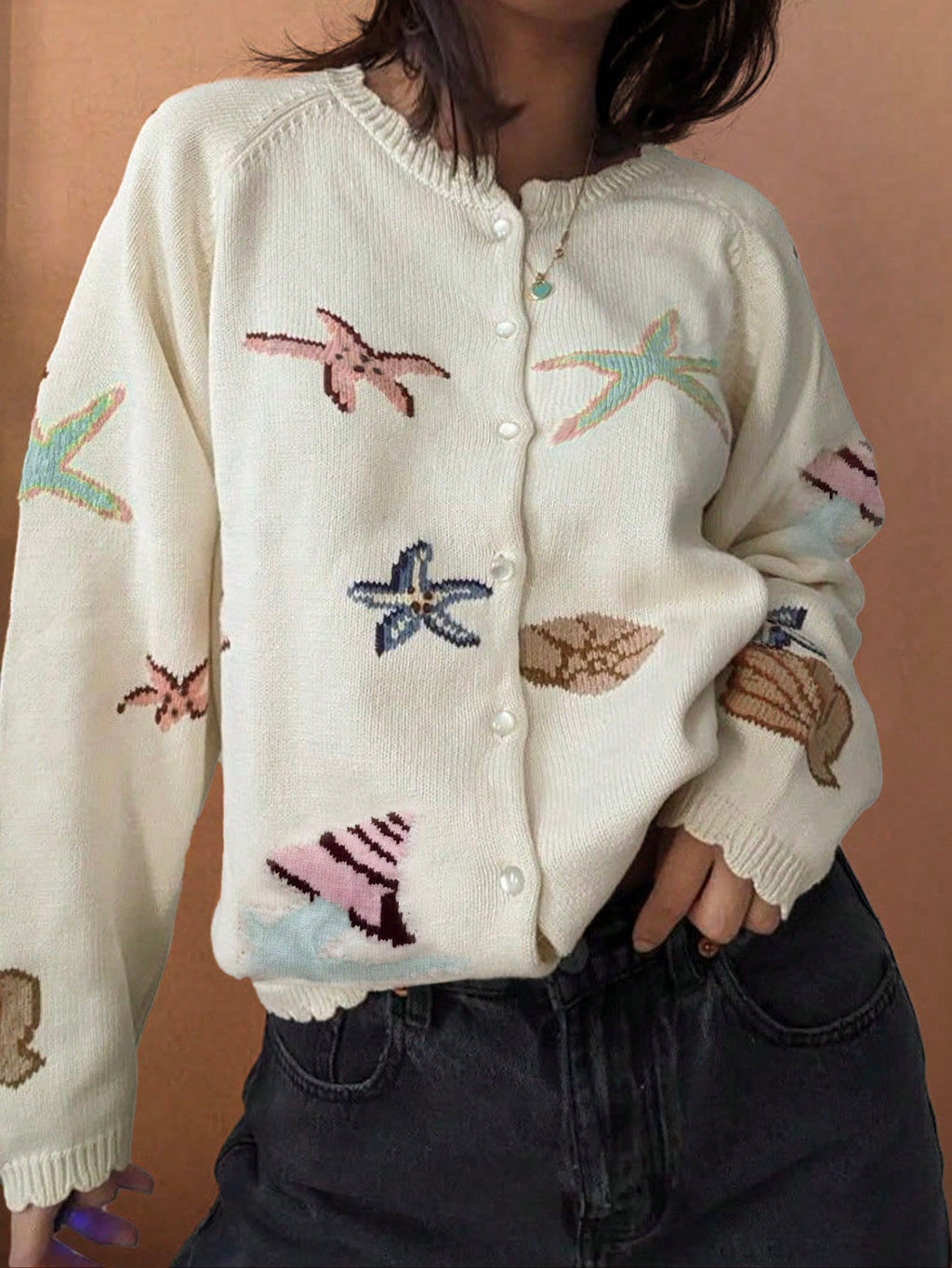 Sea Starshine Autumn And Winter Fashion Casual Vacation Women's Starfish Conch Ocean Elements Pattern Printed Long Sleeve Sweater Cardigan Fall Women Clothes Country Concert Outfit