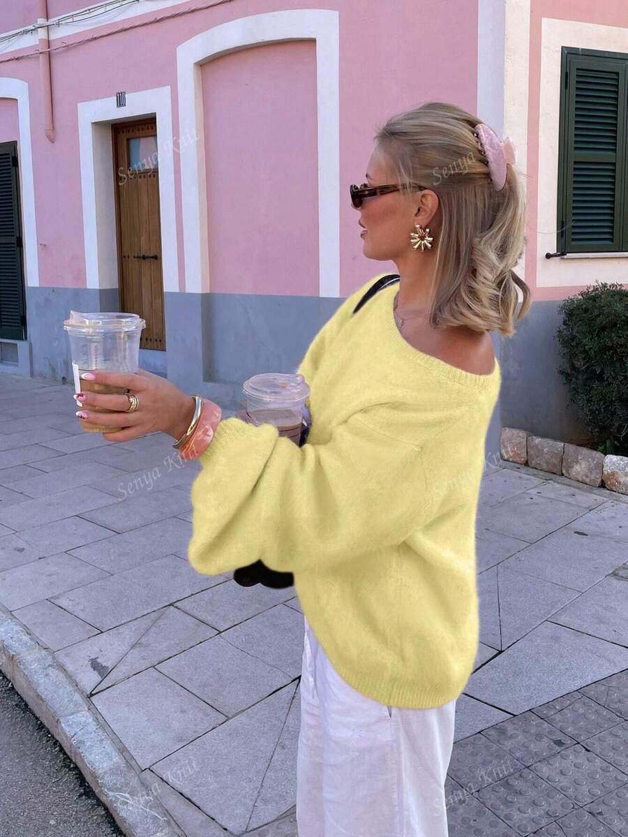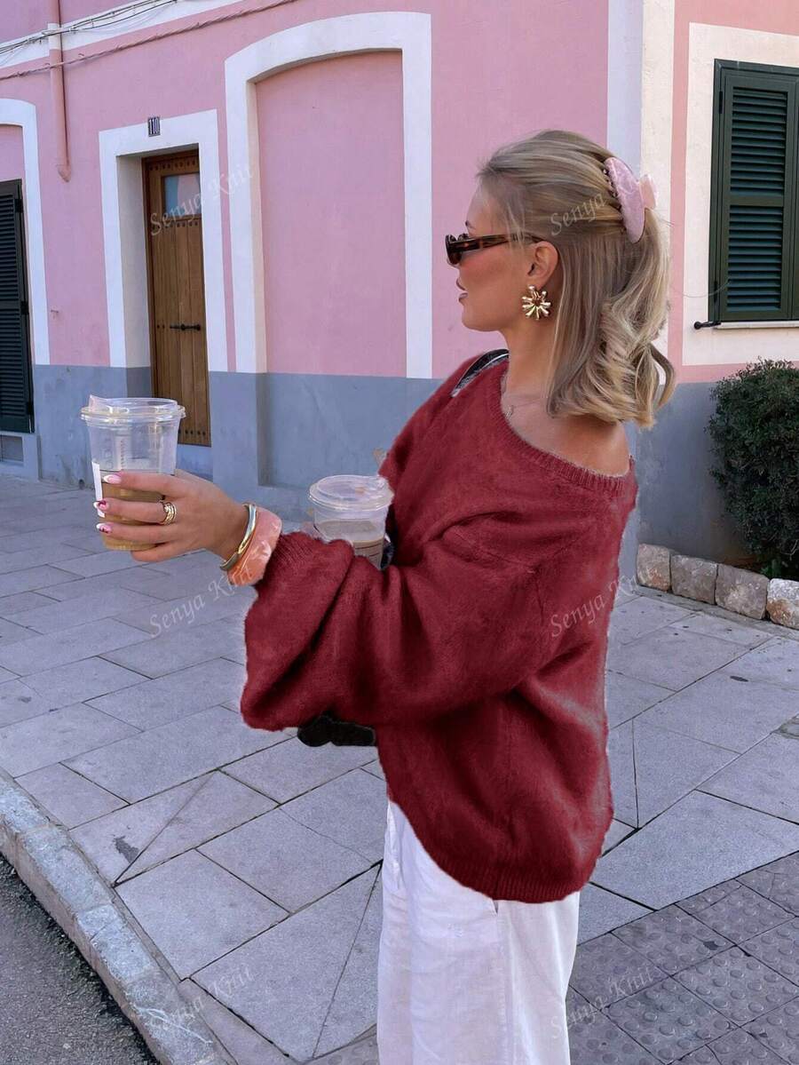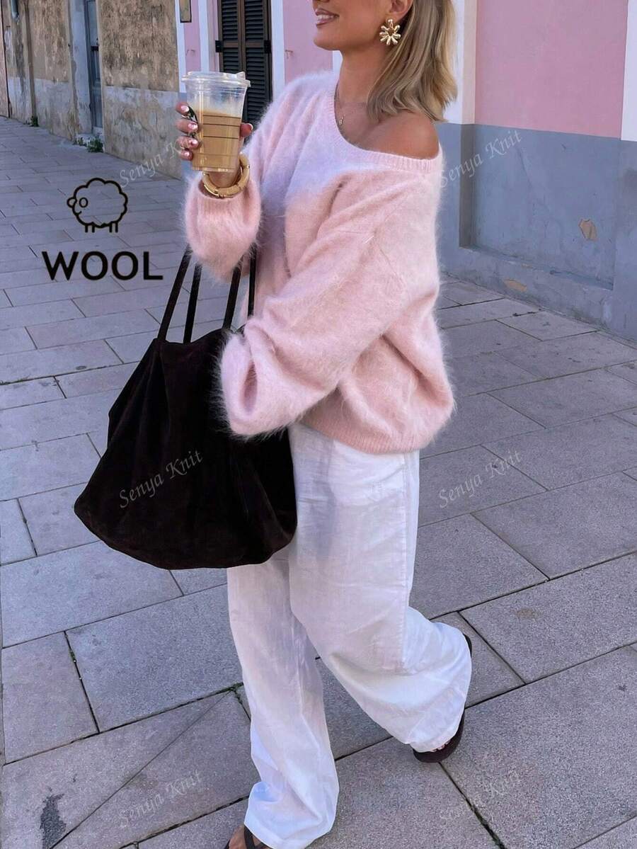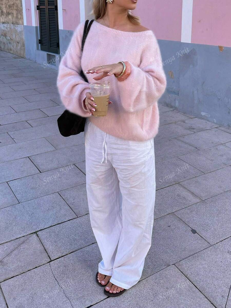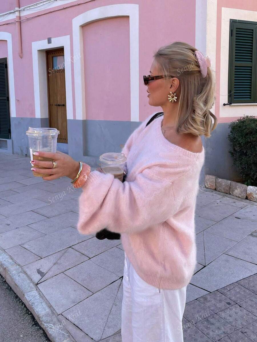 Senya Women's New Casual Solid Slouchy Shoulder Long SLeeve Sweater,Romantic Pink,Ultra Loose Knit Tops