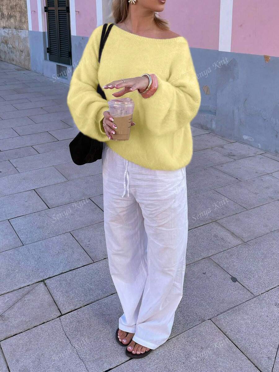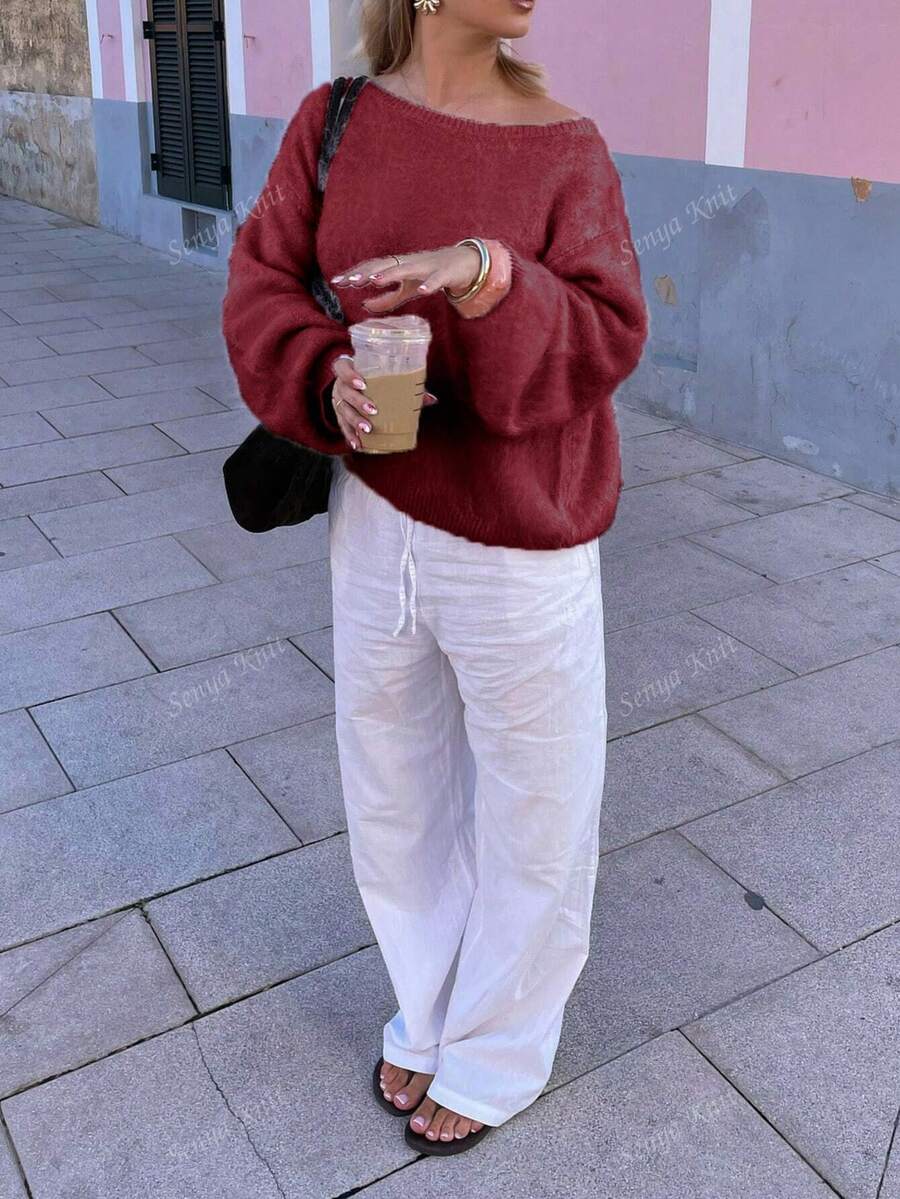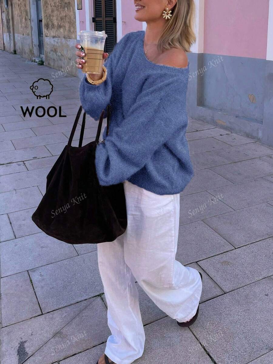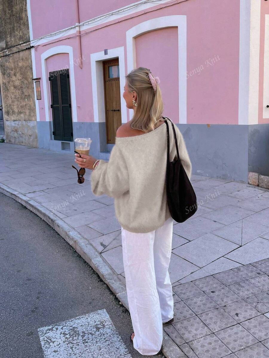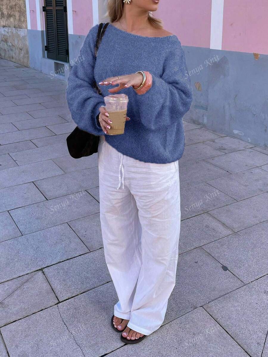 Senya Women's New Casual Solid Slouchy Shoulder Long SLeeve Sweater,Romantic Pink,Ultra Loose Knit Tops