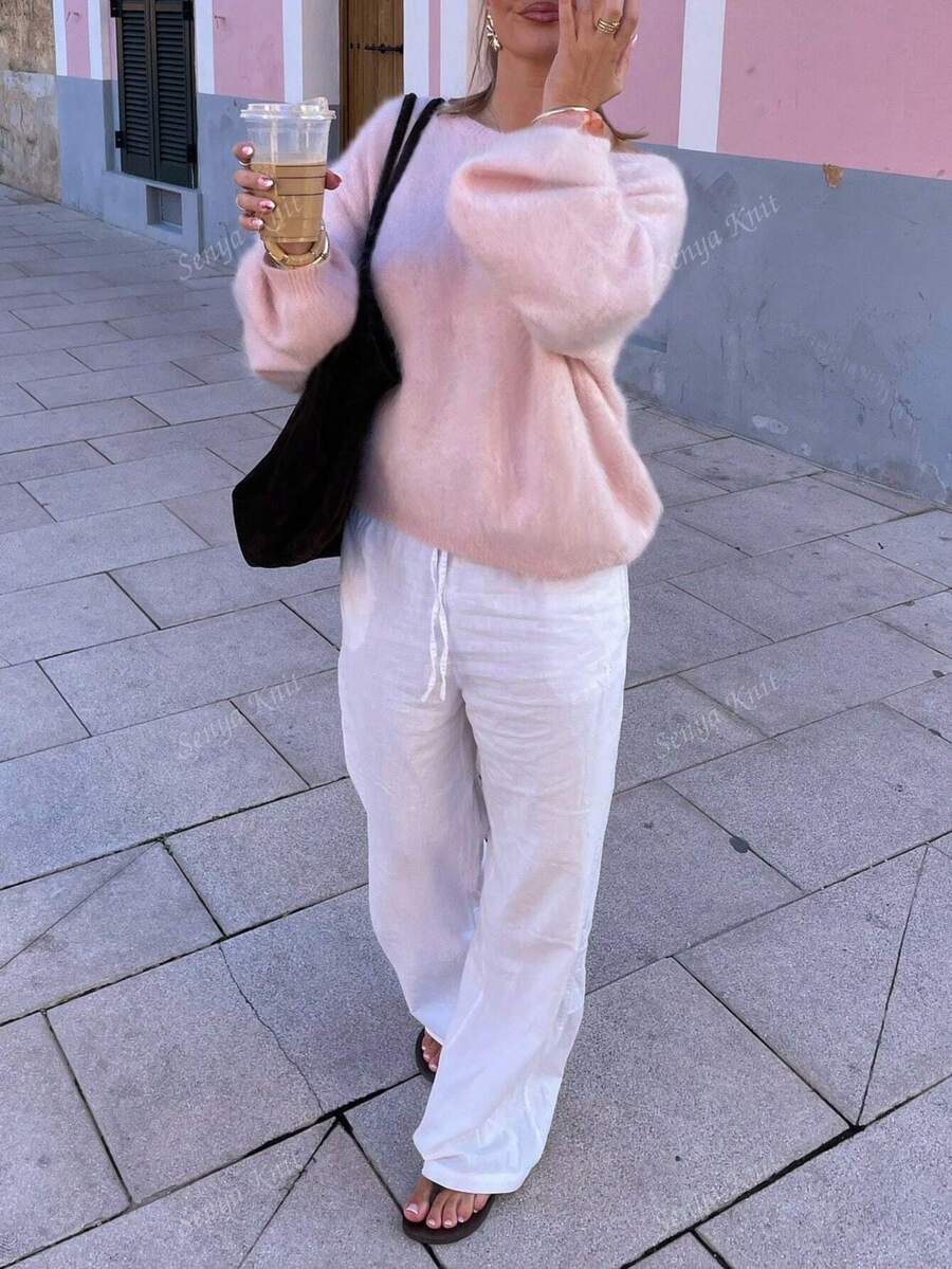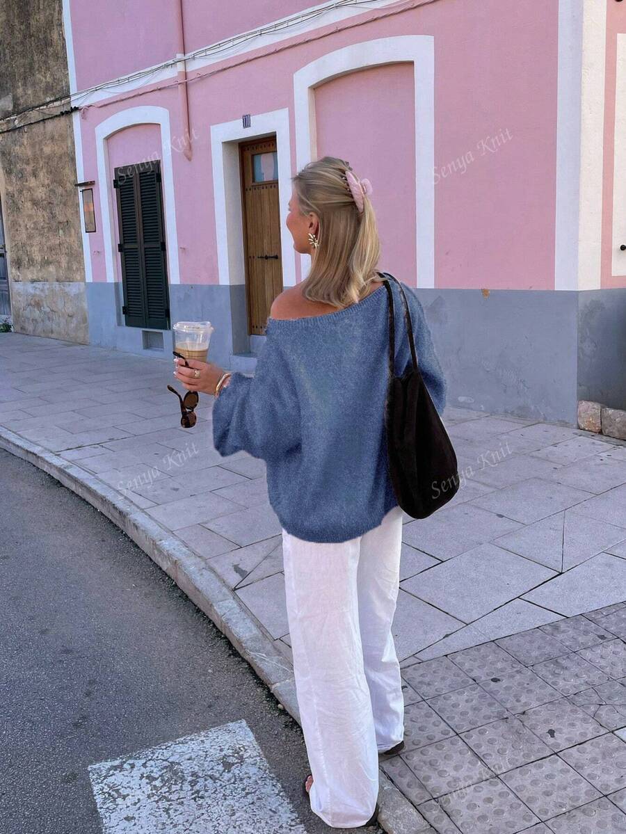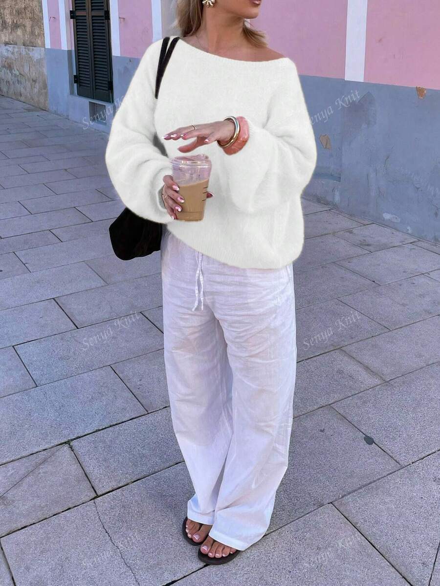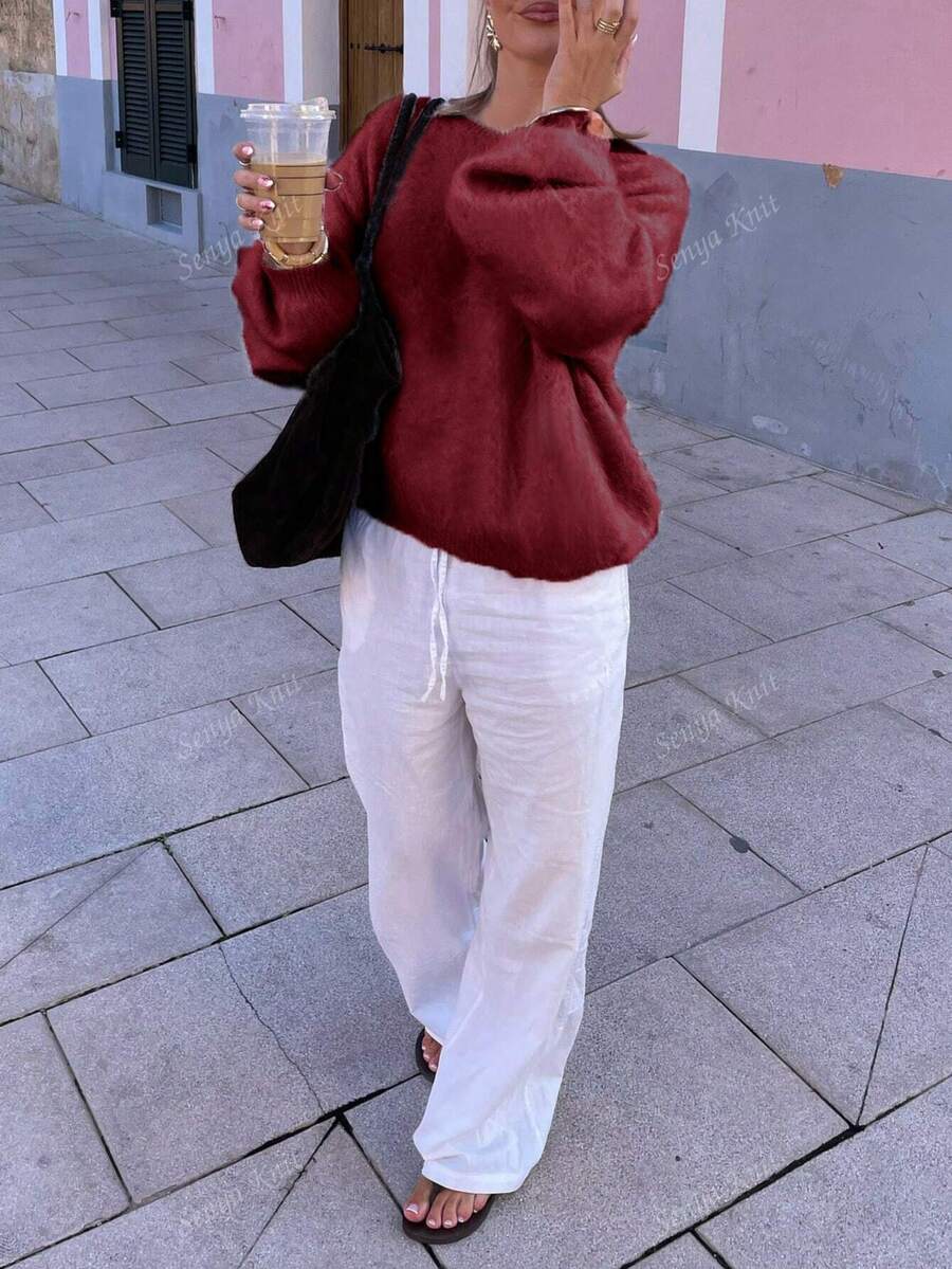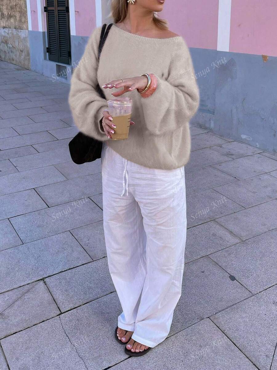 Senya Women's New Casual Solid Slouchy Shoulder Long SLeeve Sweater,Romantic Pink,Ultra Loose Knit Tops