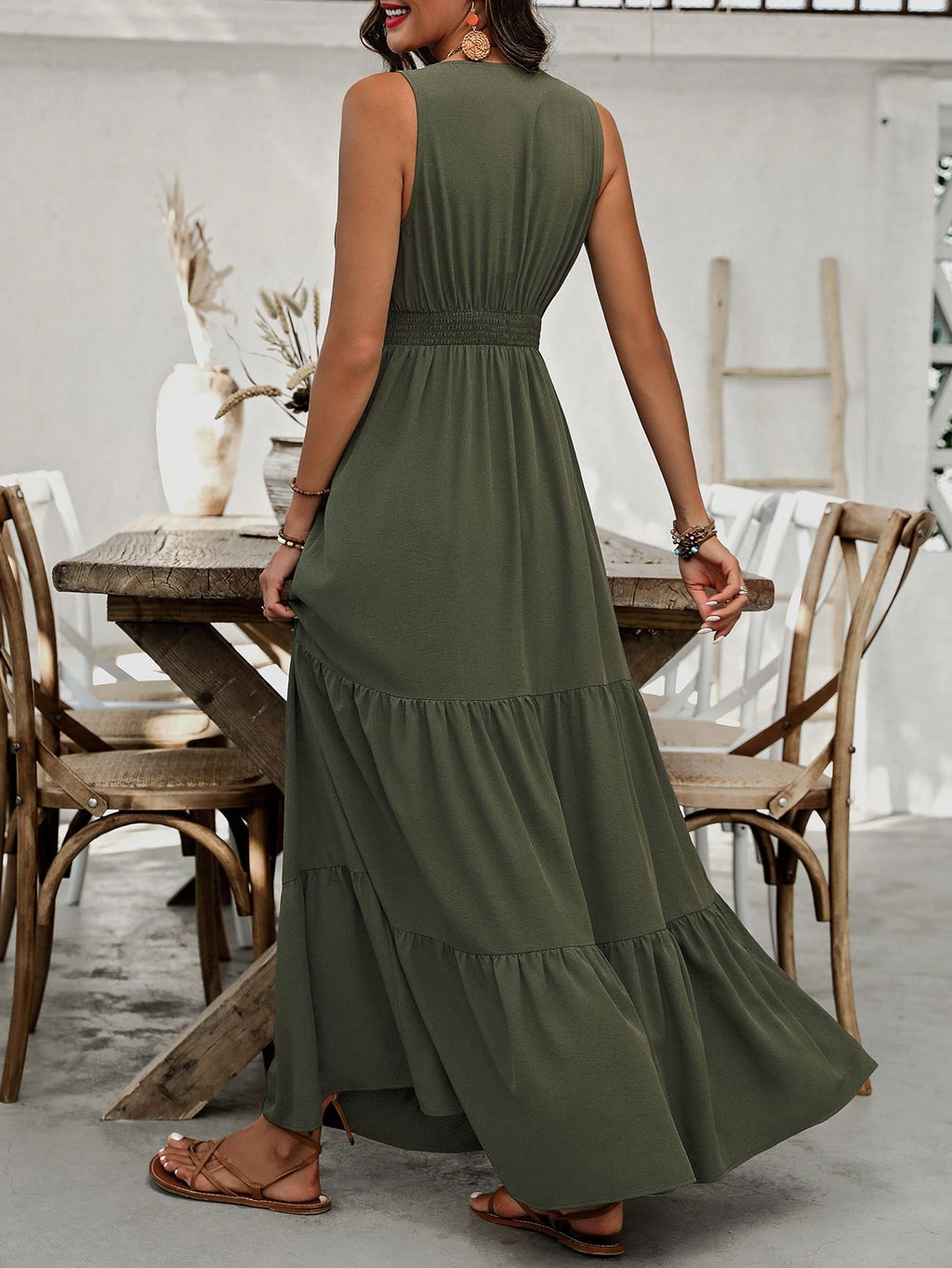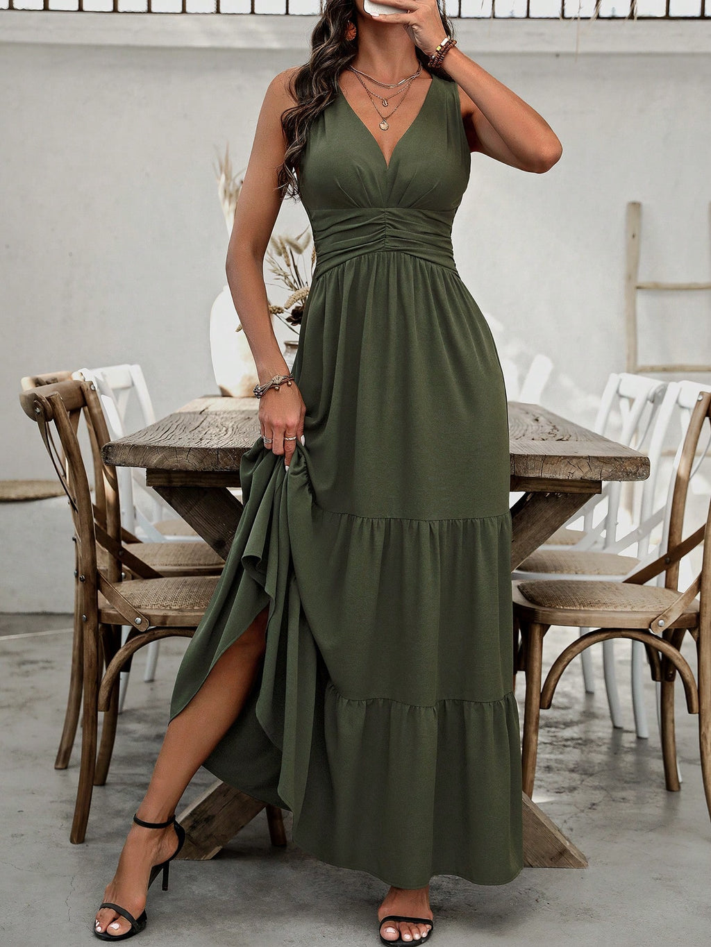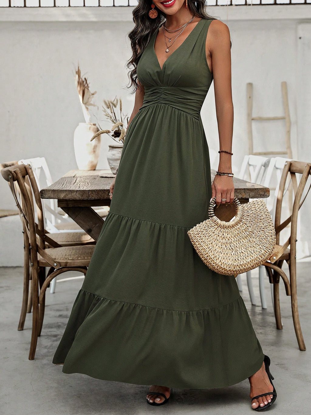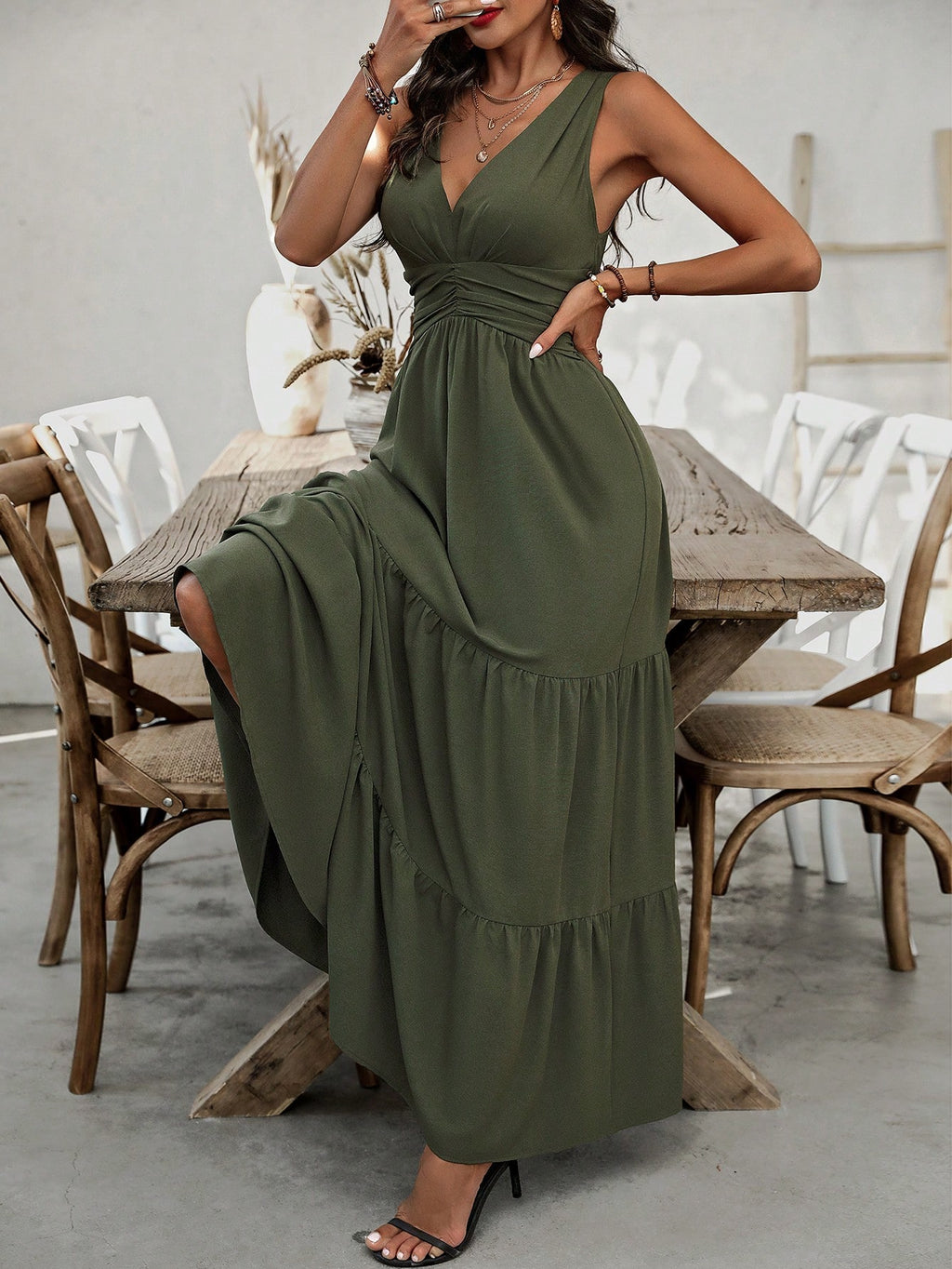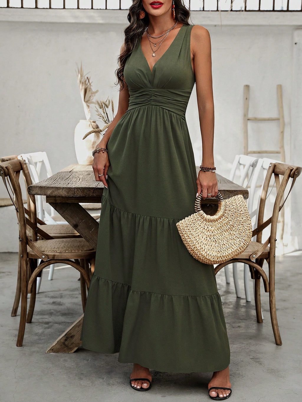 BELLAVOG Clasi Women's Solid Color V-Neck Pleated Waist Dress Maxi Women Outfit