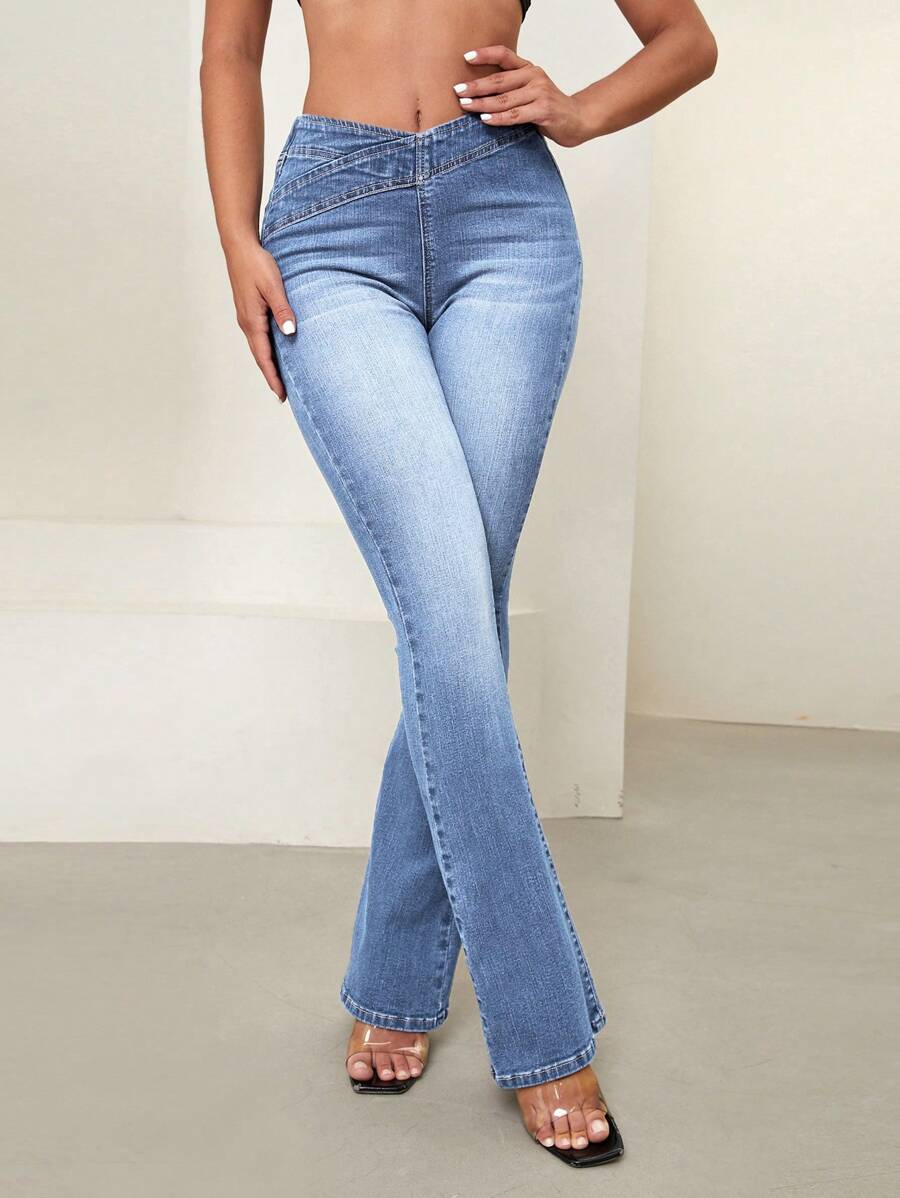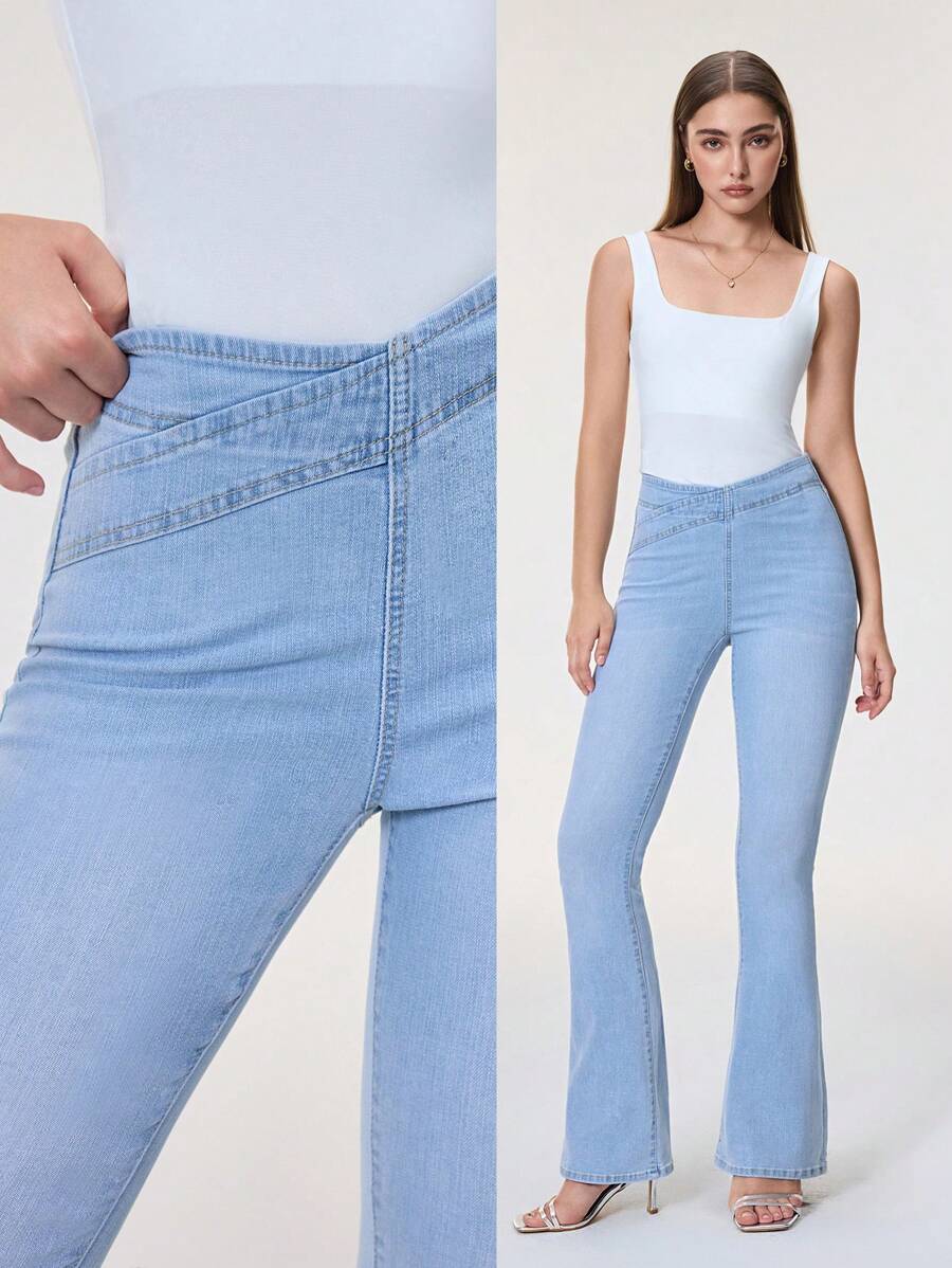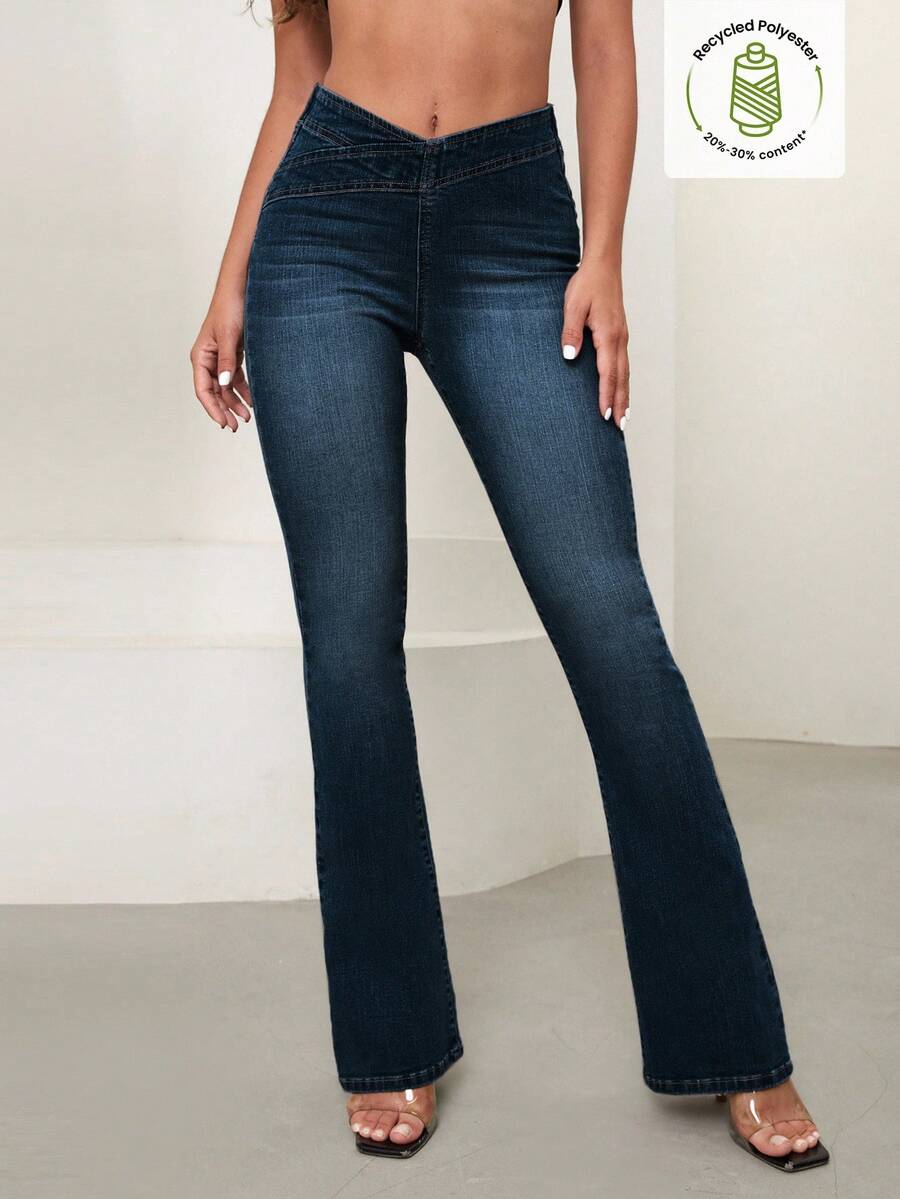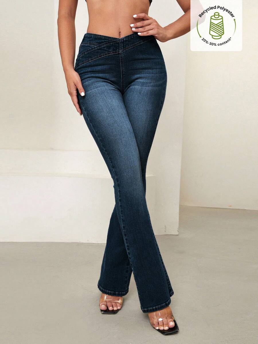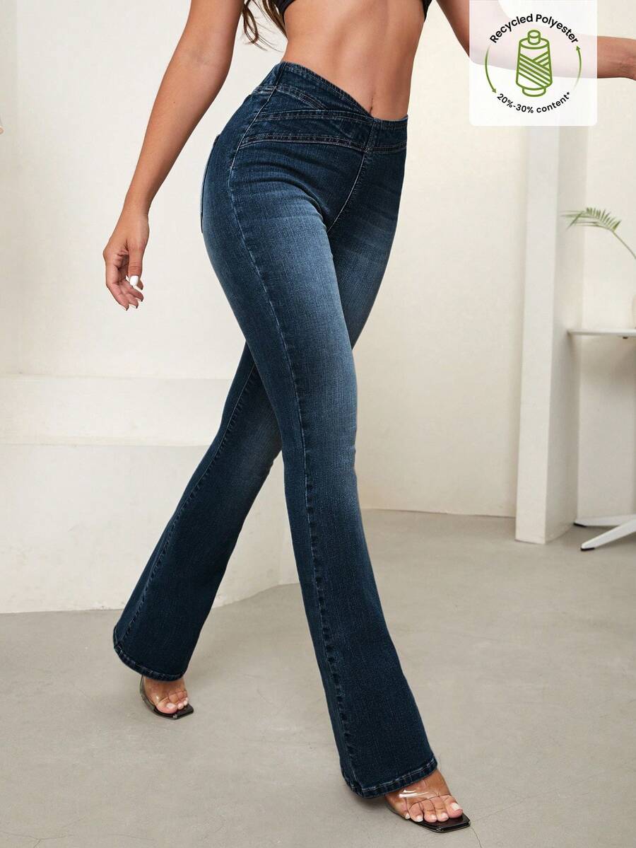 SHEIN Essnce Overlap Waist Bootcut Leg Jeans,Ladies Elegant Pocket Natural Flare Leg Long Dark Wash Cotton Regular Fit Women Jeans,Spring/Fall,Casual Daily Wear
