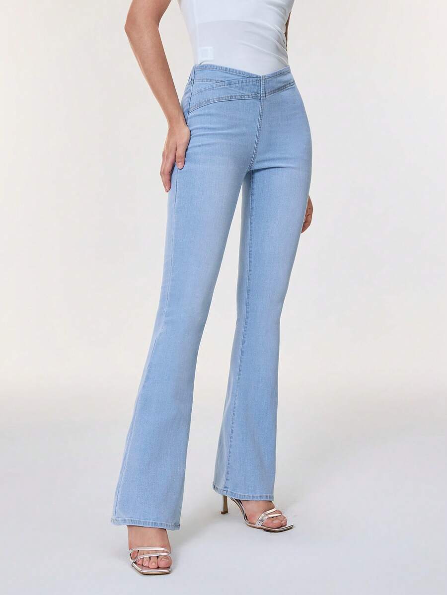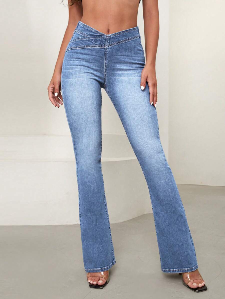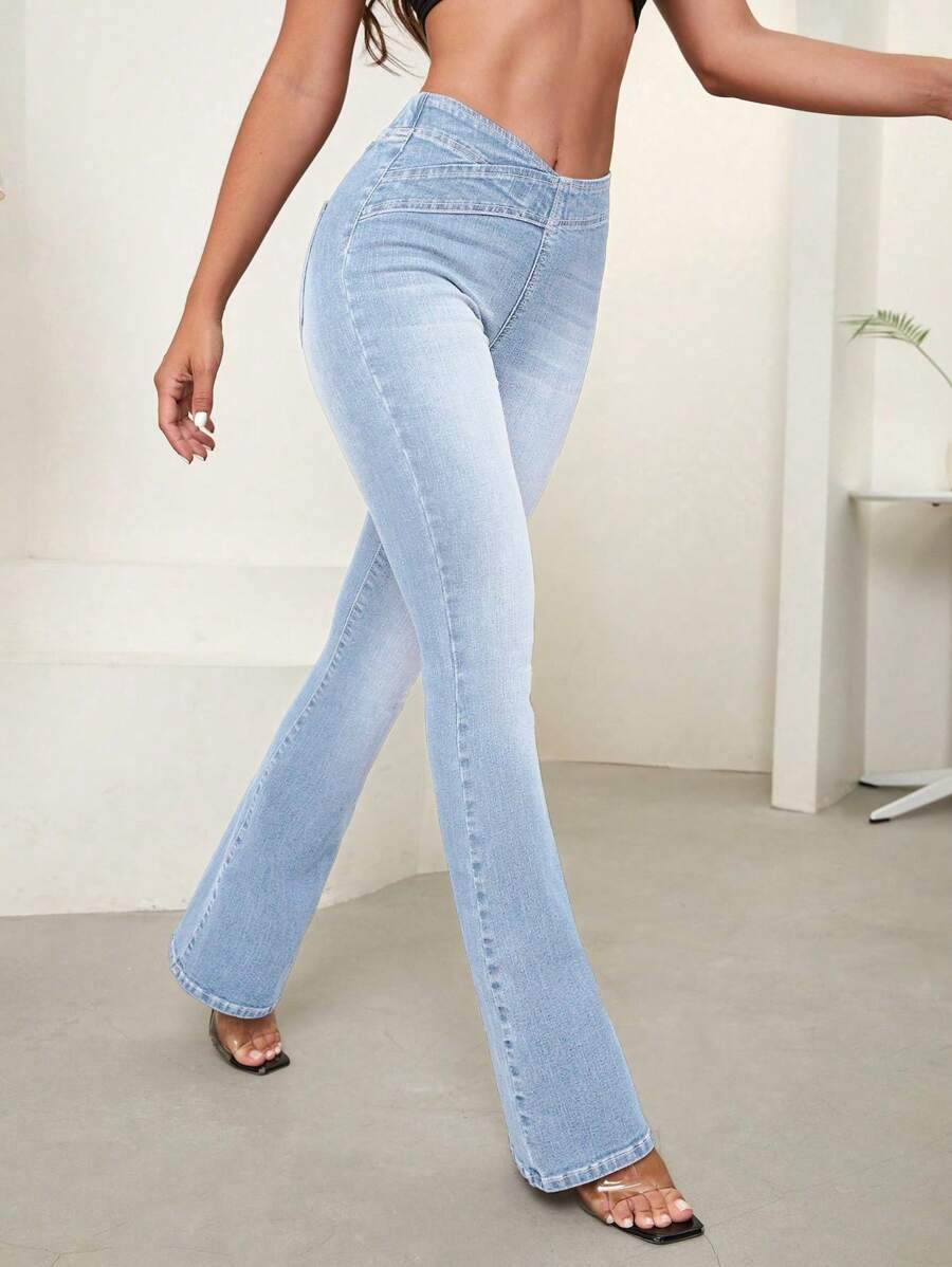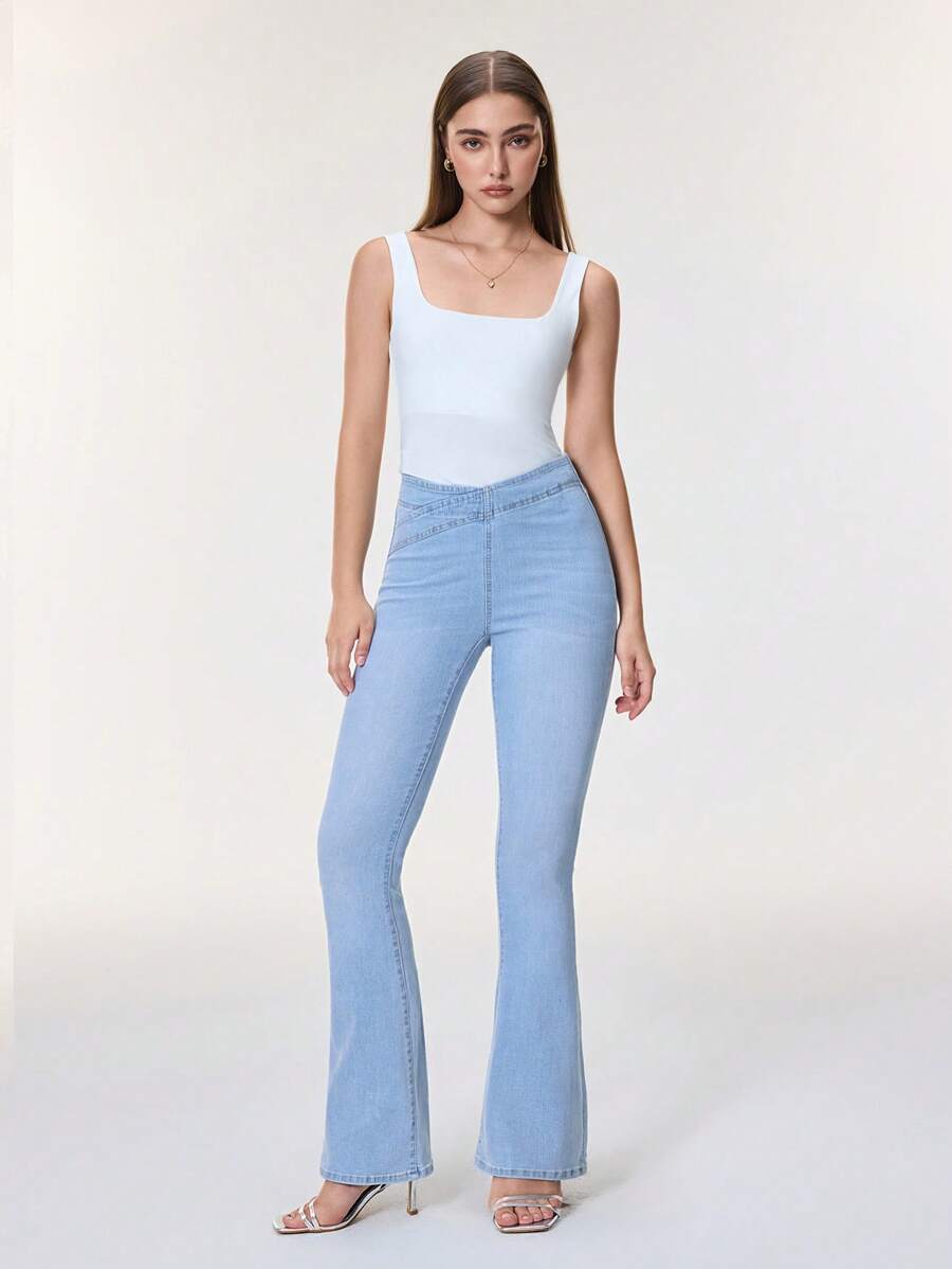 SHEIN Essnce Overlap Waist Bootcut Leg Jeans,Ladies Elegant Pocket Natural Flare Leg Long Dark Wash Cotton Regular Fit Women Jeans,Spring/Fall,Casual Daily Wear