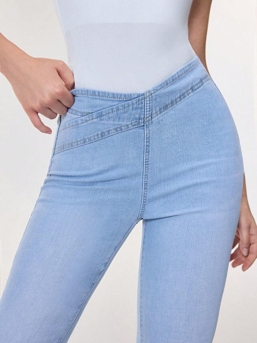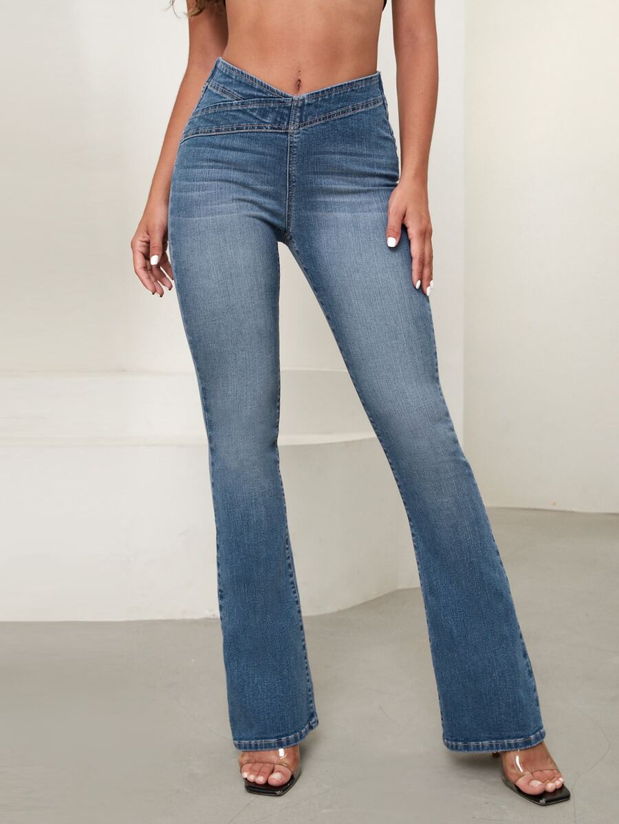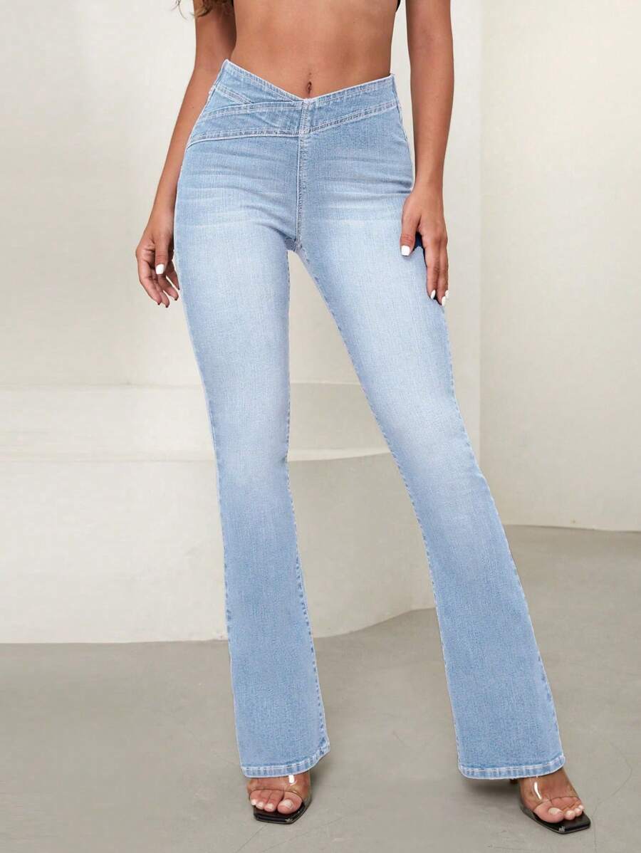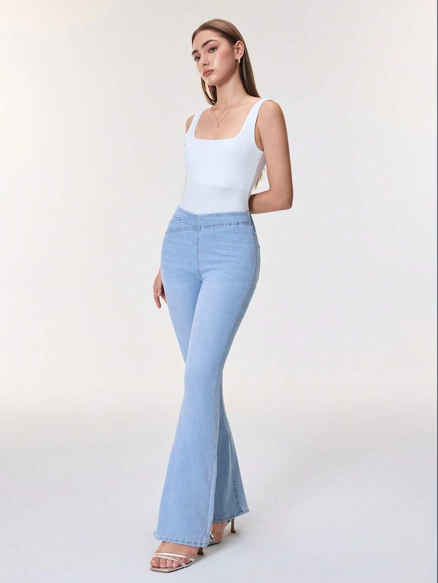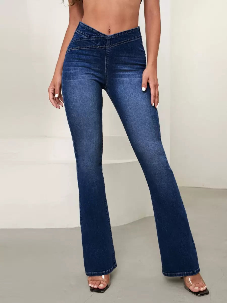 SHEIN Essnce Overlap Waist Bootcut Leg Jeans,Ladies Elegant Pocket Natural Flare Leg Long Dark Wash Cotton Regular Fit Women Jeans,Spring/Fall,Casual Daily Wear