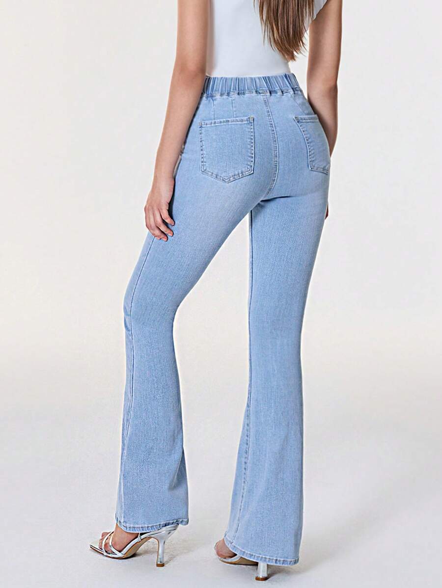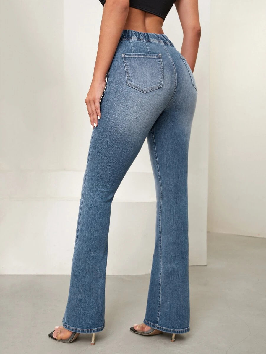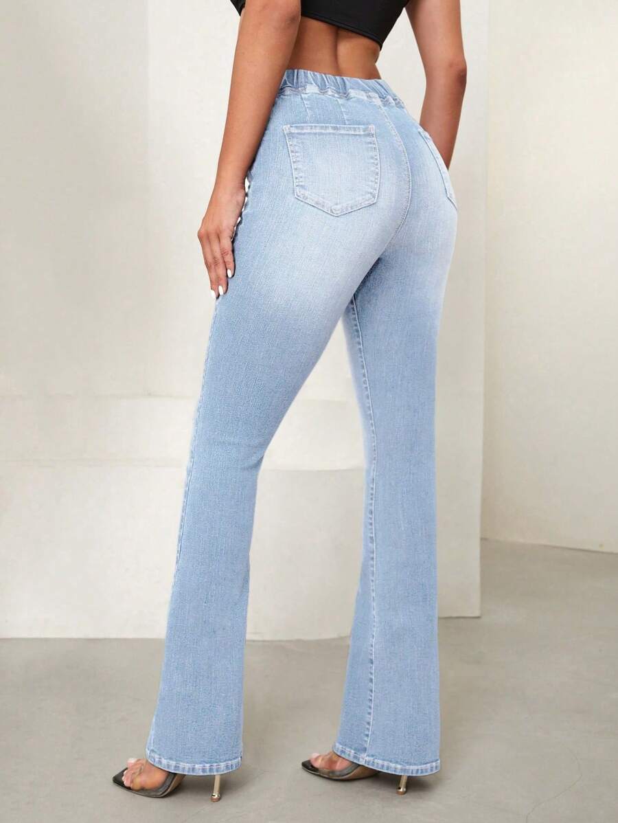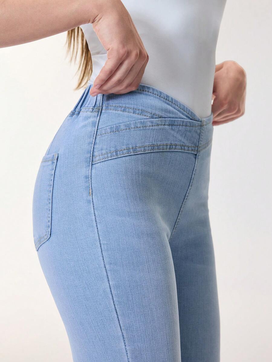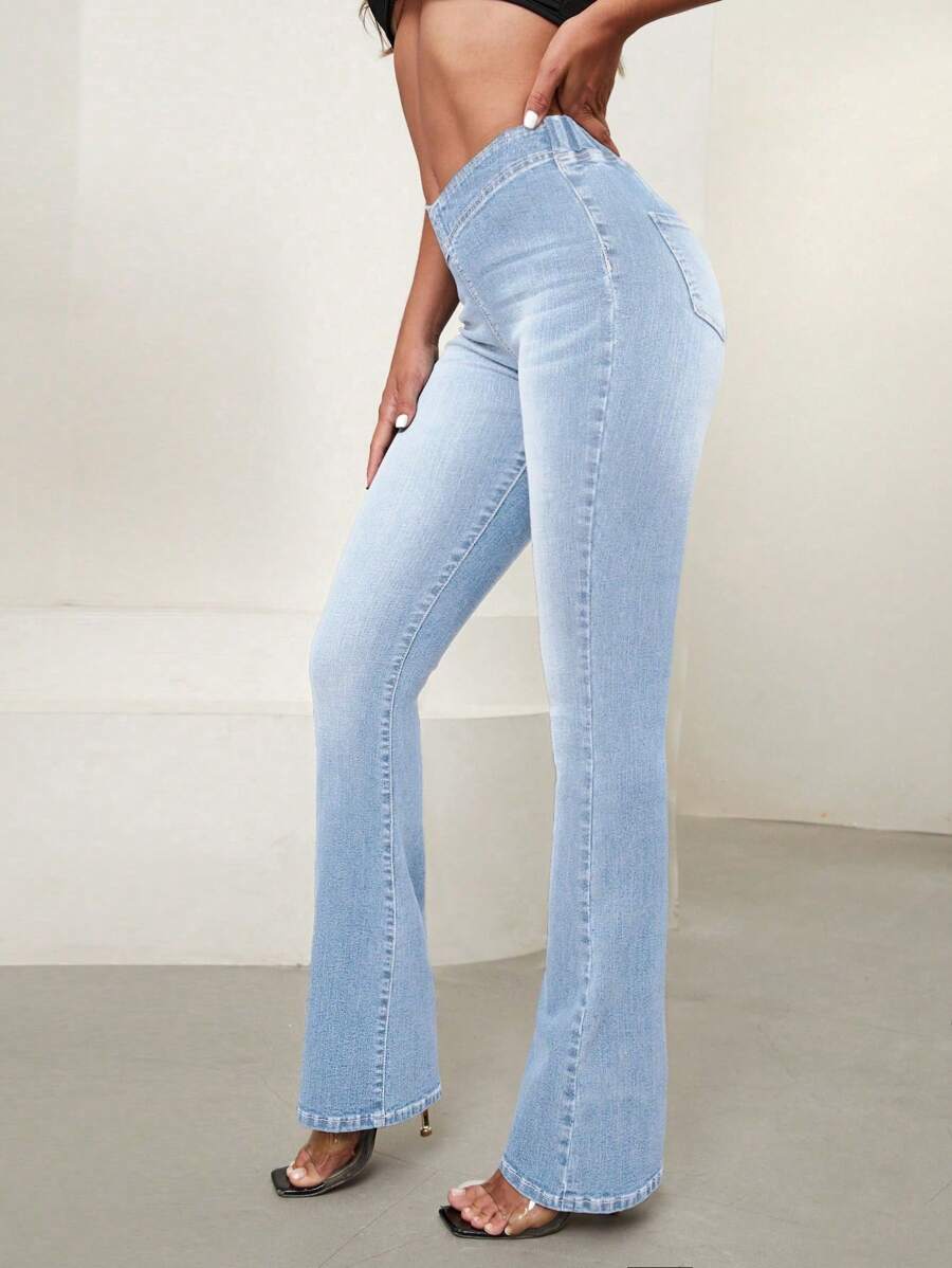 SHEIN Essnce Overlap Waist Bootcut Leg Jeans,Ladies Elegant Pocket Natural Flare Leg Long Dark Wash Cotton Regular Fit Women Jeans,Spring/Fall,Casual Daily Wear