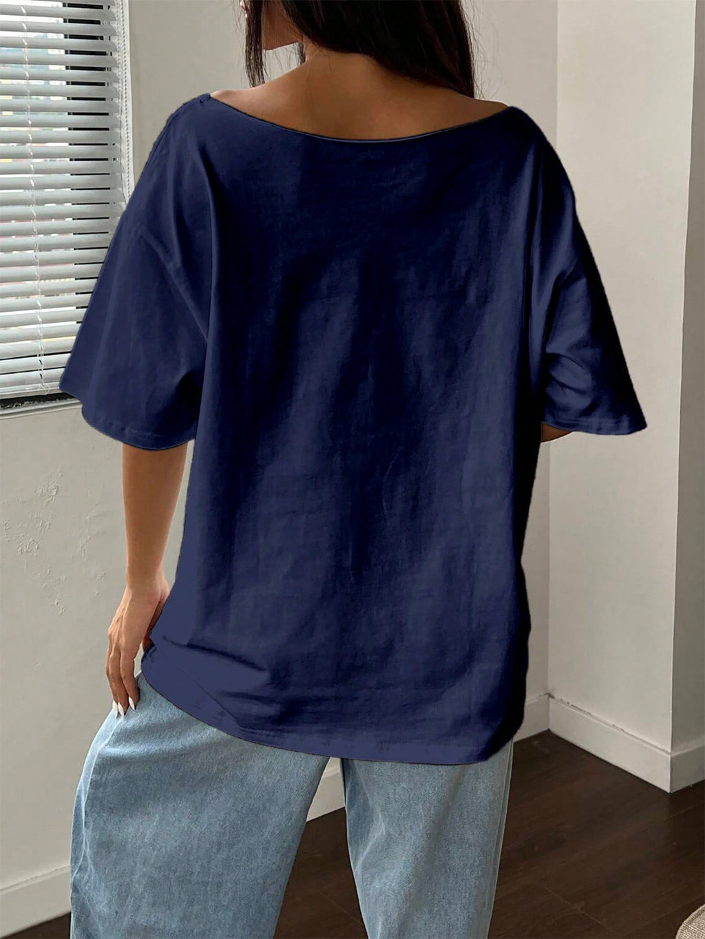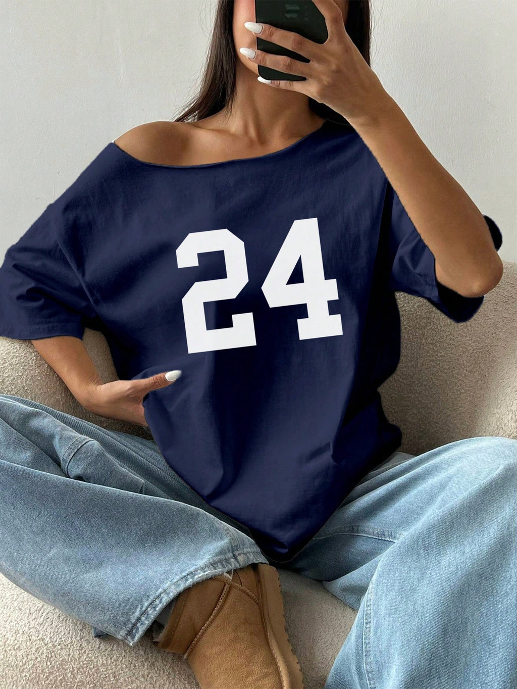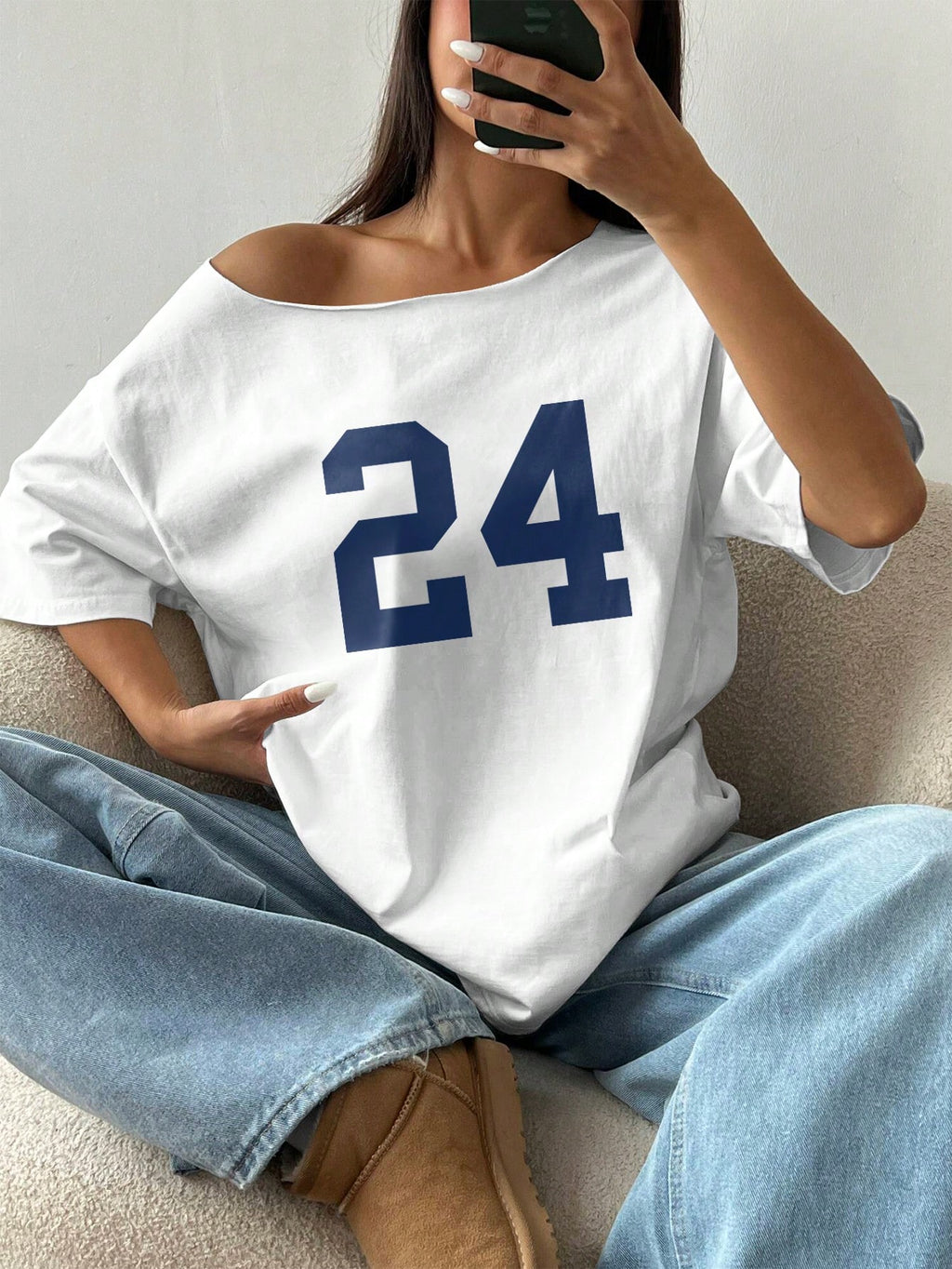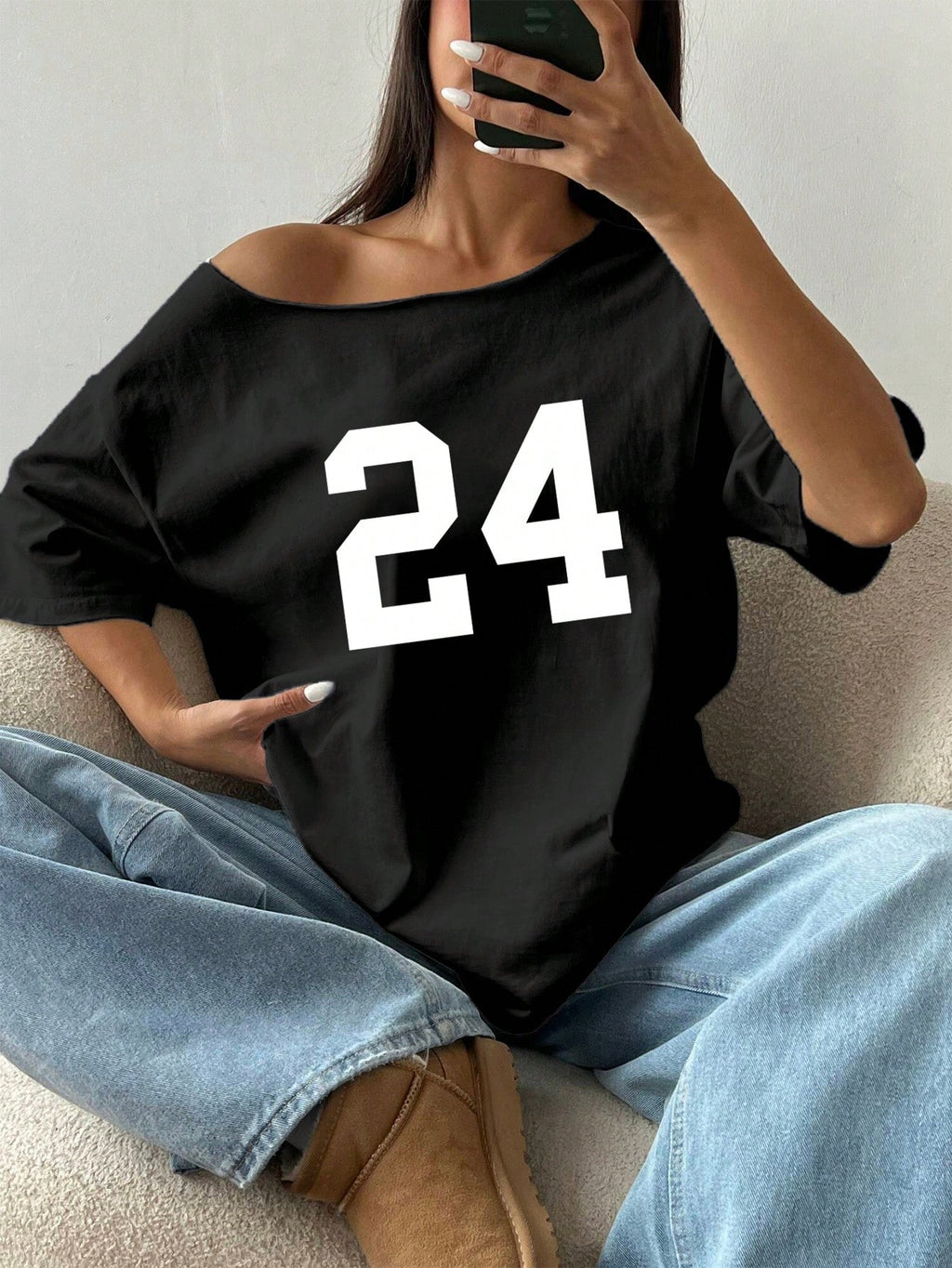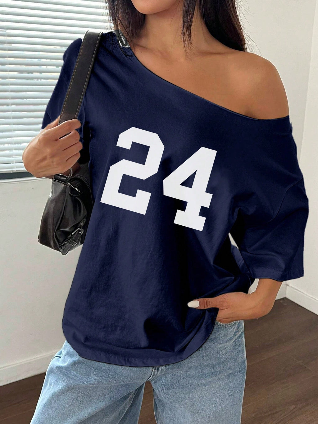 SHEIN MOOSTA 1pc Loose Off Shoulder T-Shirt With Digit 24 Slant Shoulder Oversized Graphic Tees Women Tops