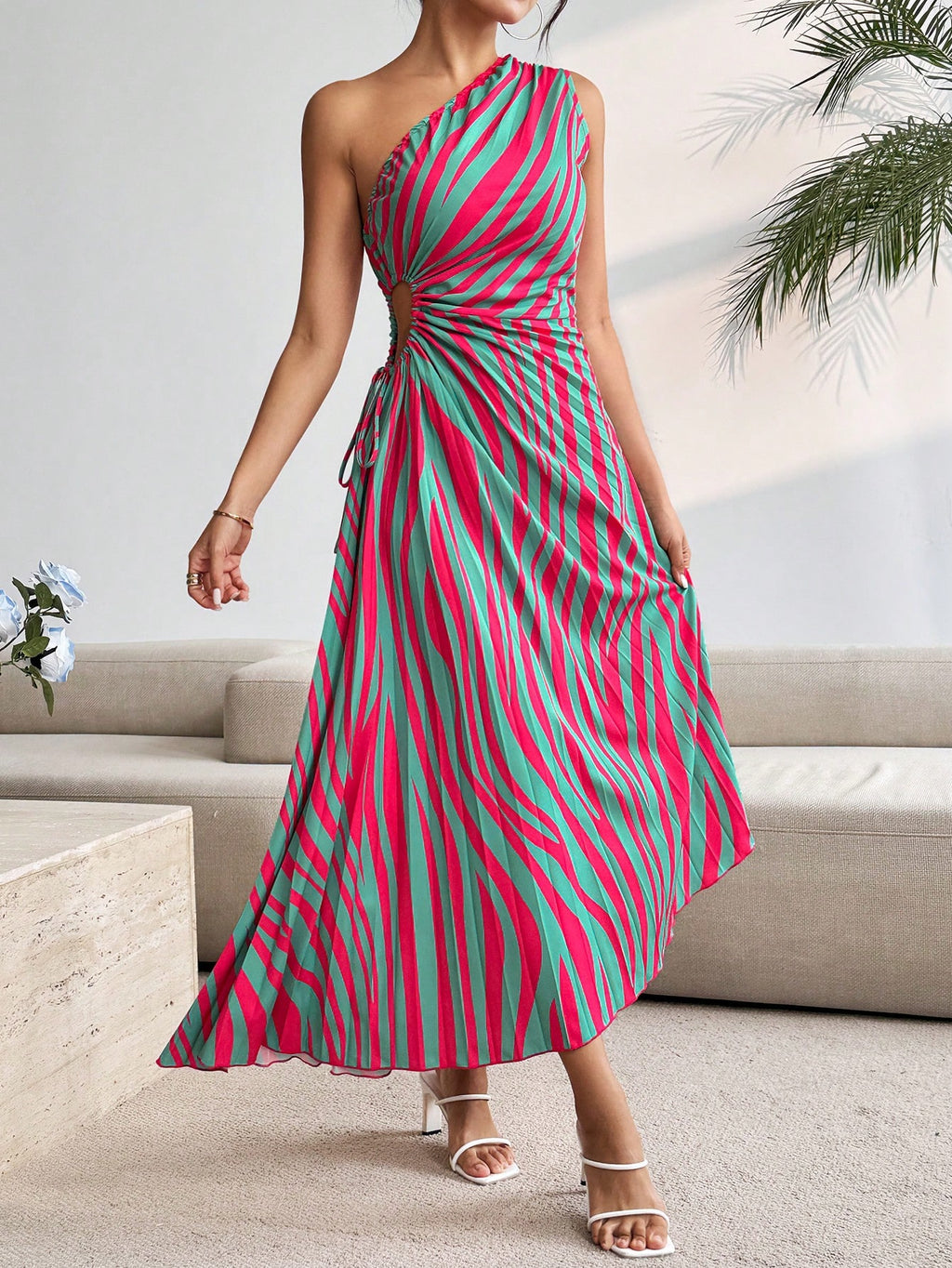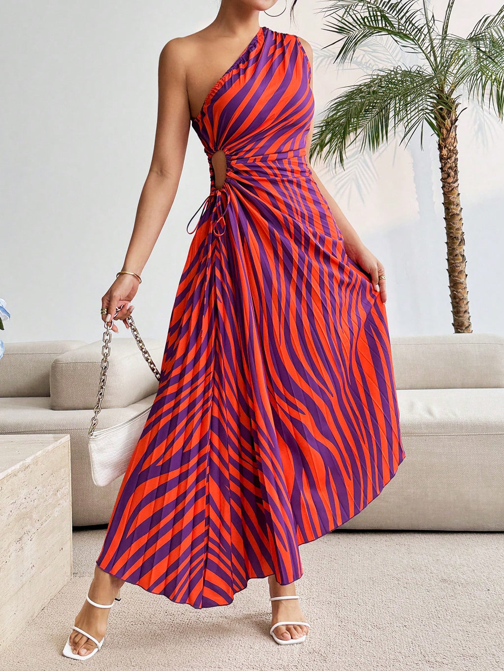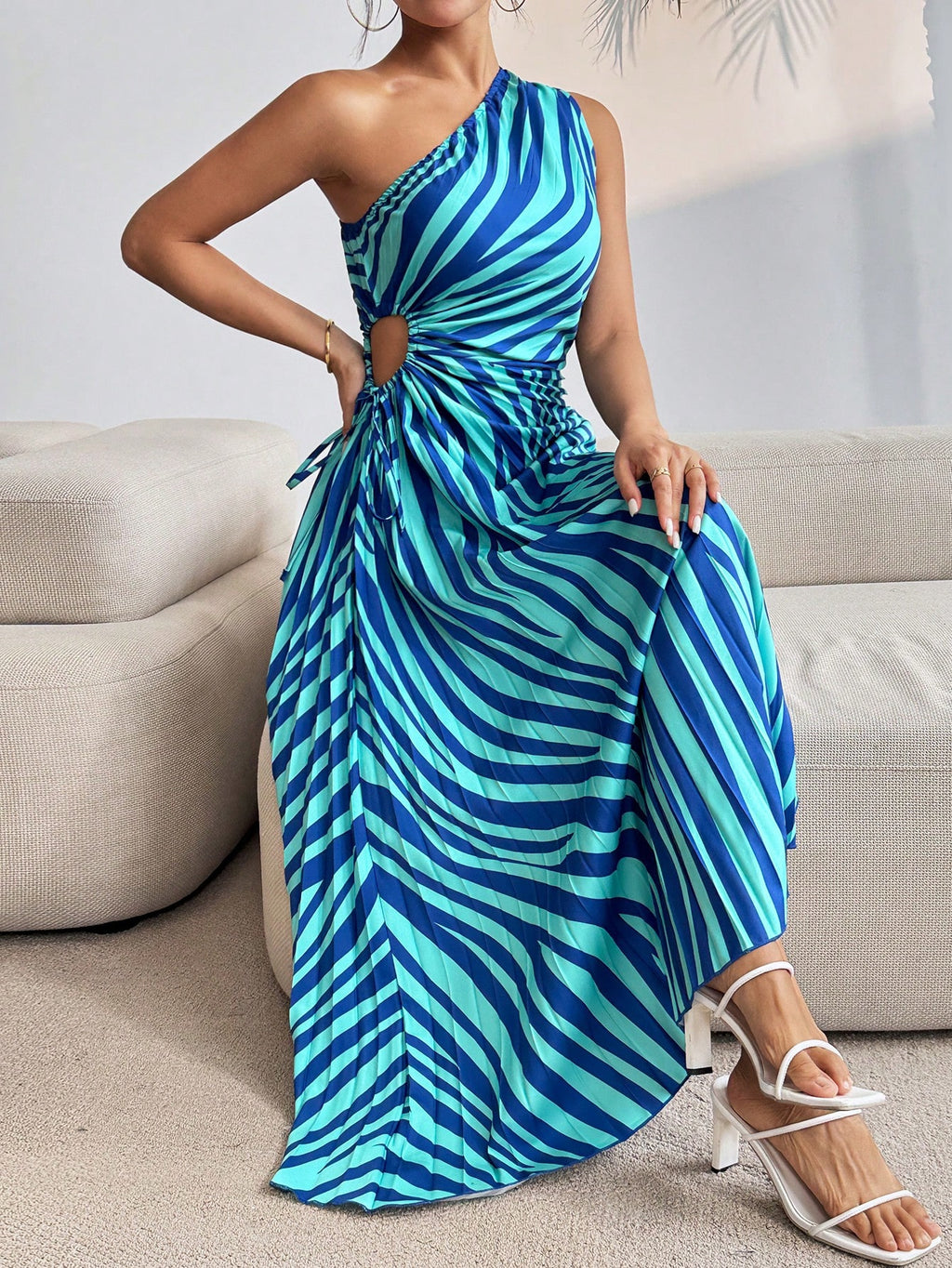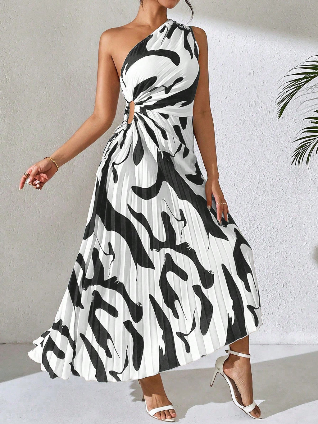 BELLAVOG Raffinéa Summer Asymmetric Neckline Pleated Hollow Out Printed Long Dress Maxi Women Outfit