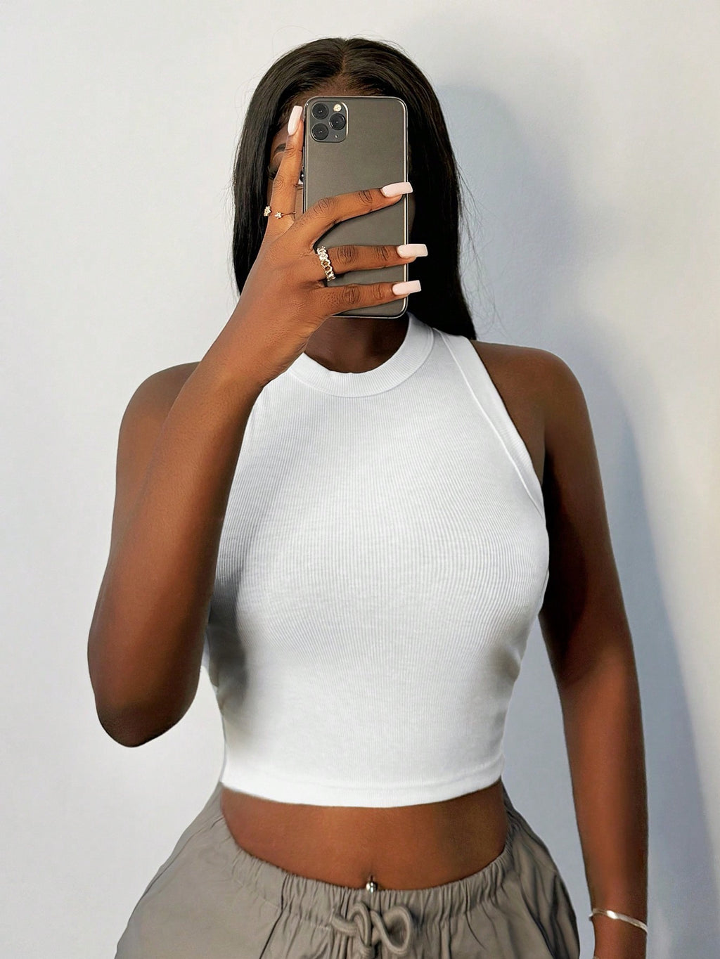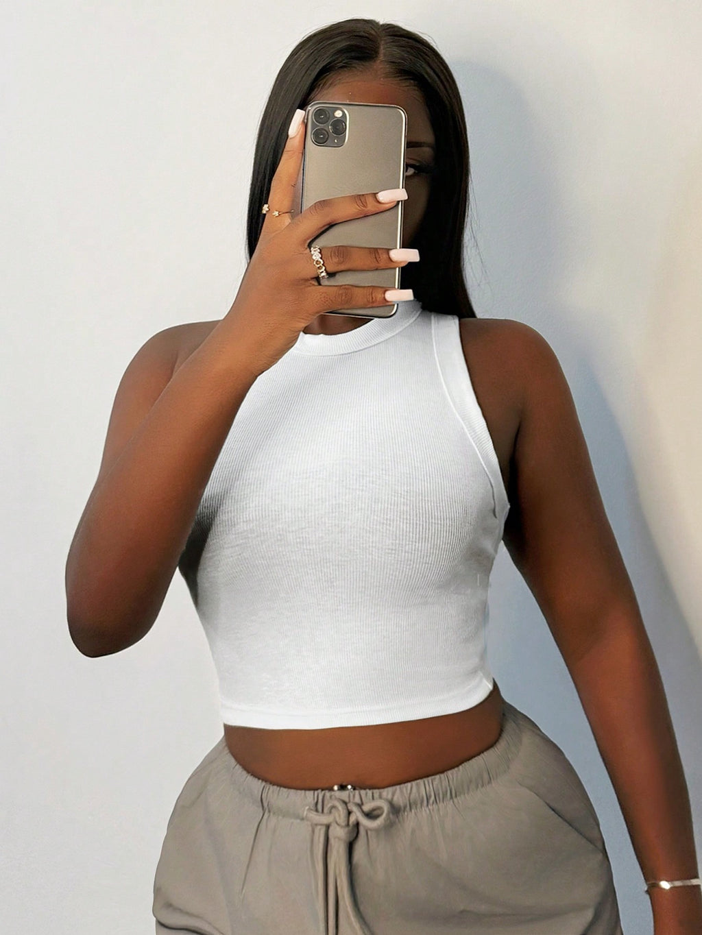 Slaydiva Damen Minimalistisches, vielseitiges Sommer Ärmellos Rundhals Crop Top in Weiß