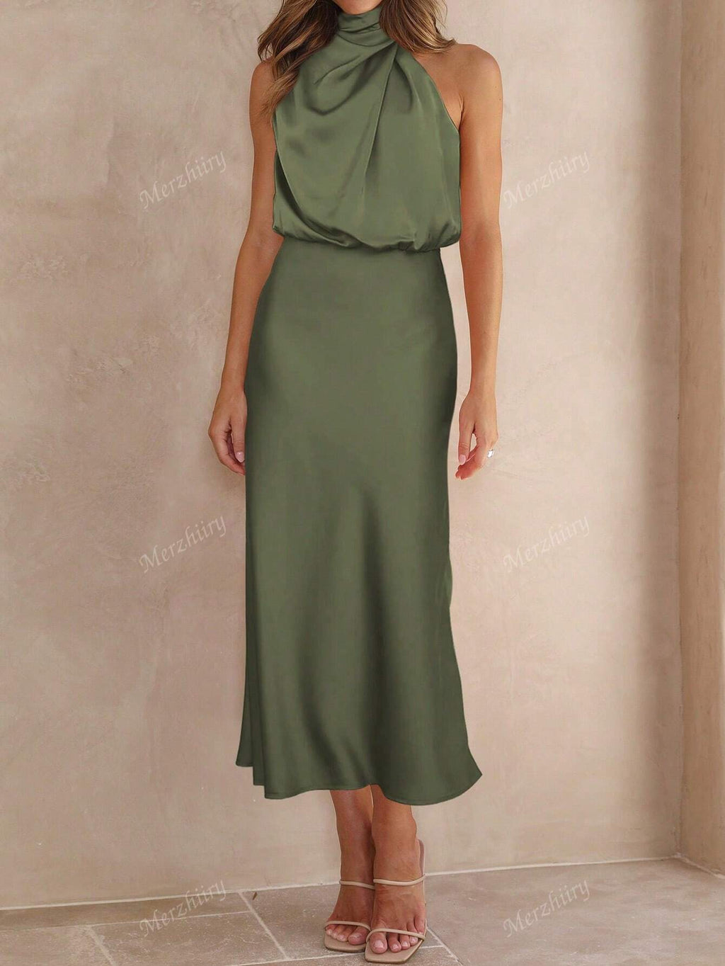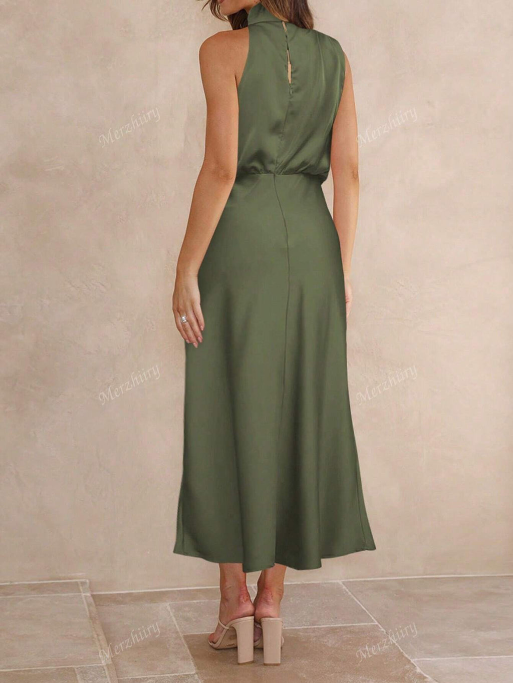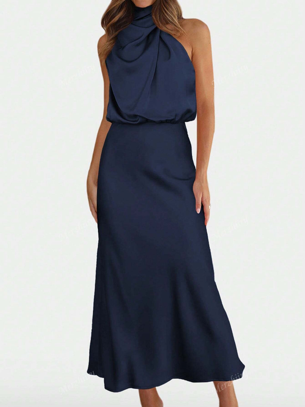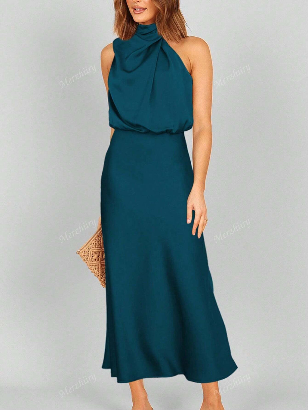 BELLAVOG Solid Asymmetrical Neck Satin Dress