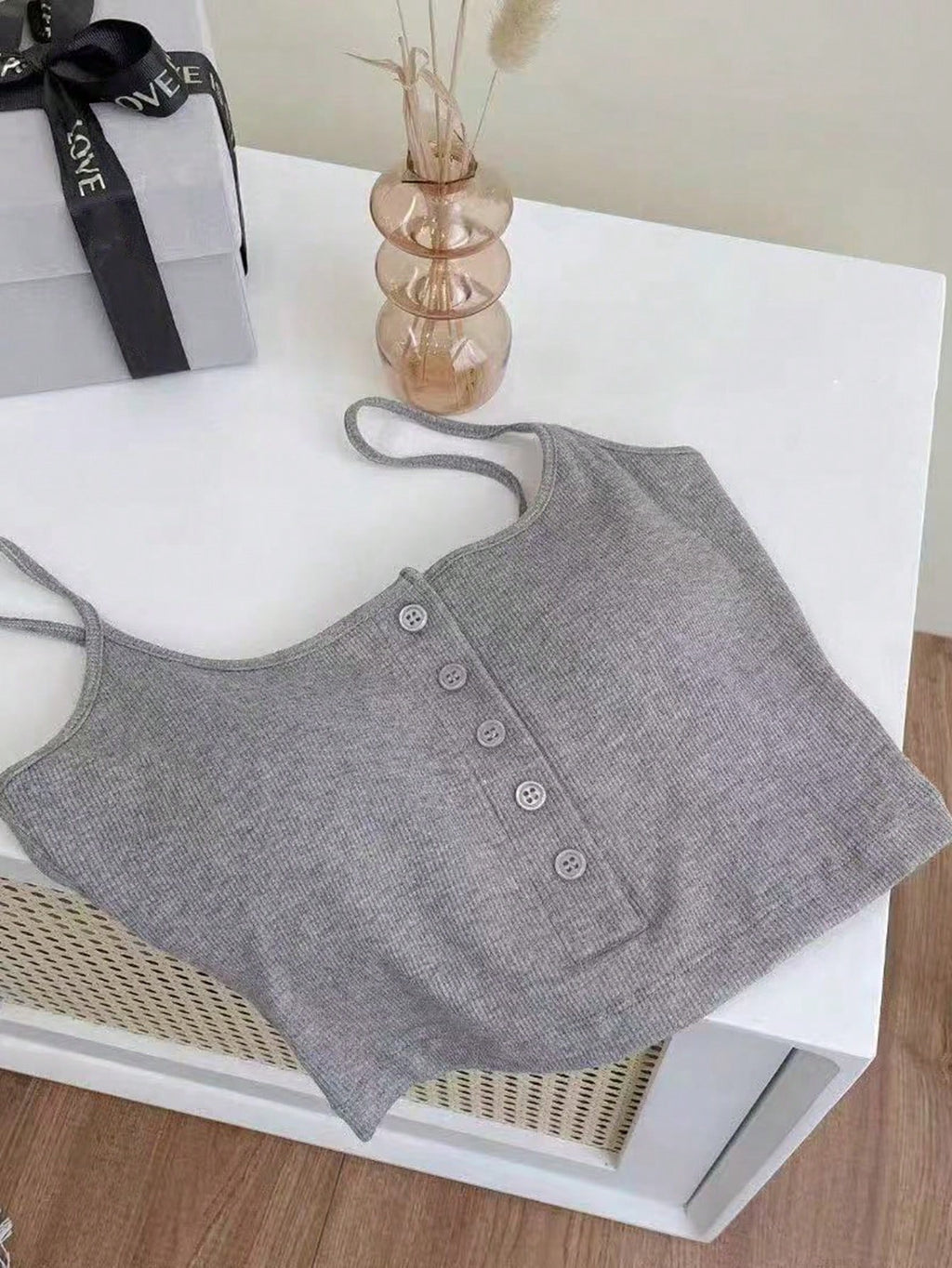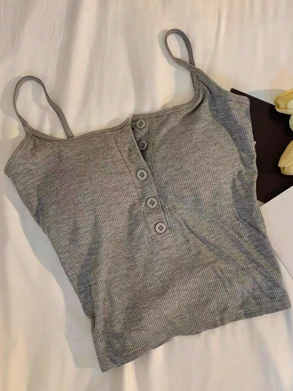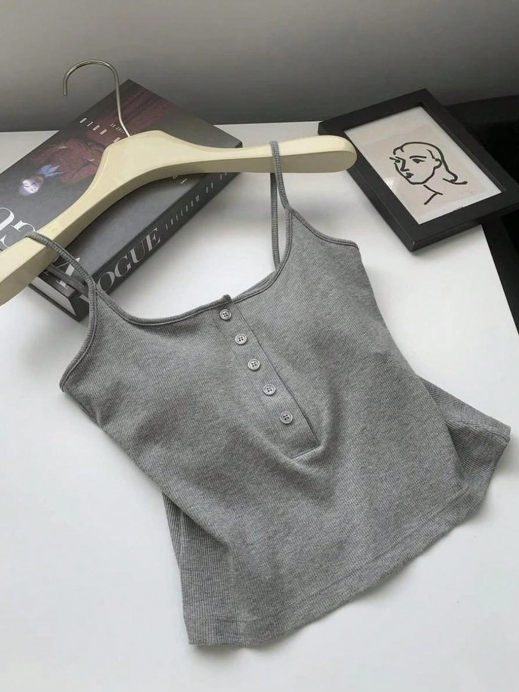 Vera Lane ženski Y2K inspirisan top od rebraste pletenine s kaišem i dugmadima — spoj minimalističkog, “old money”, korejskog i akademskog stila.