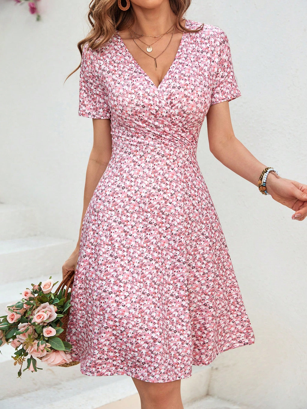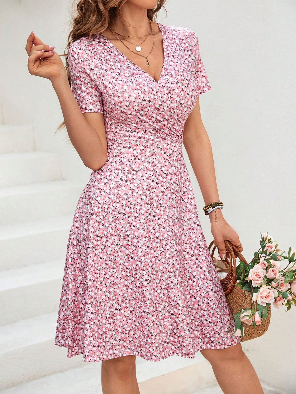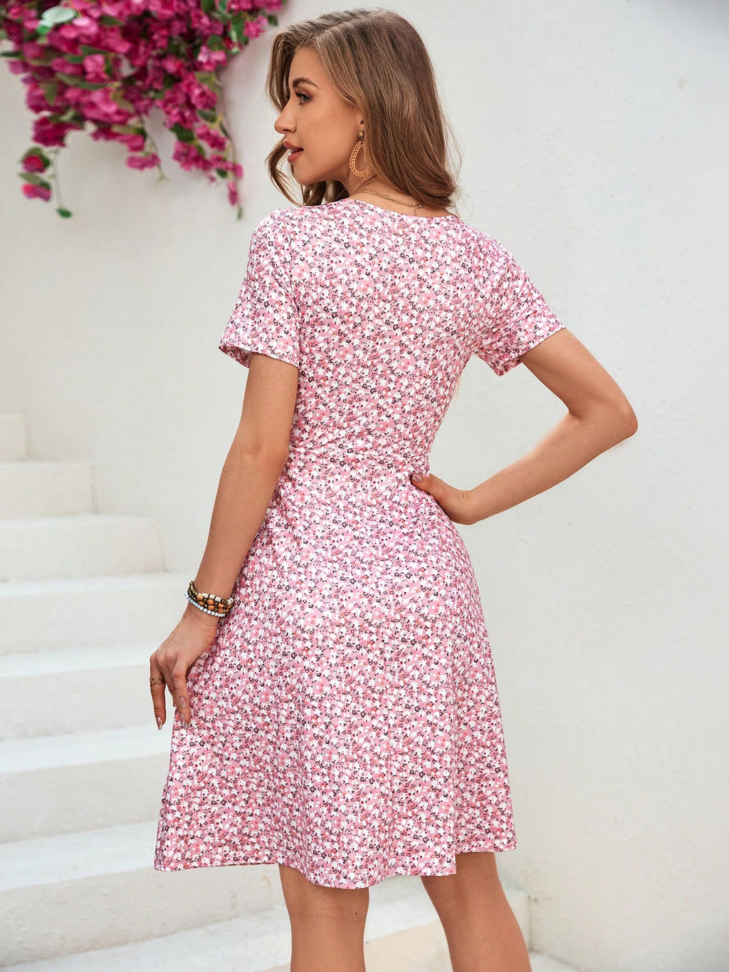 BELLAVOG Summer Ladies' Wrap Collar Floral Print Pink Dress,Pastel Dresses For Women