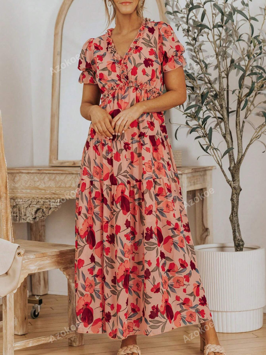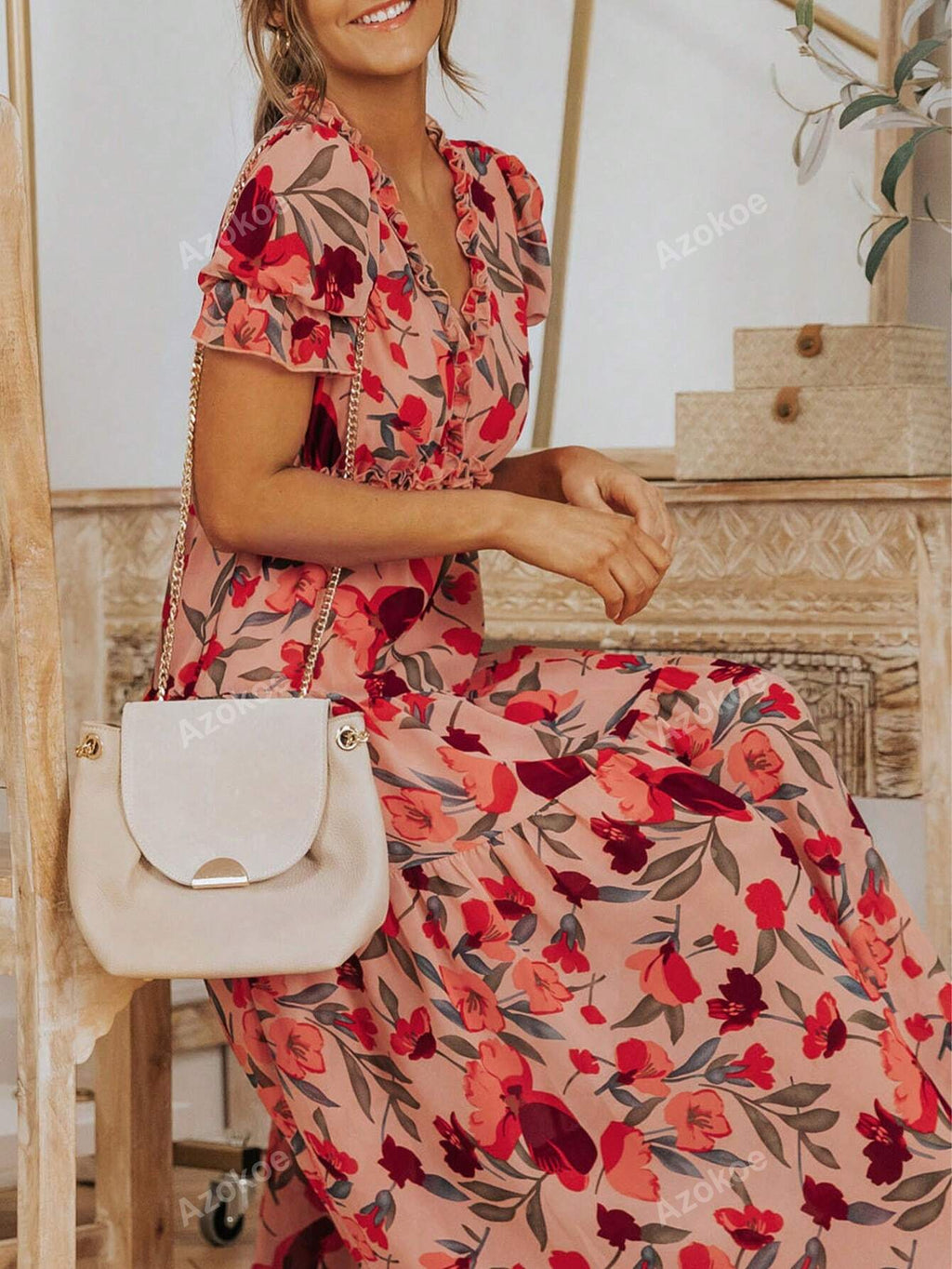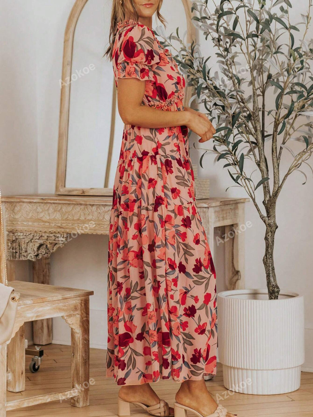 BELLAVOG Casual Boho Floral Printed Ruched V Neck Short Sleeve Long Party Dress