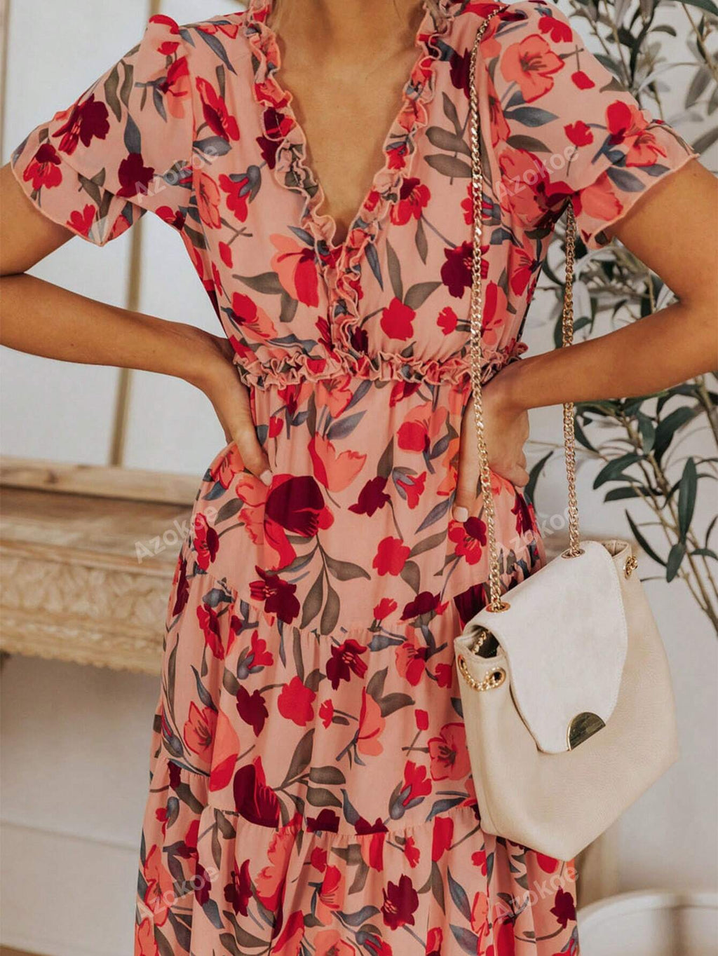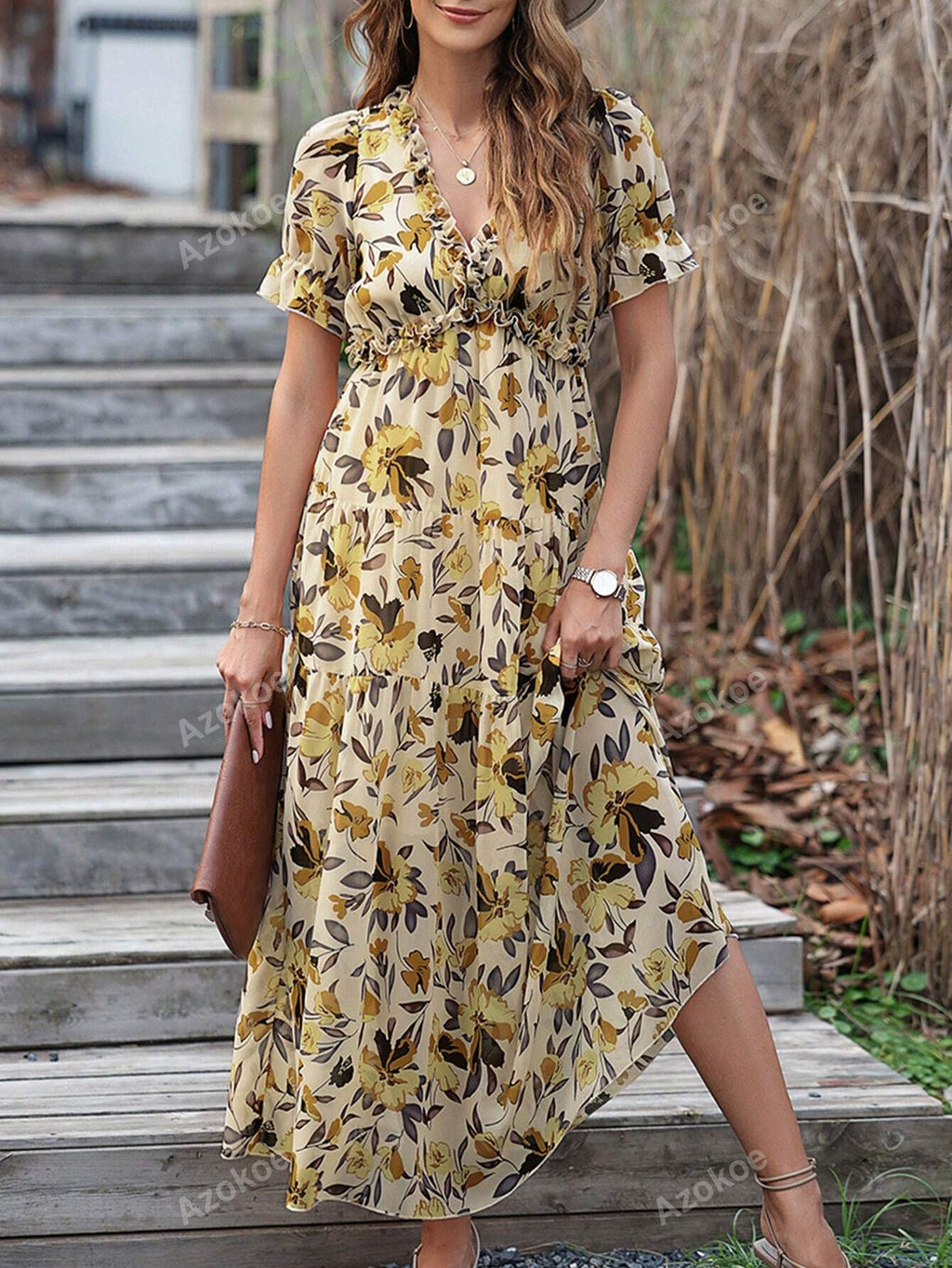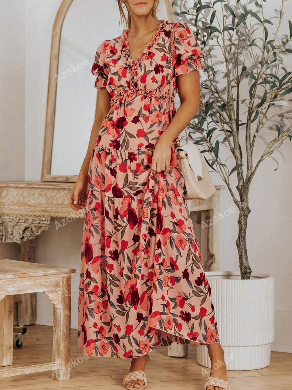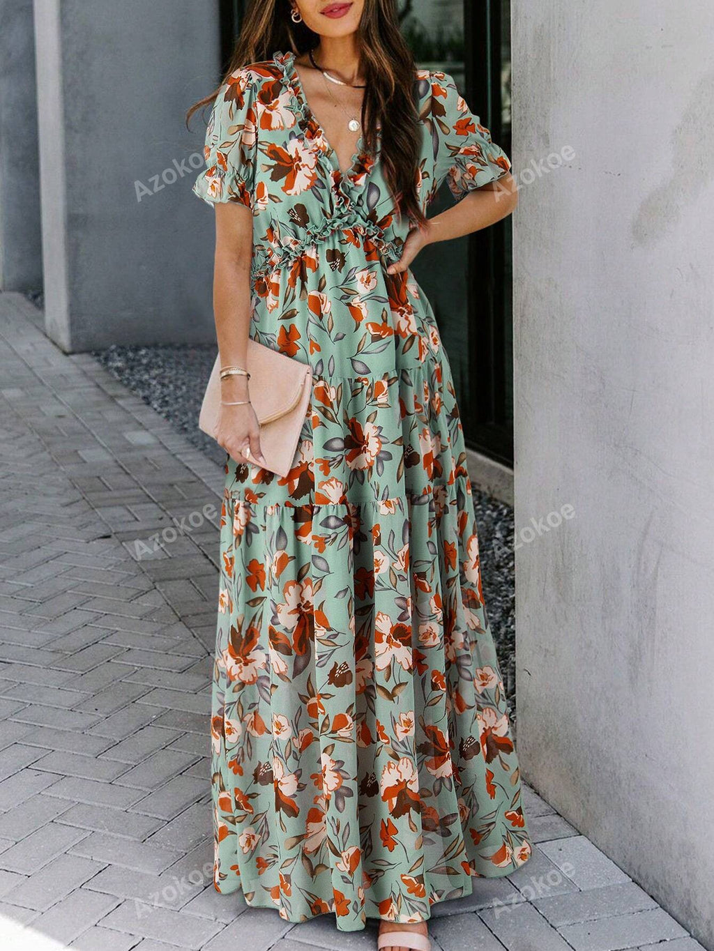 BELLAVOG Casual Boho Floral Printed Ruched V Neck Short Sleeve Long Party Dress
