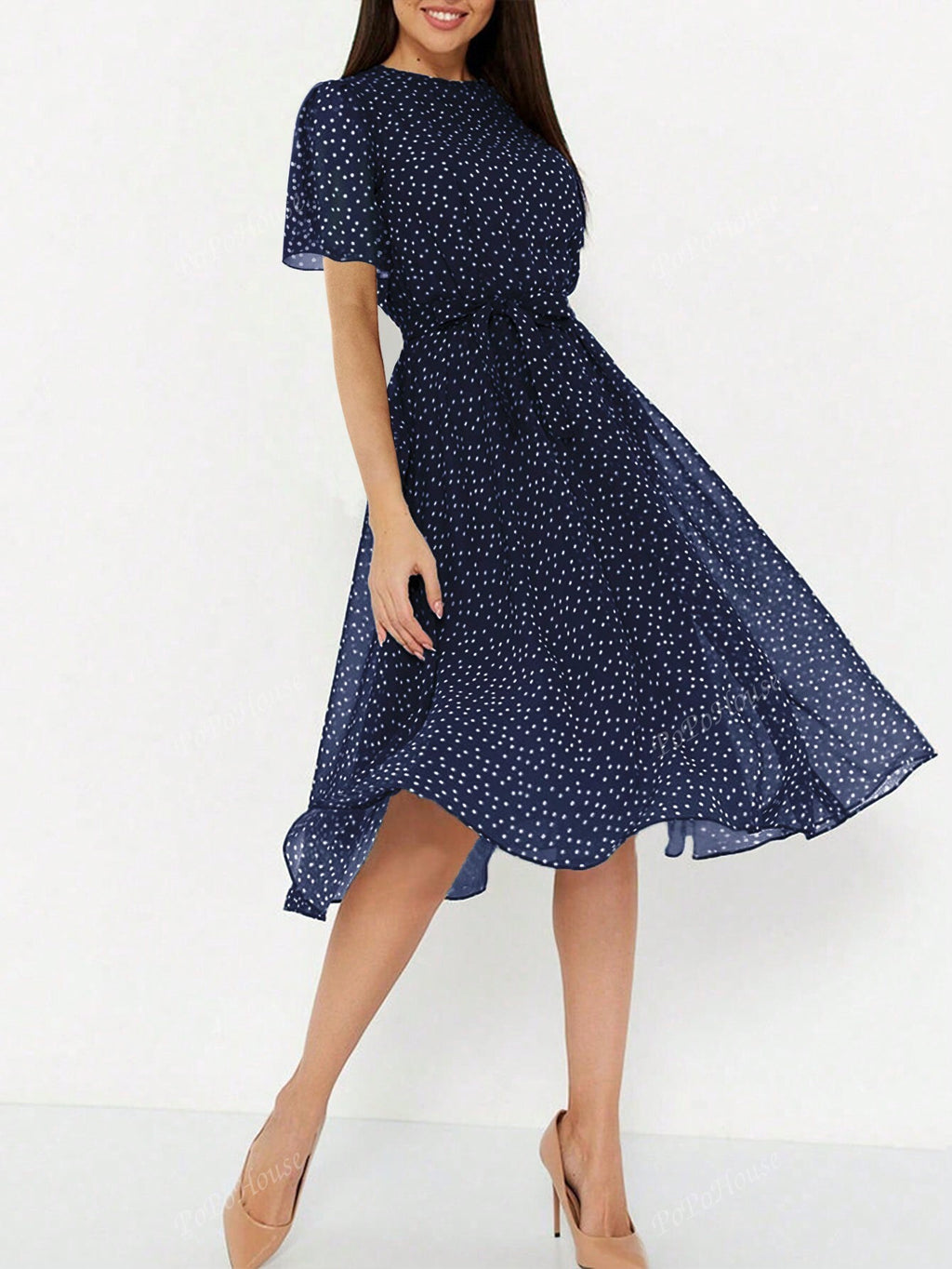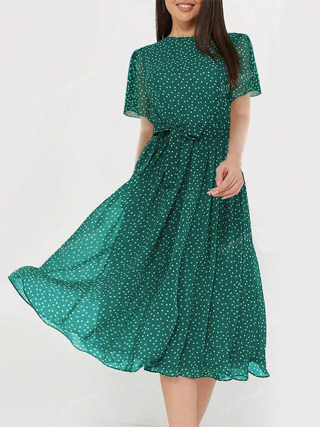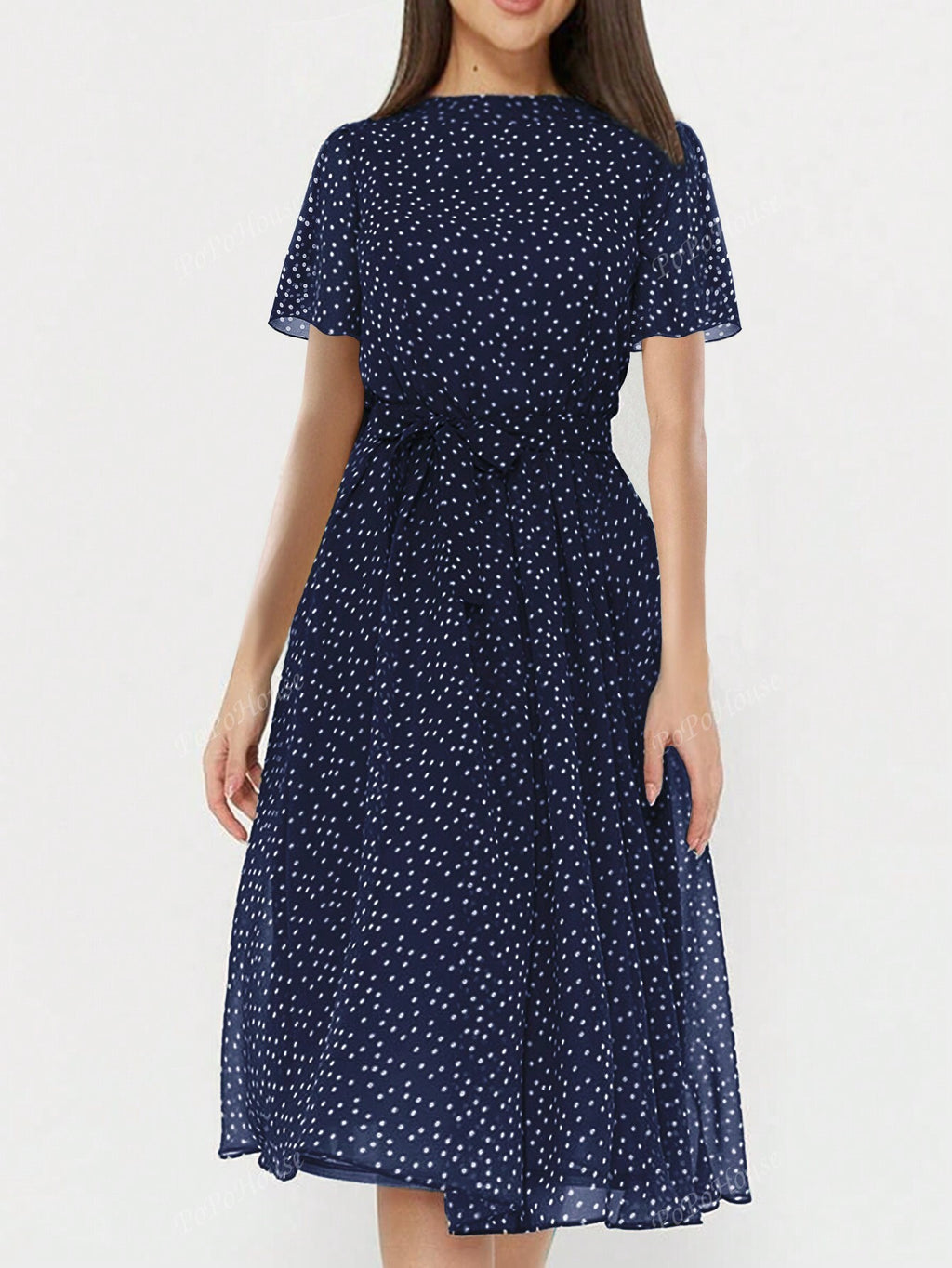 BELLAVOG Women's Round Neck Polka Dot Print Short Sleeve Elegant Dress