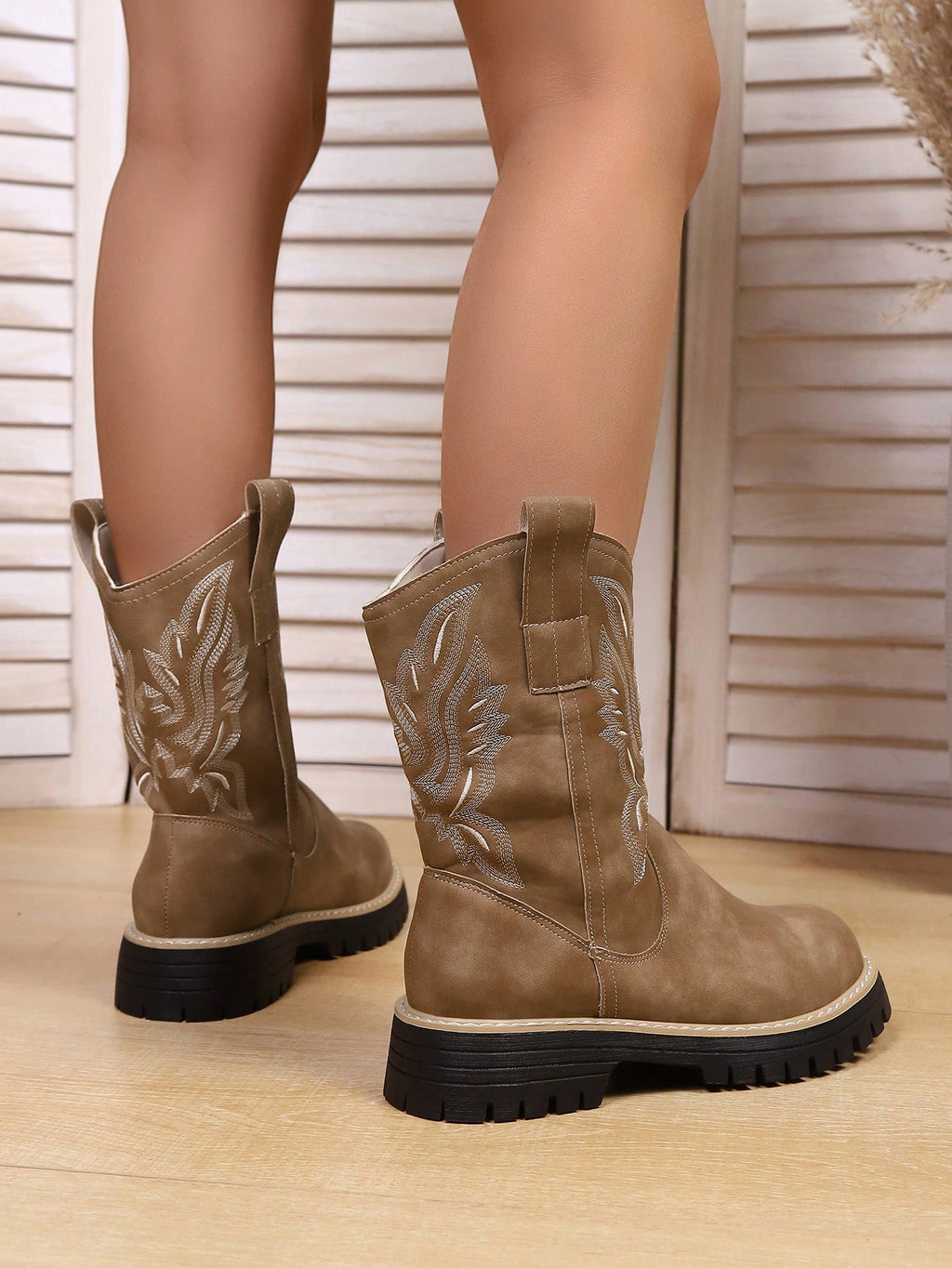Zapadne Cowboy Chelsea Čizme za Žene, Srednje Čizme sa Debelim Đonom za Lako Obuvanje sa Izvezenim Detaljima, Okrugli Nos Retro Stil