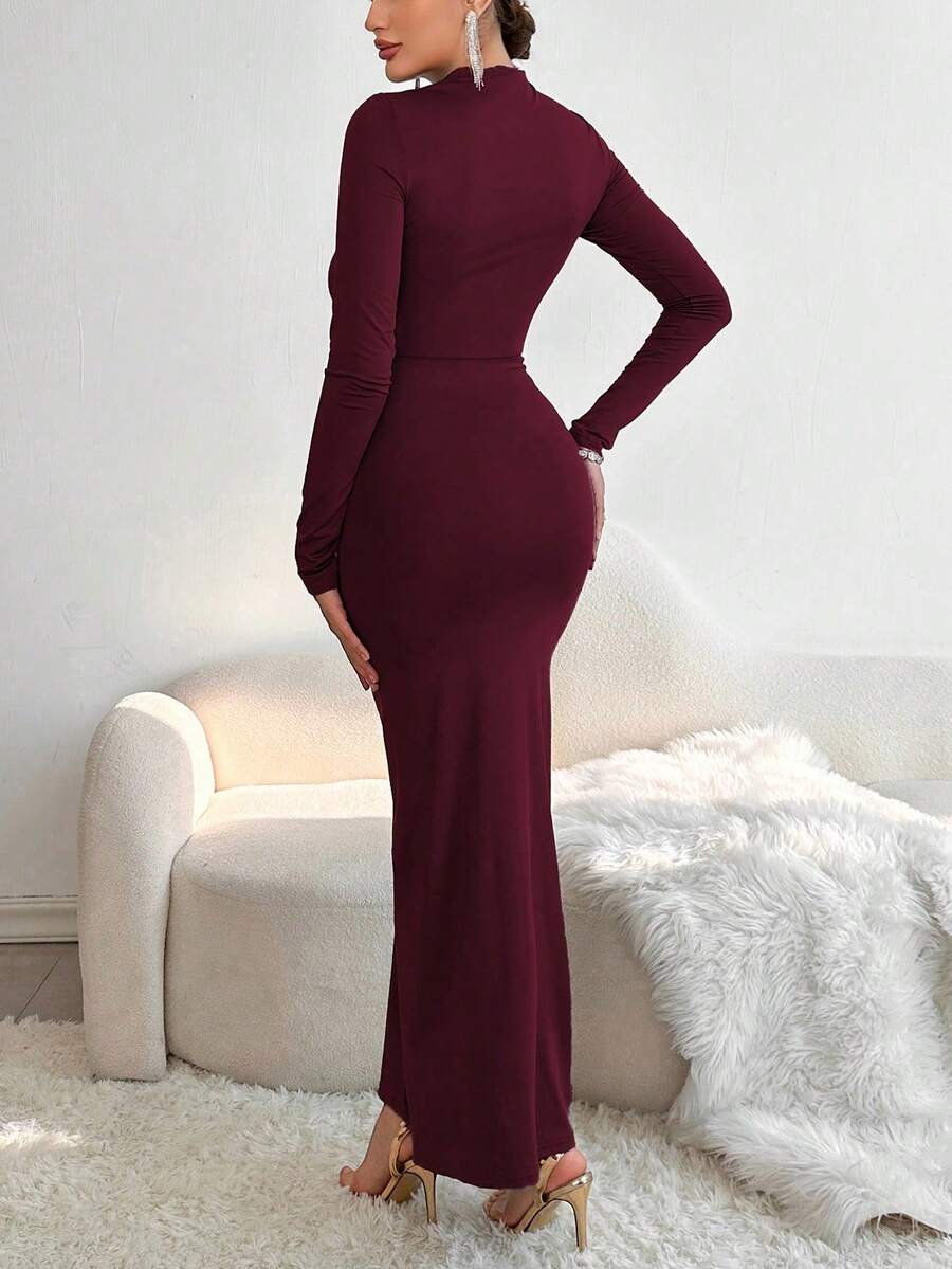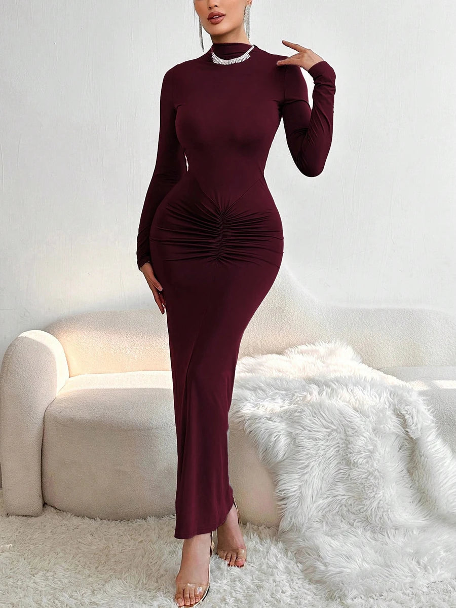 1pc Ženska Ulica Stil Seksi Oblačenje Skupljeni Struk Jednobojna Duga Haljina, Elegantna Nabrana Haljina