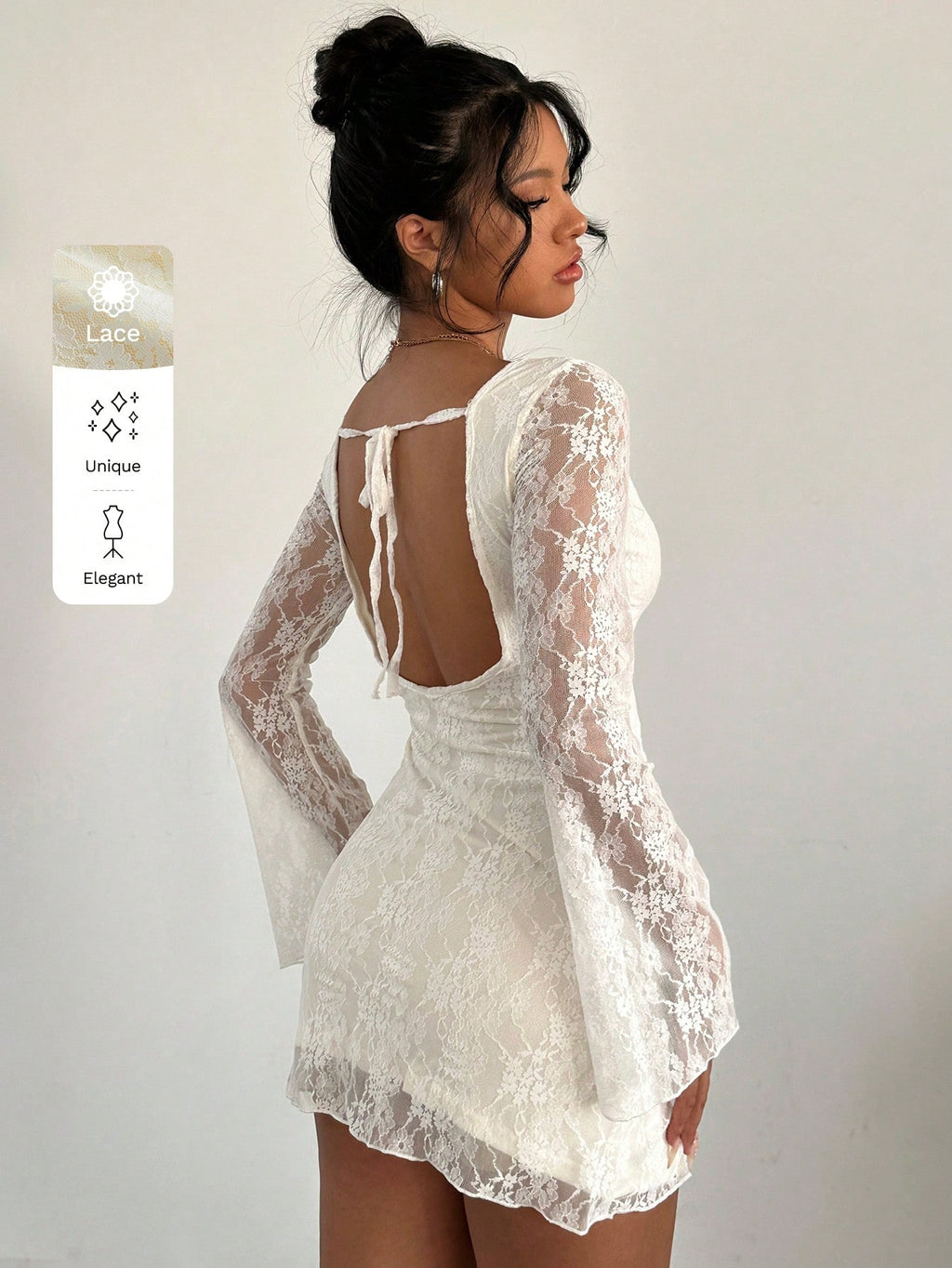 Aloruh elegantna bijela mini haljina s čipkom – otvorena leđa i dugi rukavi, za maturu