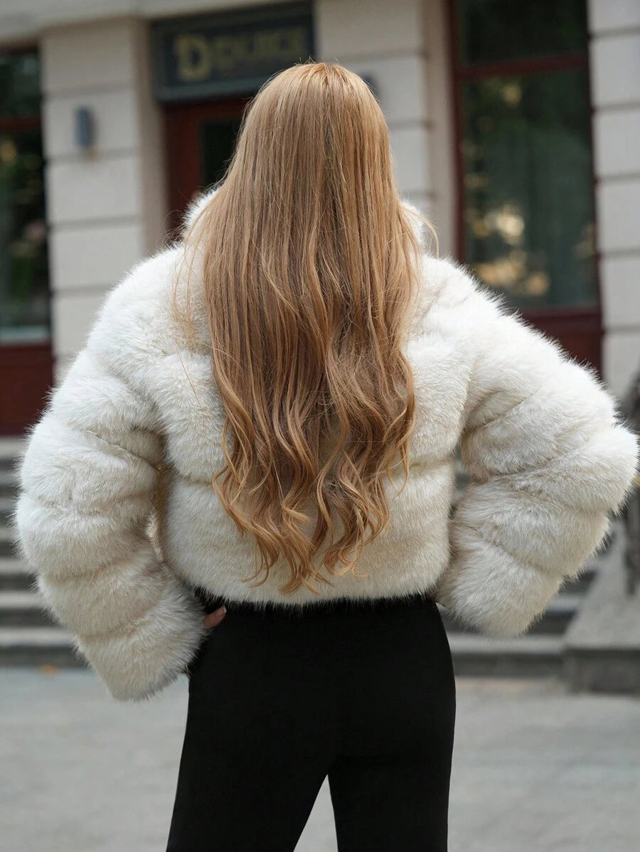Anewsta moderna i elegantna ženska kratka jakna s pahuljastom (fluffy) kragnom, idealna za jesen i zimu