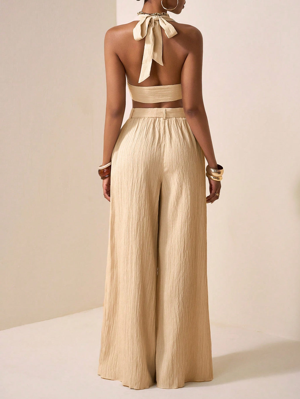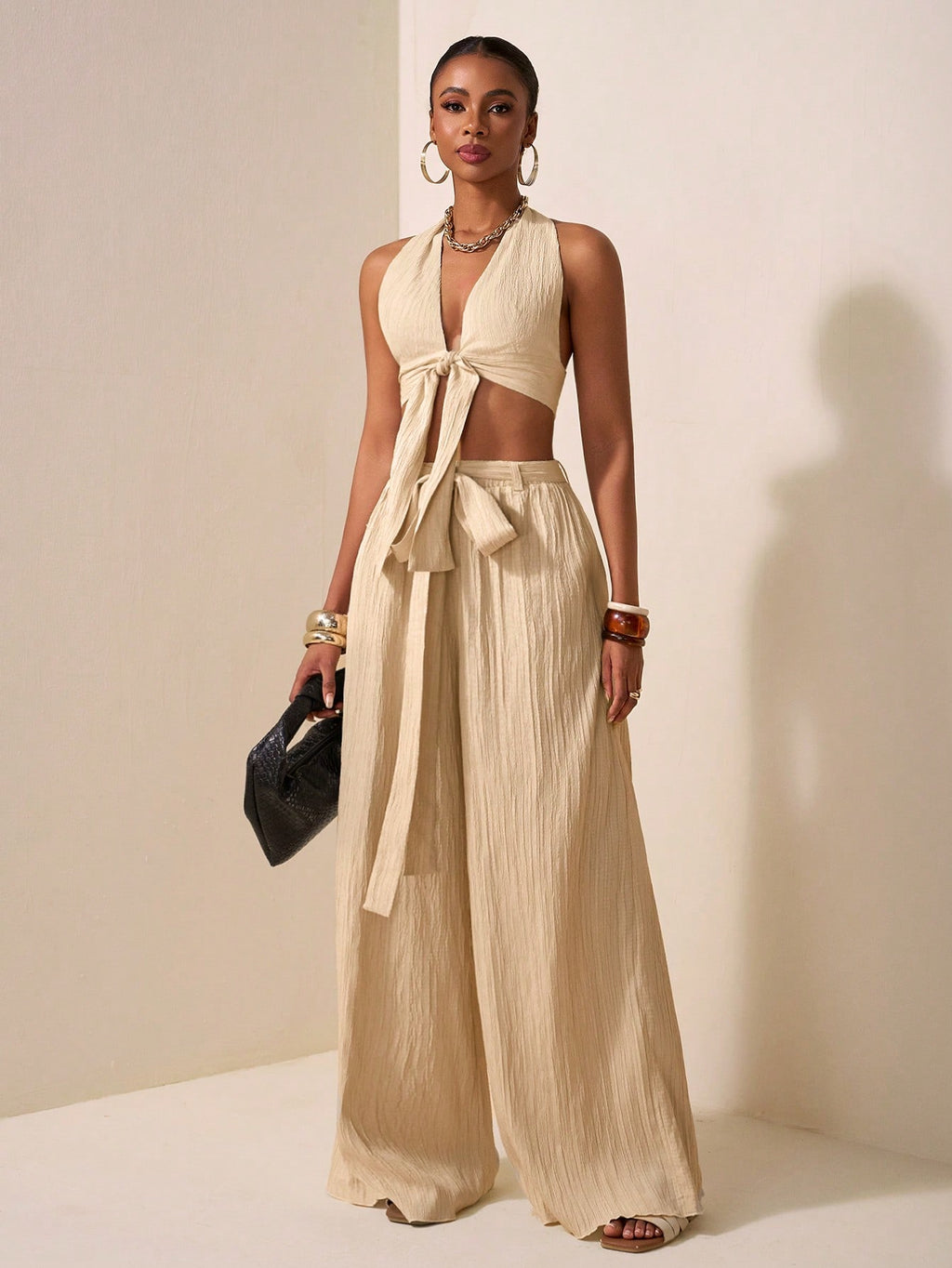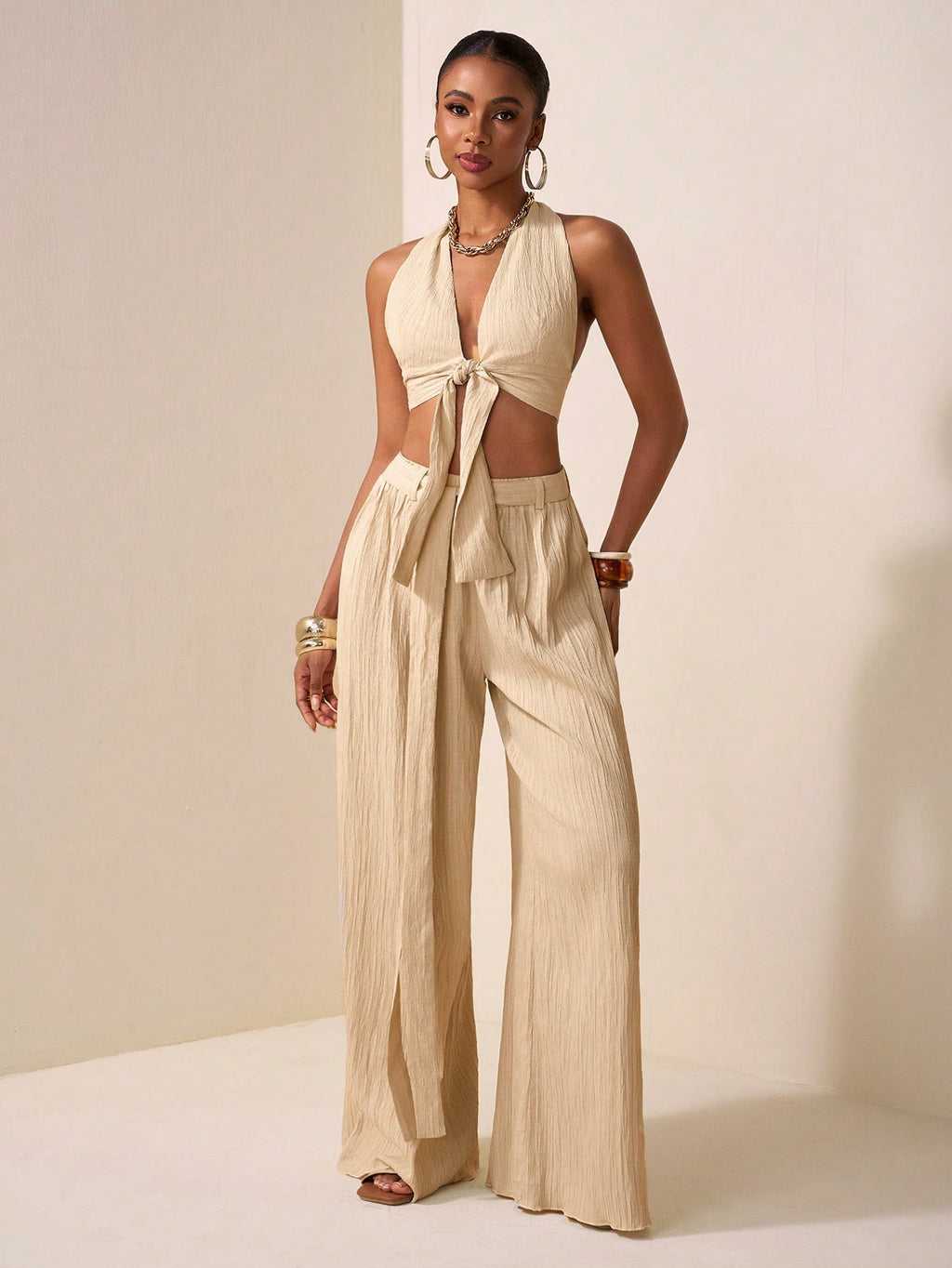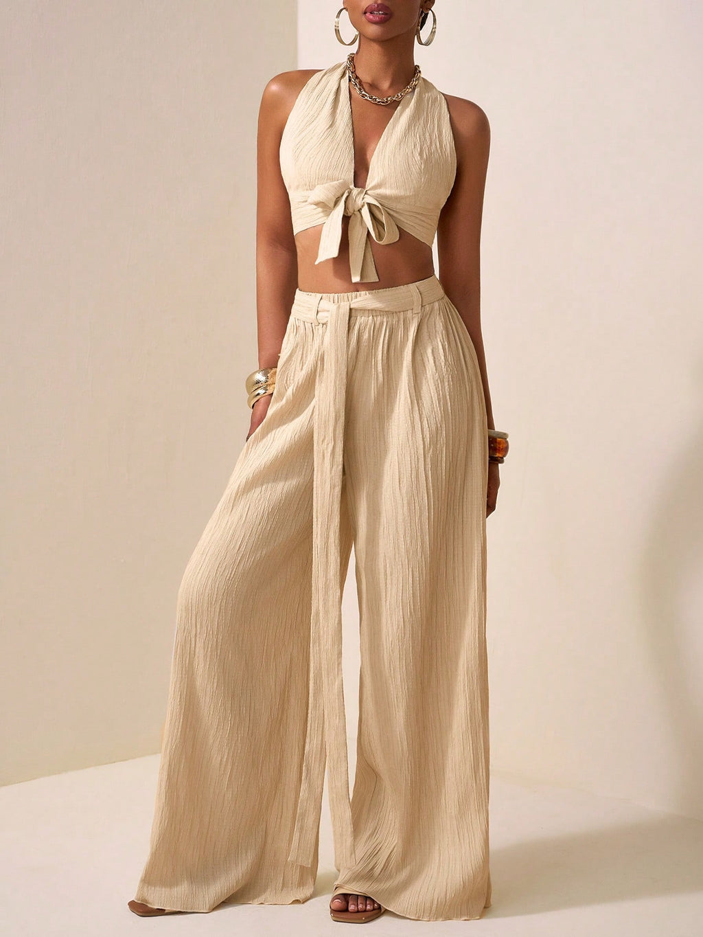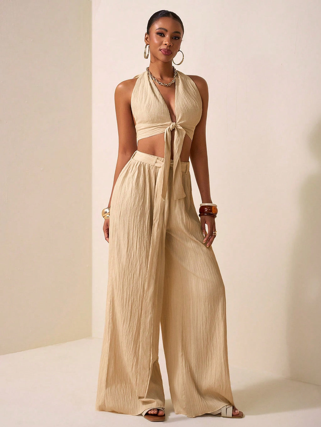 BELLAVOG 2025 Novi stil Casual Vacation Daily Date Beach Party Club Elegantan remen sa halterom oko vrata s dubokim V izrezom sprijeda i središnjim remenom Dizajn urezani top bez rukava široke hlače ekstra duge hlače boje kajsije Ženski dvodijelni set-A