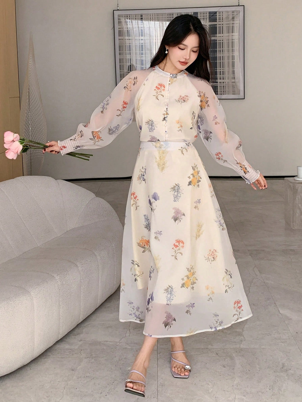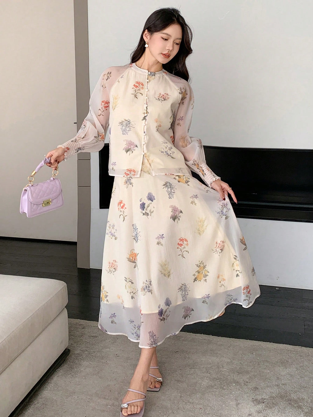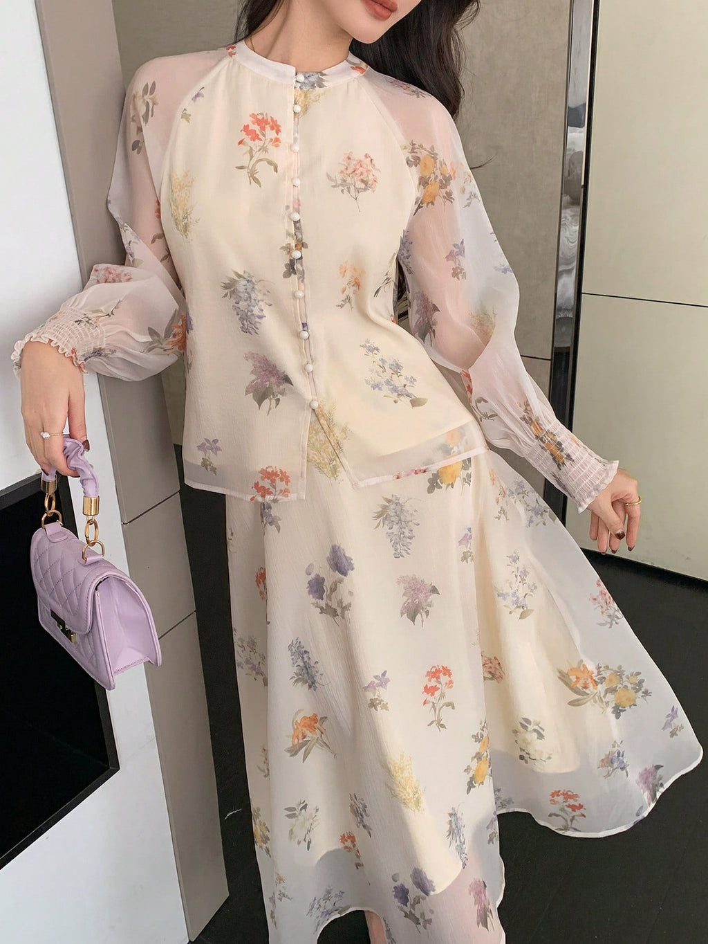 BELLAVOG Set od 2 komada/komad s cvjetnim printom i stojećim ovratnikom - košulja i suknja