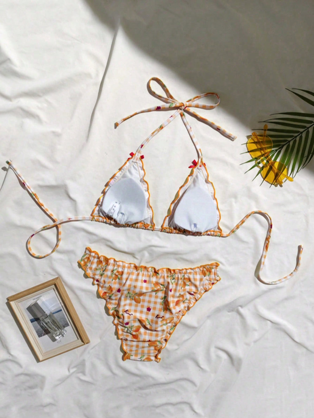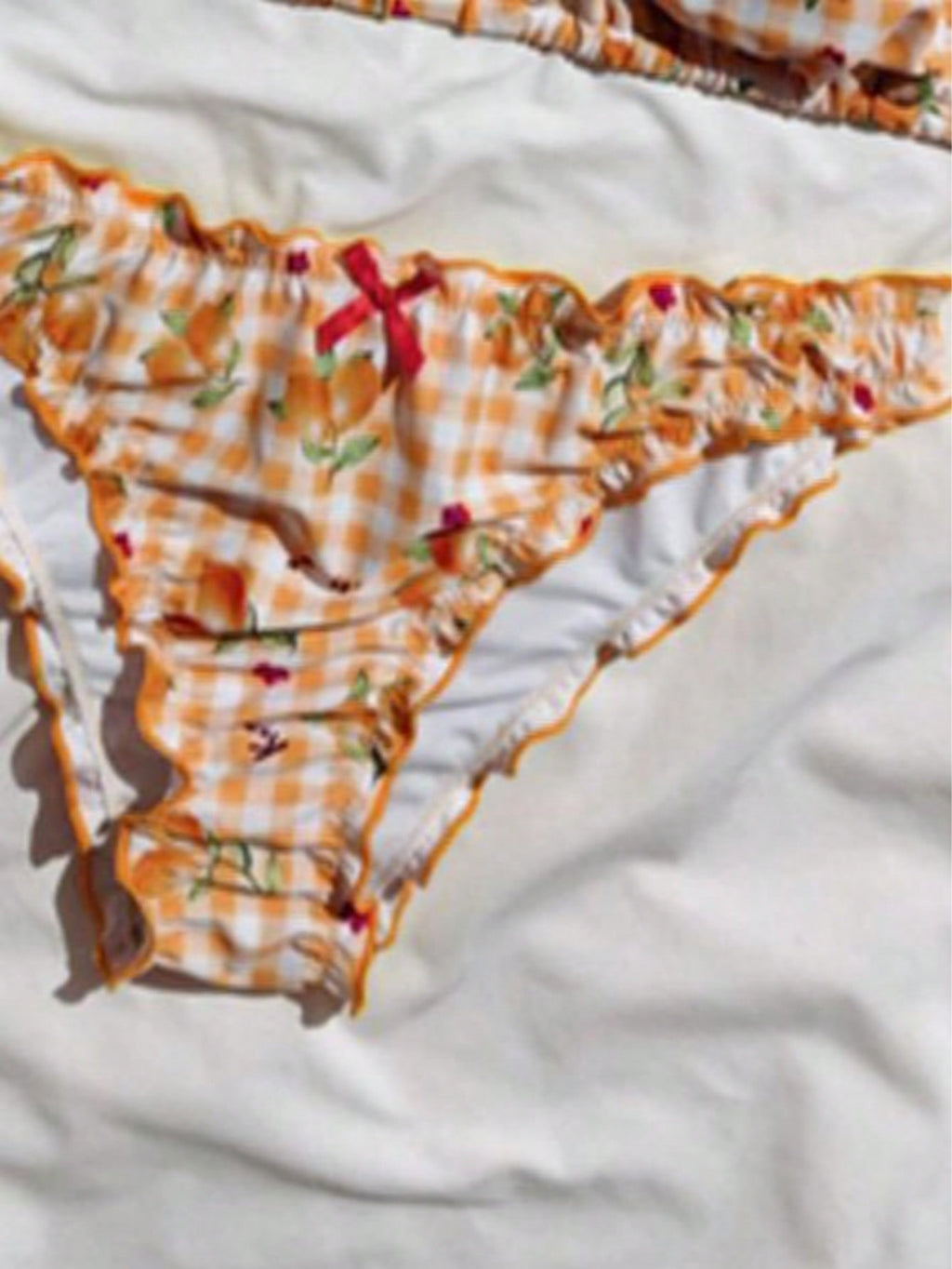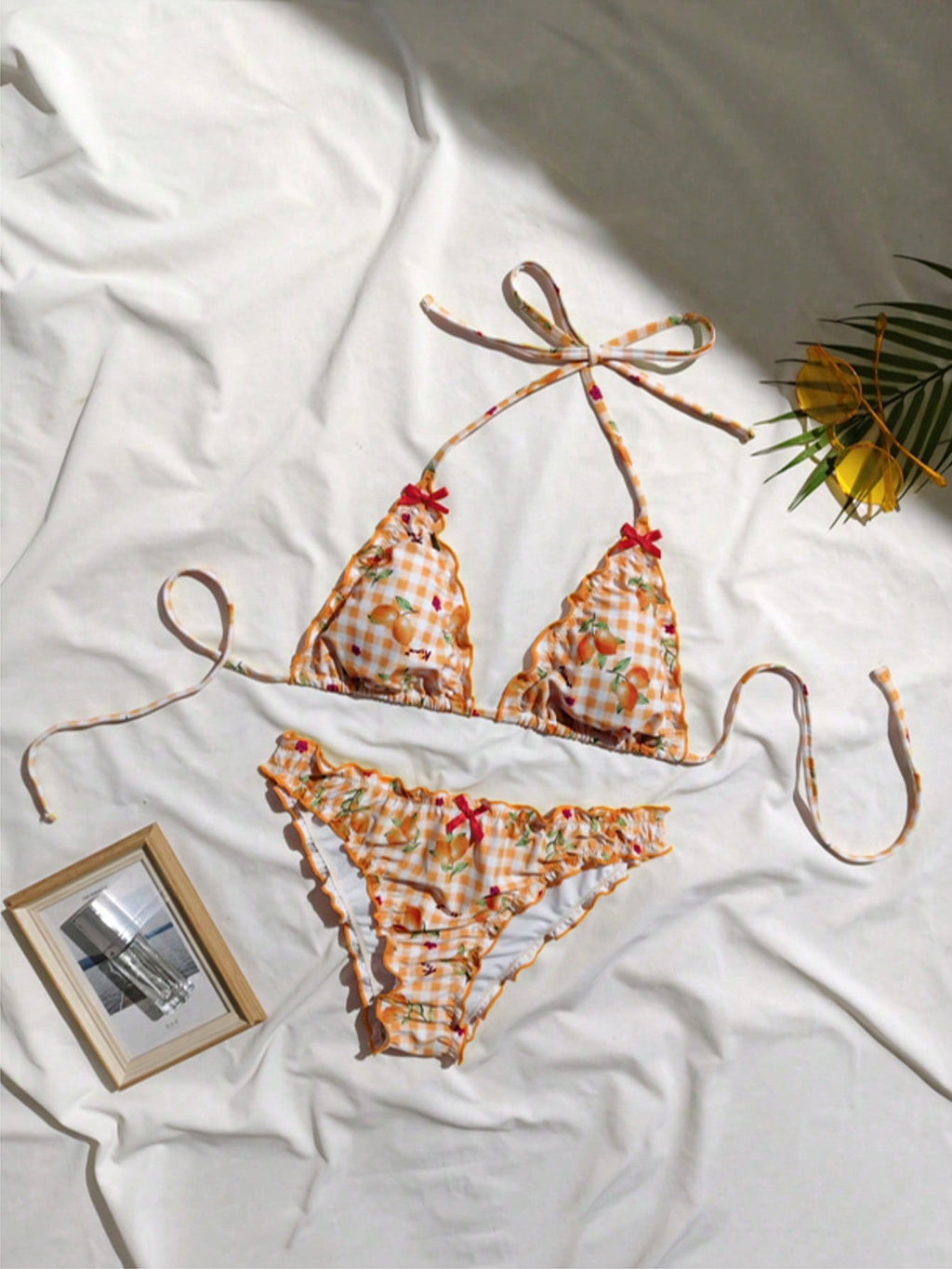 BELLAVOG Set od 2 komada, bikini s limun žutim kariranim printom i crvenom mašnom, ležeran za plažu