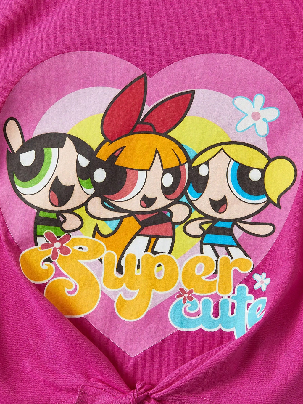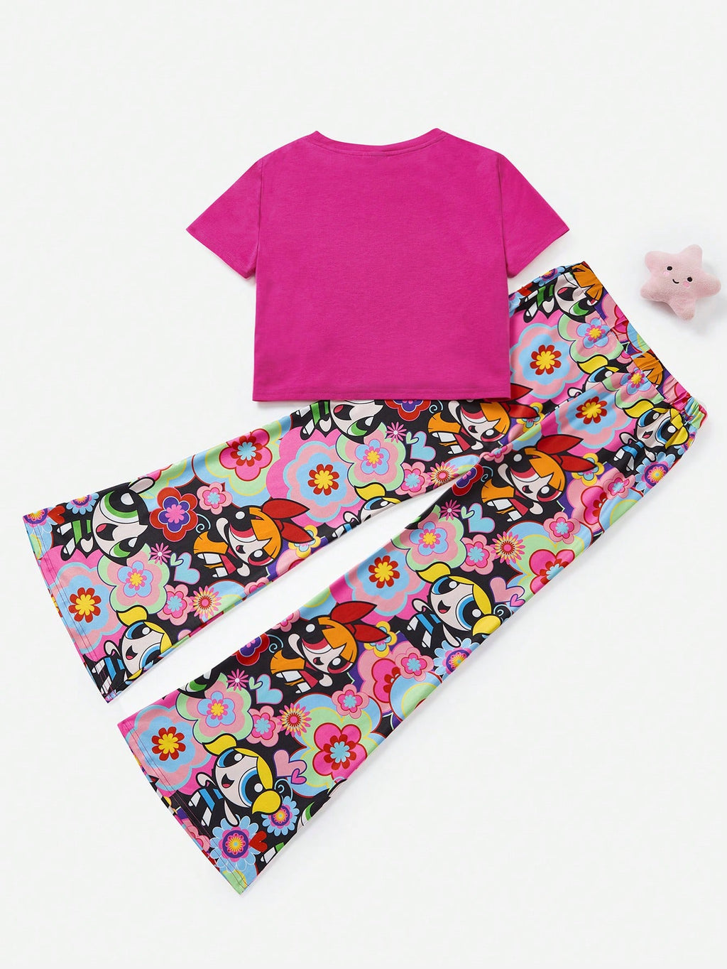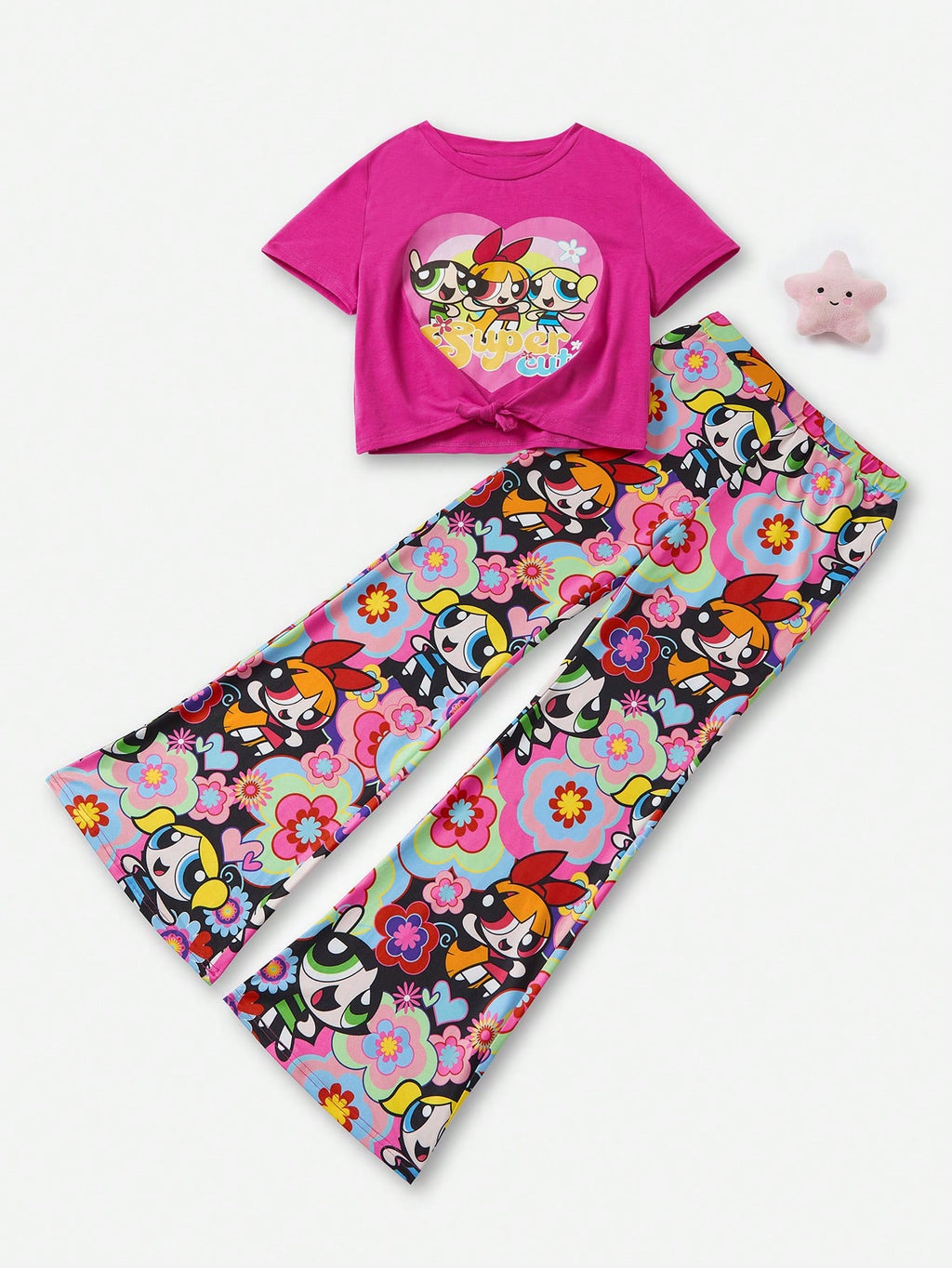 BELLAVOG Set od 2 komada - majica kratkih rukava i zvonaste hlače za djevojčice tinejdžerice s crtanim printom i ukrasom od čvorova