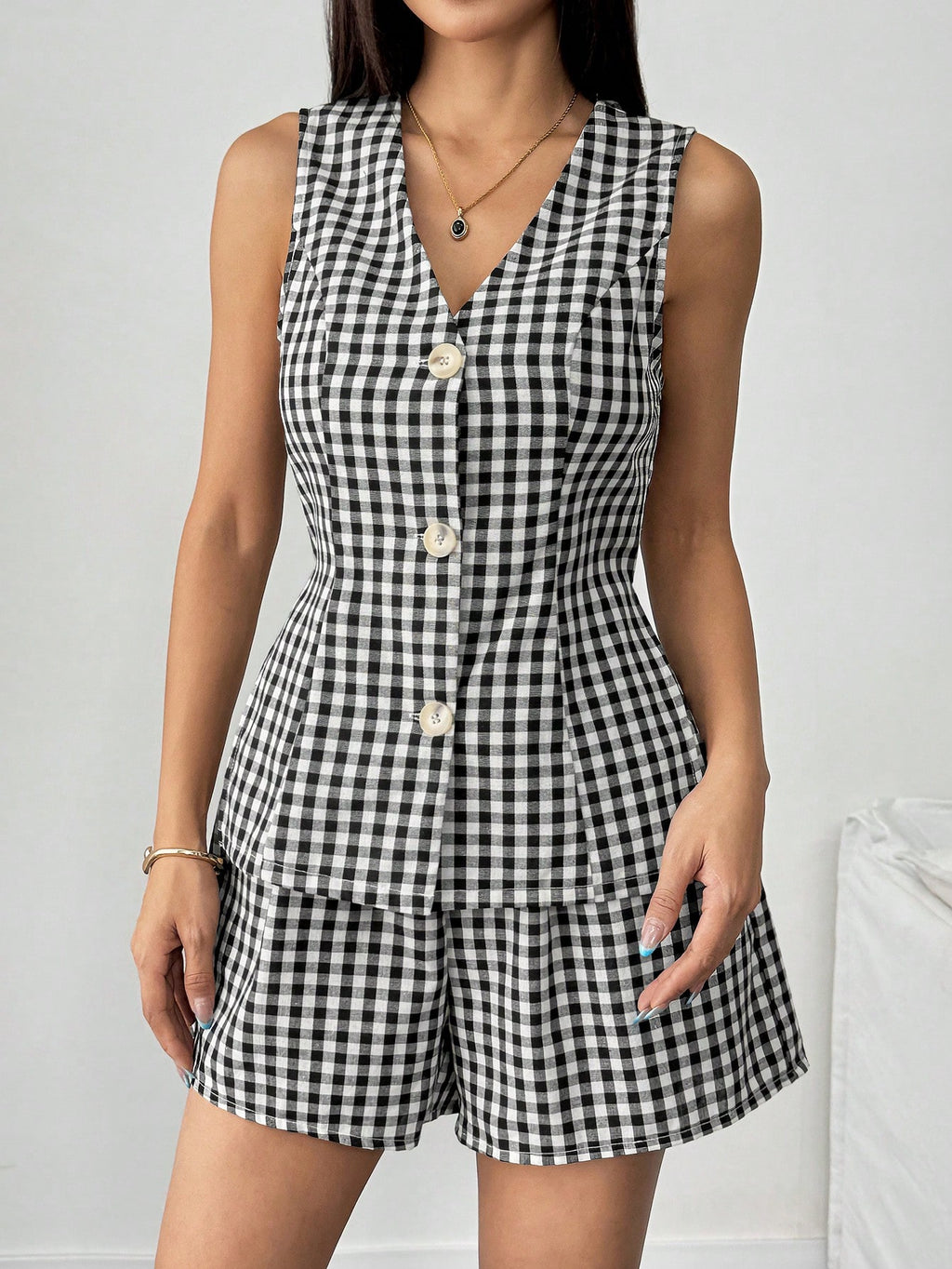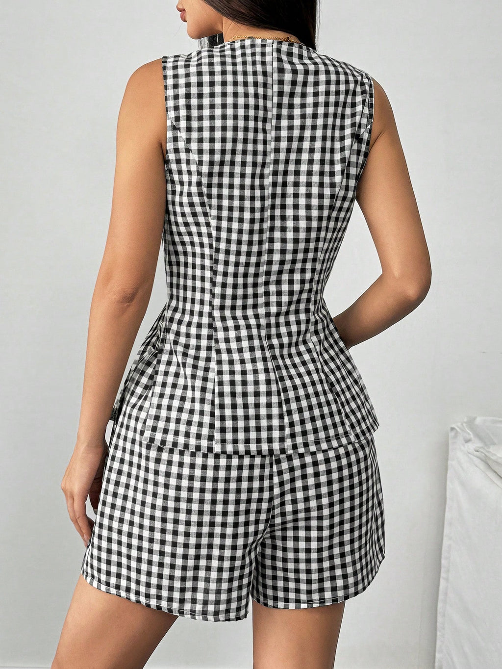 BELLAVOG Ženski ležerni karirani prsluk bez rukava s kratkim hlačama, set od 2 komada