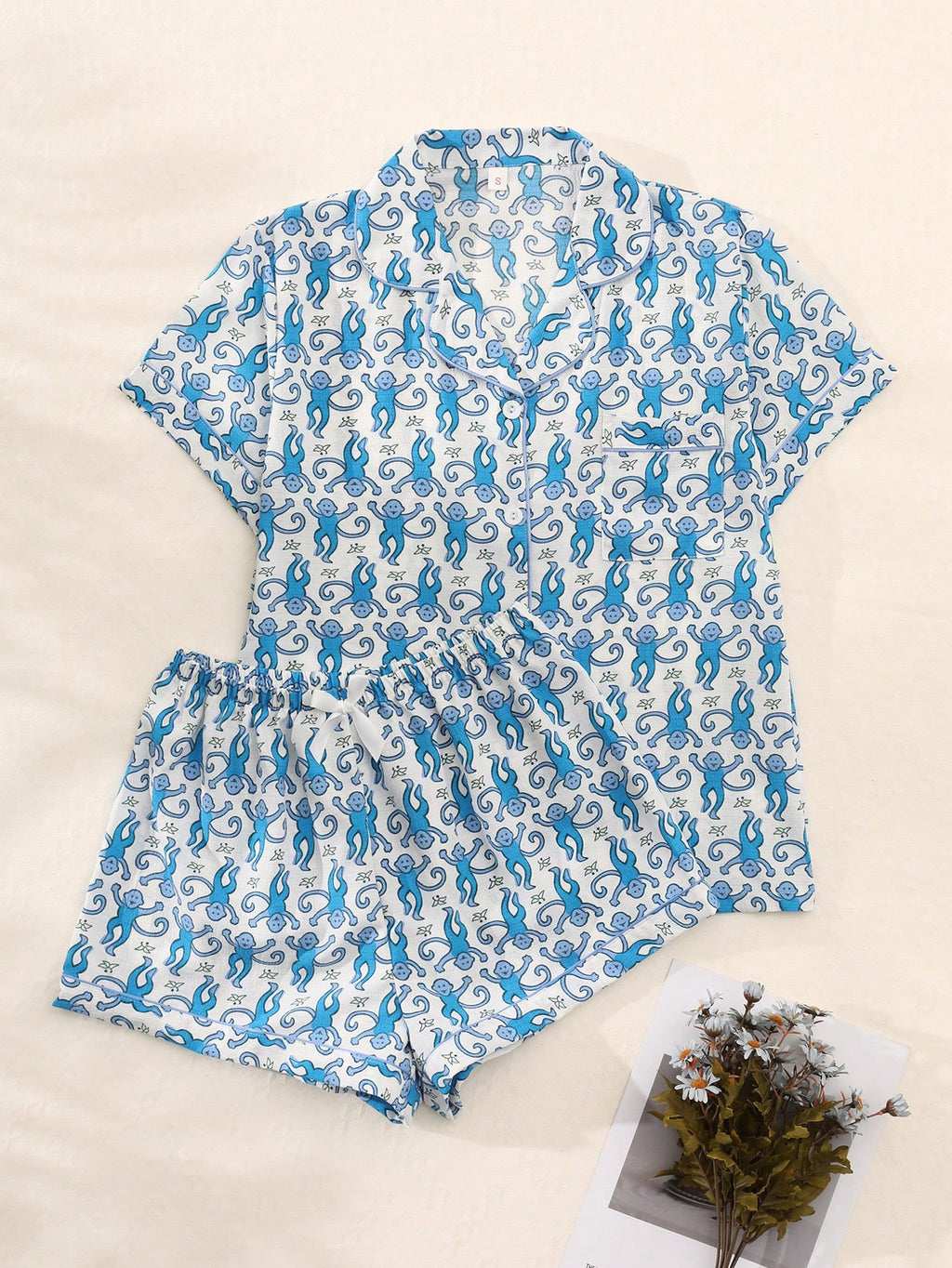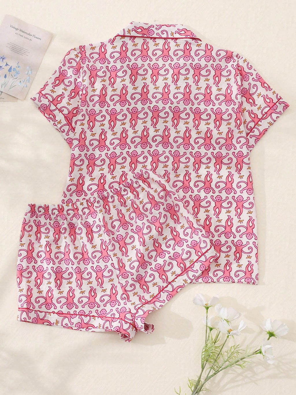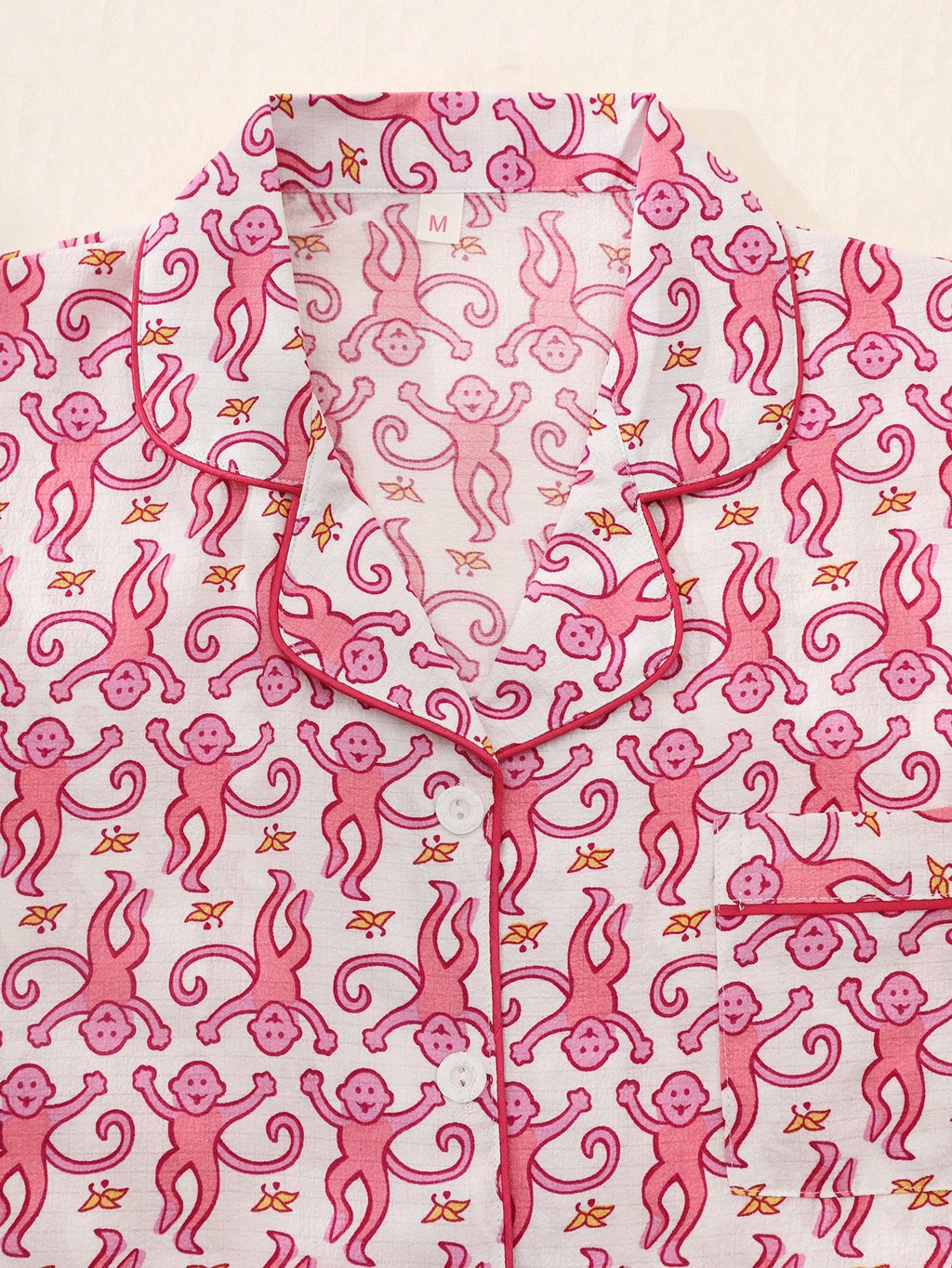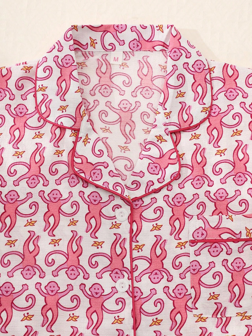 BELLAVOG Ženski set od 2 komada, majica i hlače s V-izrezom i dugmadima, s printom majmuna, kratkim rukavima i jednim redom kopčanja, ljetni set pidžame, udoban za kućnu upotrebu, set od dva dijela