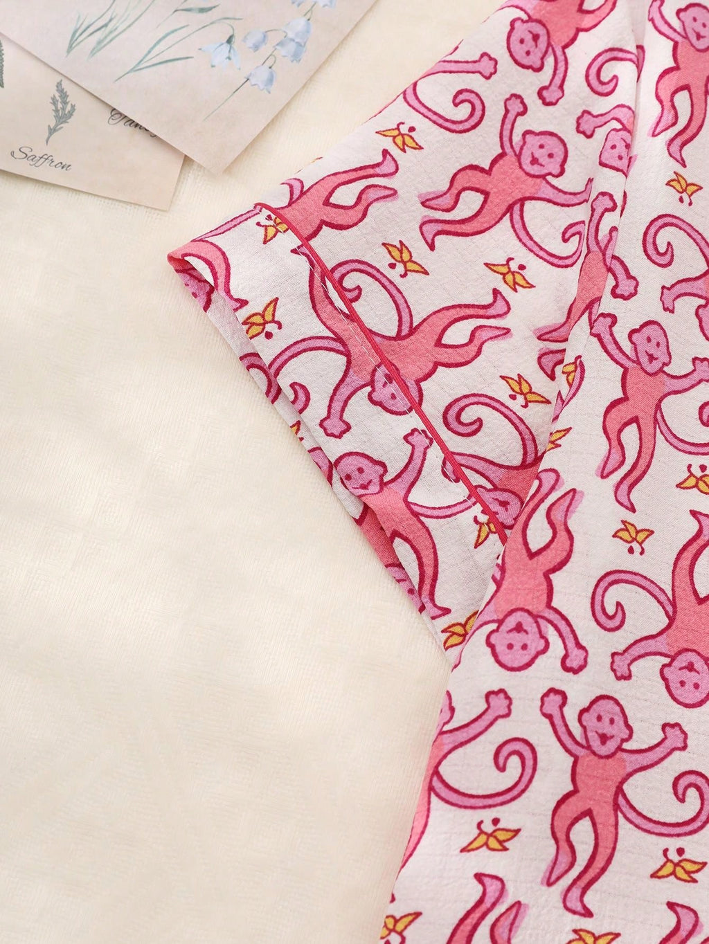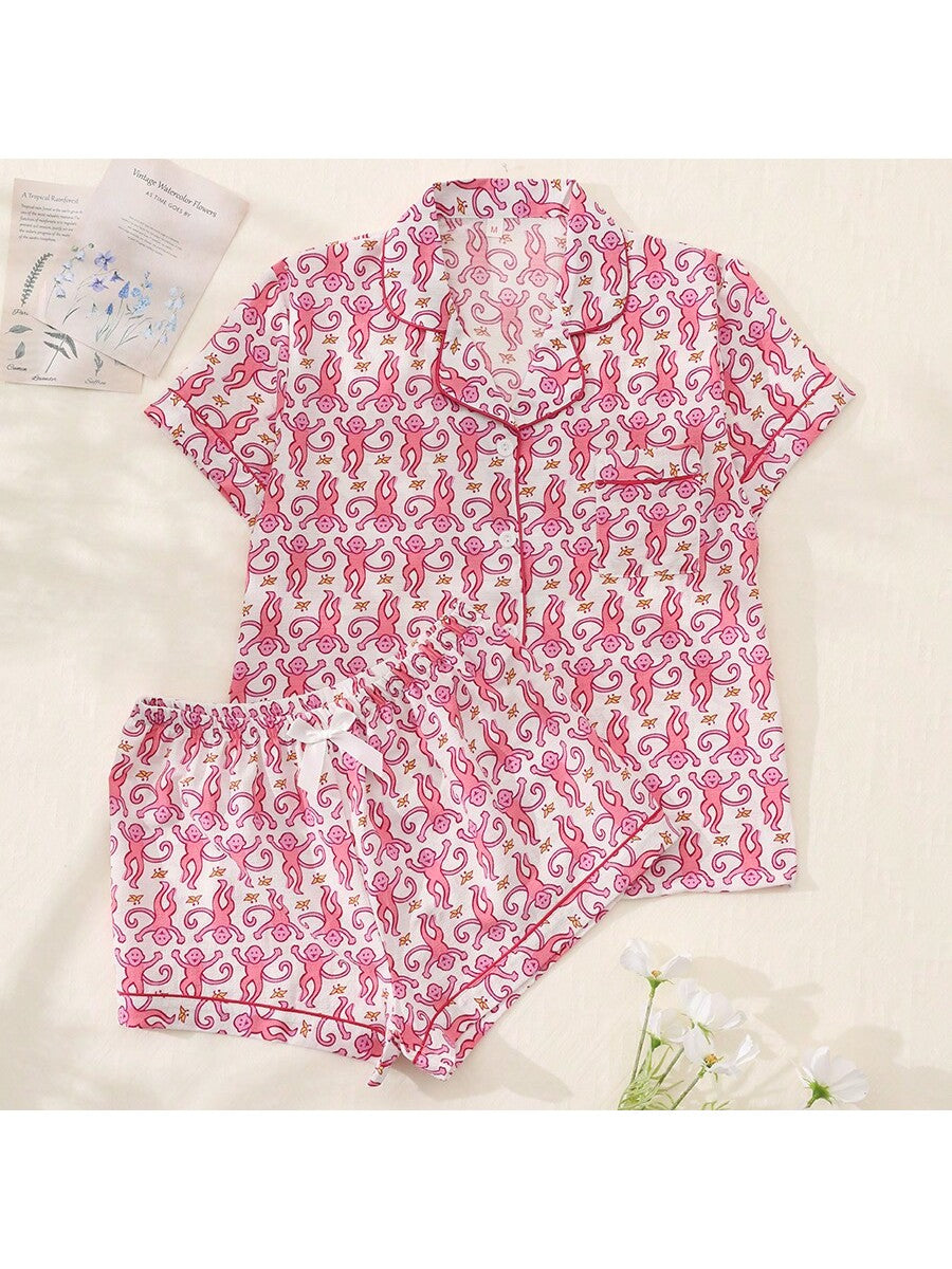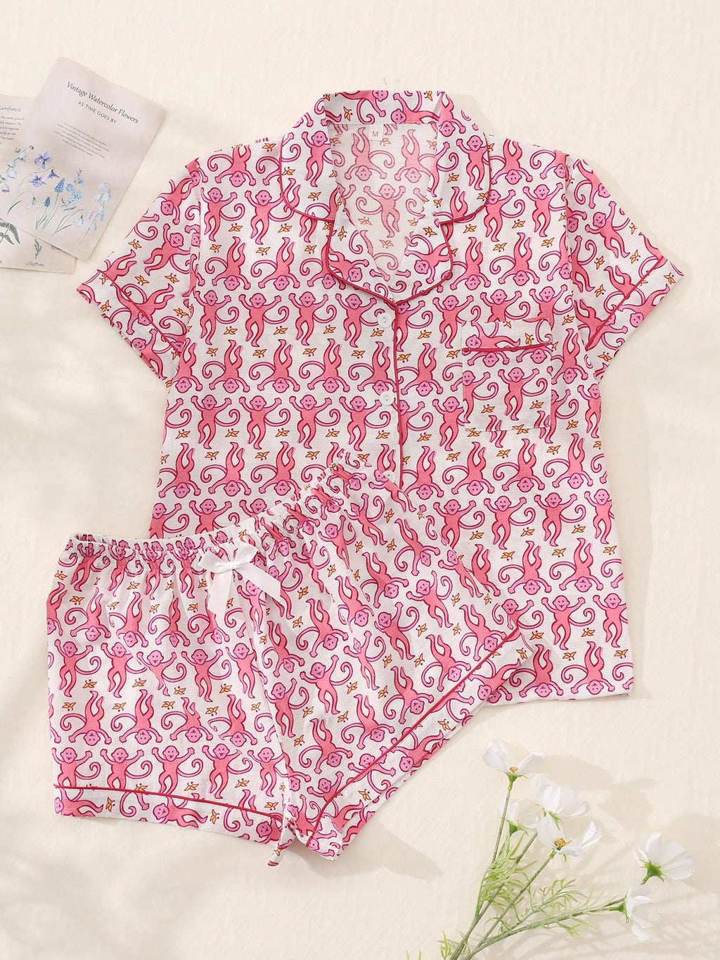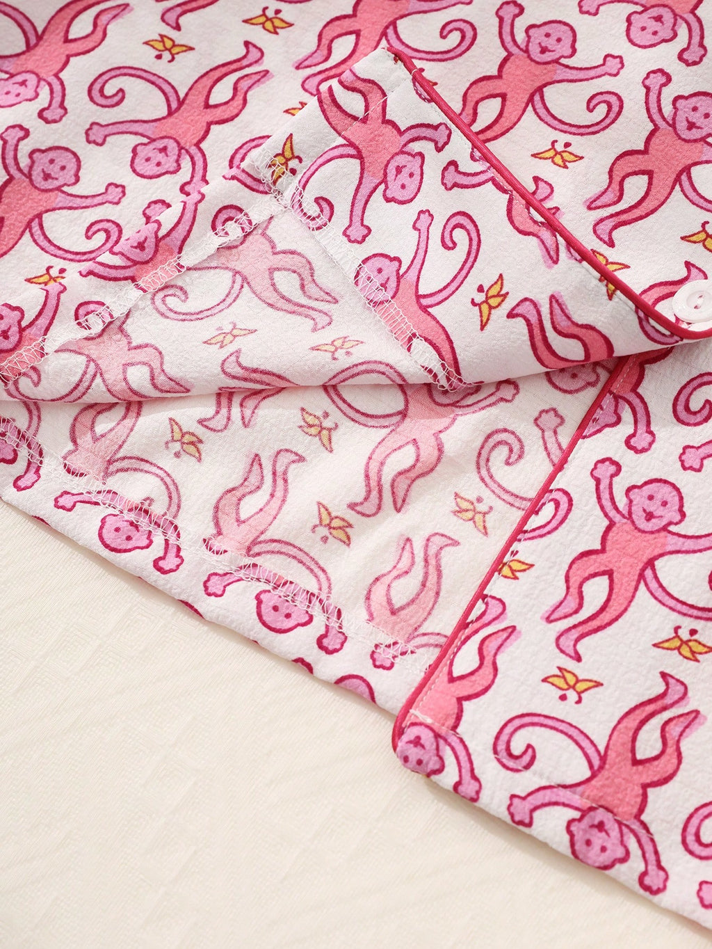 BELLAVOG Ženski set od 2 komada, majica i hlače s V-izrezom i dugmadima, s printom majmuna, kratkim rukavima i jednim redom kopčanja, ljetni set pidžame, udoban za kućnu upotrebu, set od dva dijela