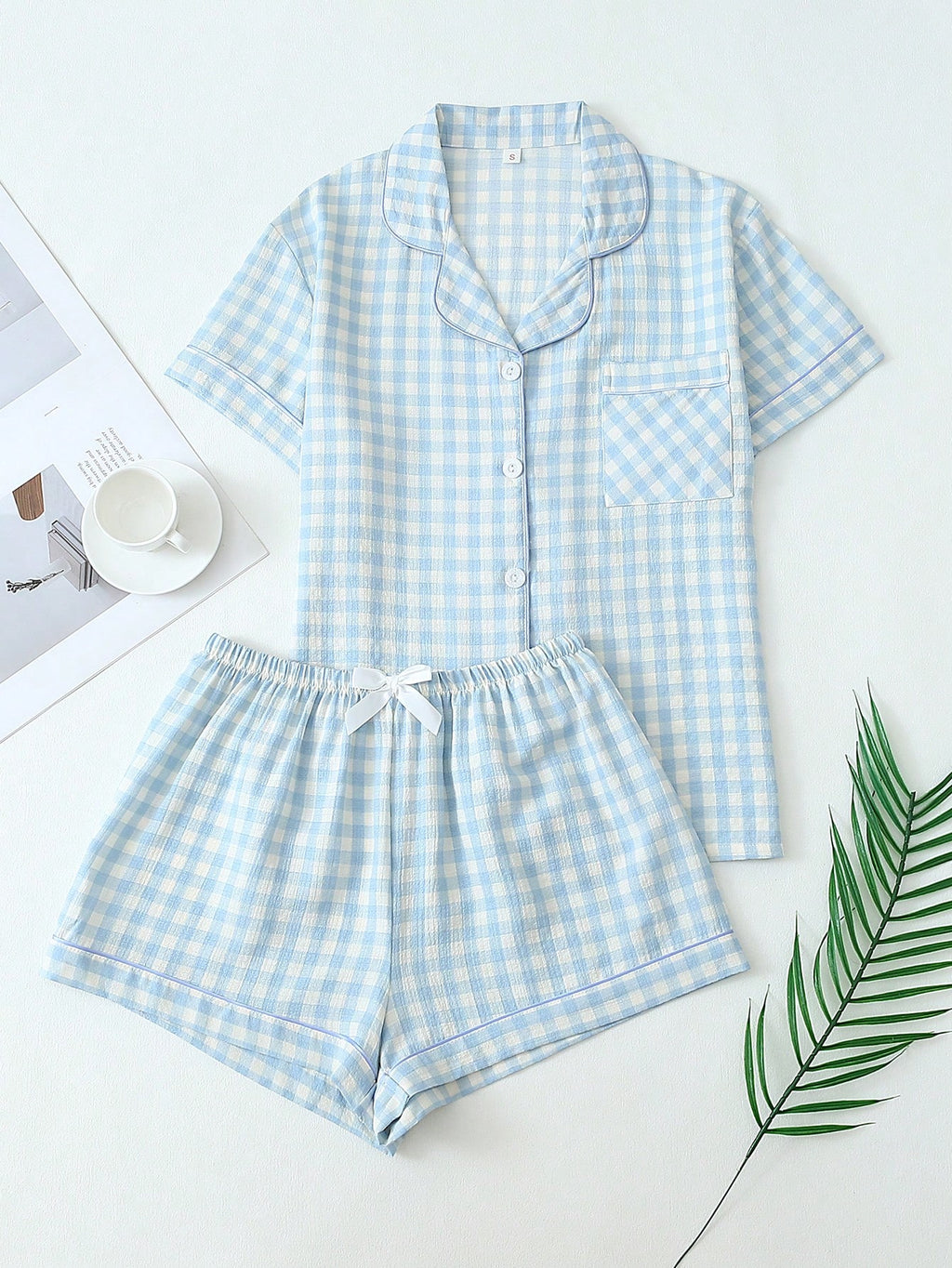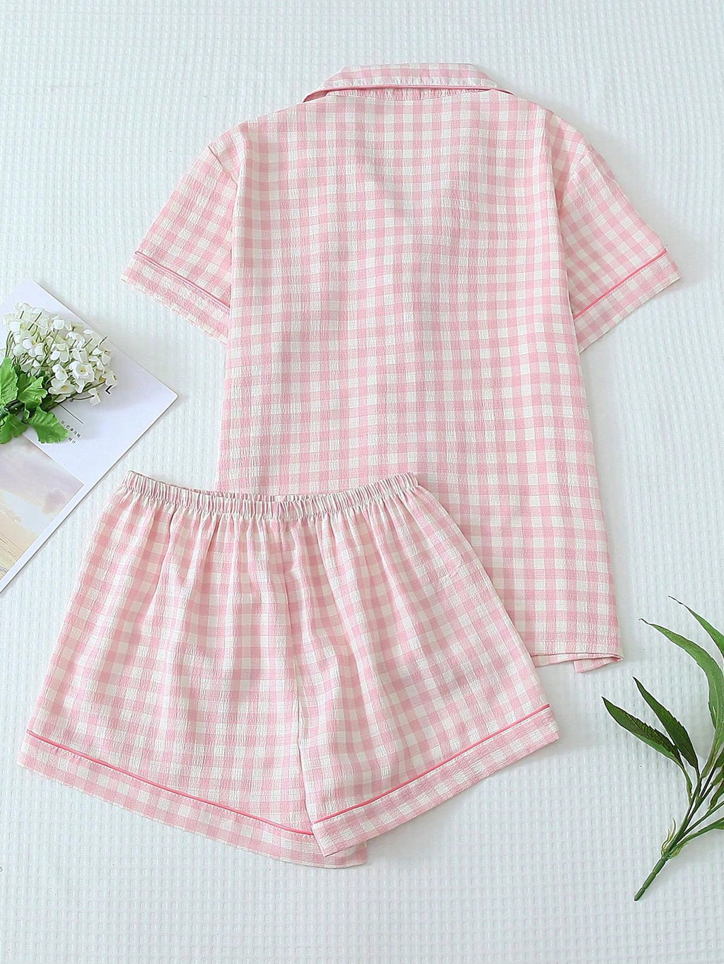 BELLAVOG Ženski set od 2 dijela s kariranim printom i kratkim rukavima, na kopčanje i šorts, ljetna odjeća za opuštanje, set od dva dijela