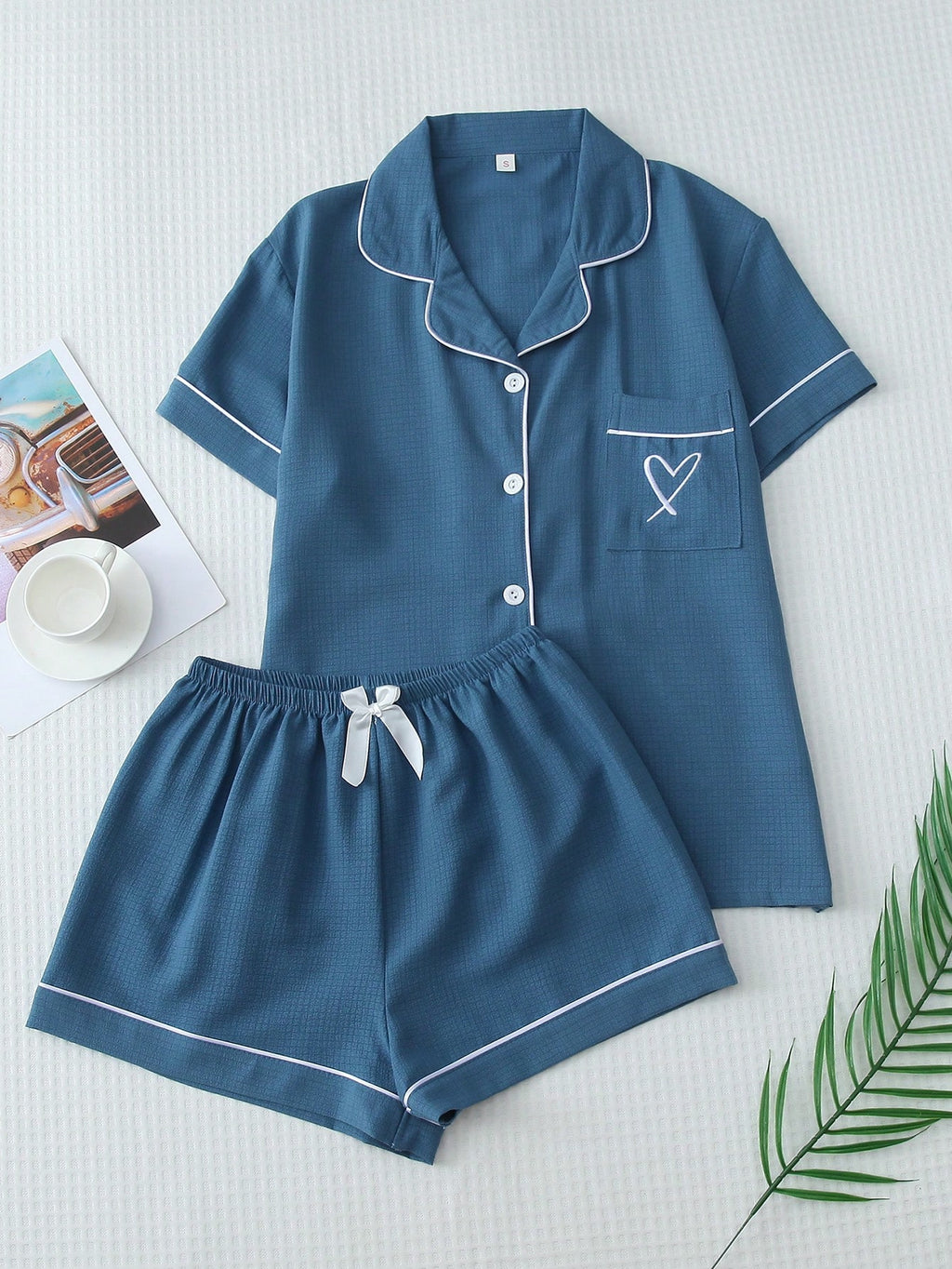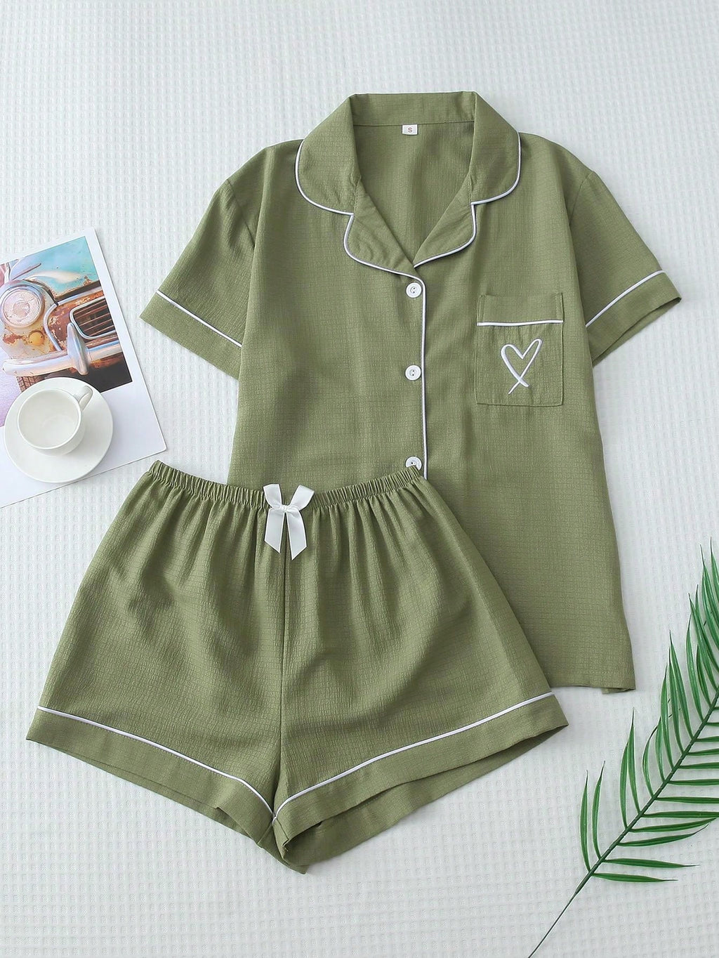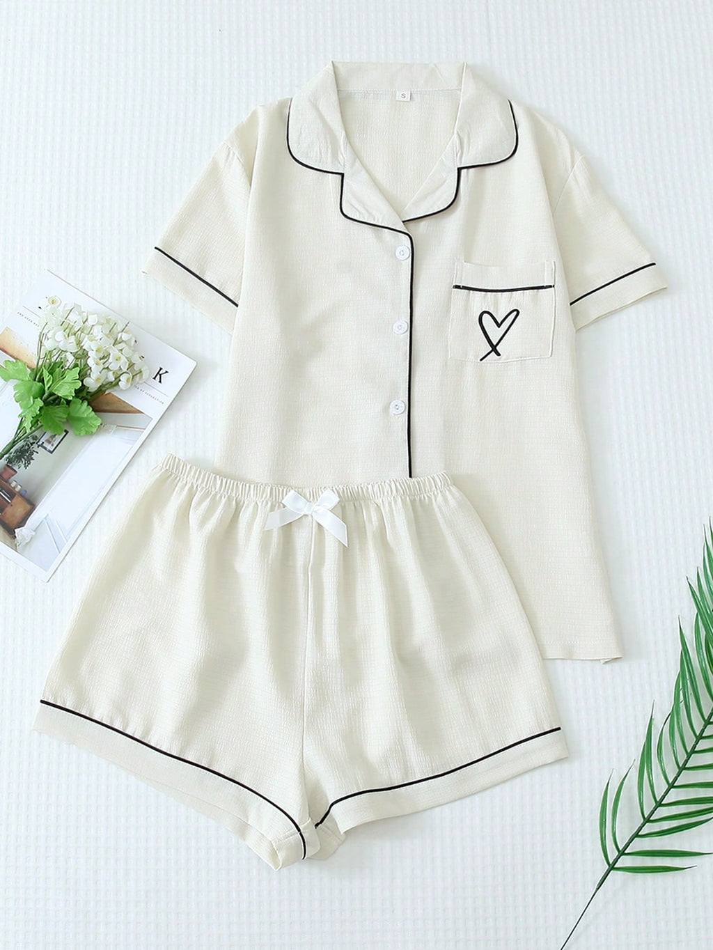 BELLAVOG Ženski jednobojni ljetni set kućne odjeće od 2 komada s kontrastnim obrubom, košulja kratkih rukava s izvezenim srcima i kratke hlače s mašnom, set od dva dijela