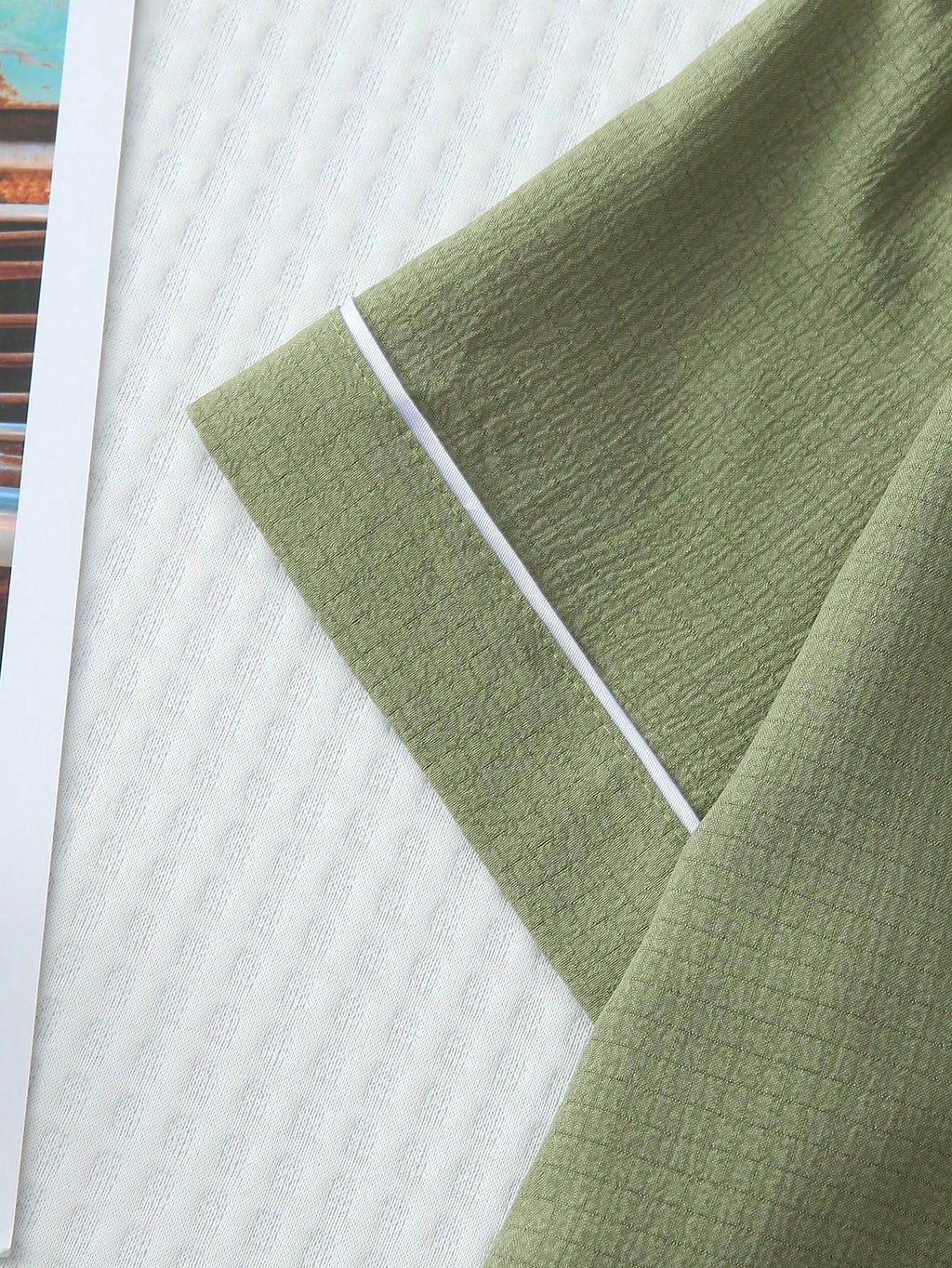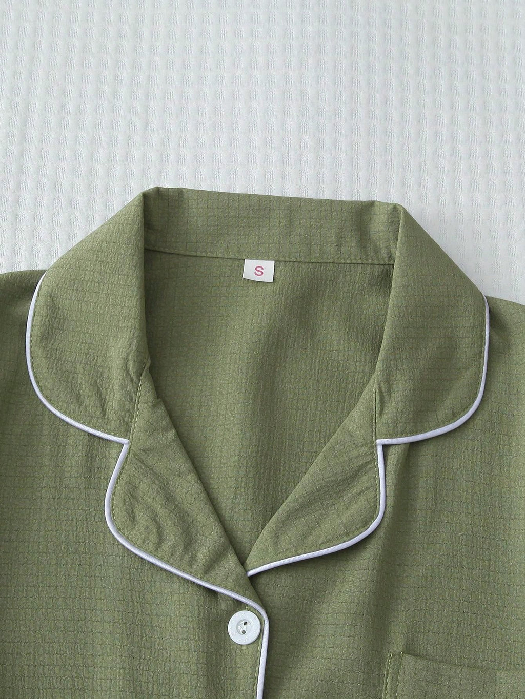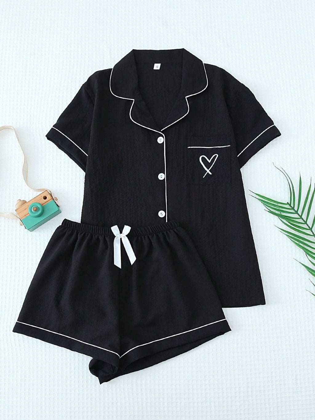 BELLAVOG Ženski jednobojni ljetni set kućne odjeće od 2 komada s kontrastnim obrubom, košulja kratkih rukava s izvezenim srcima i kratke hlače s mašnom, set od dva dijela