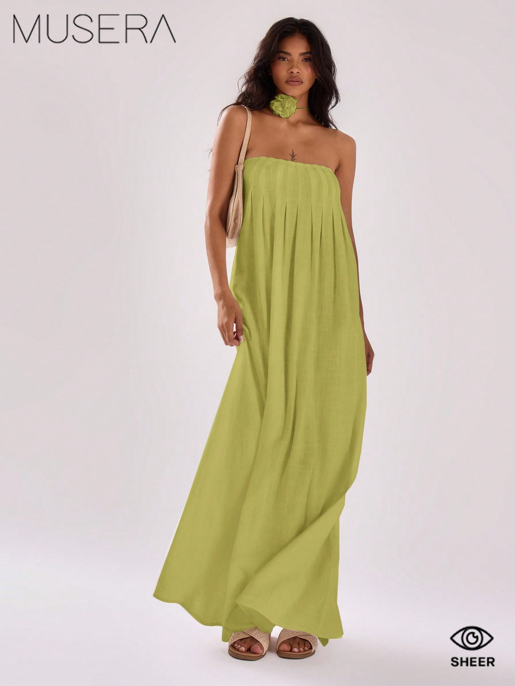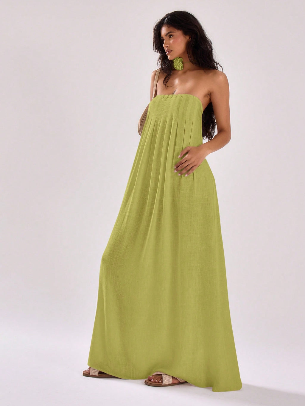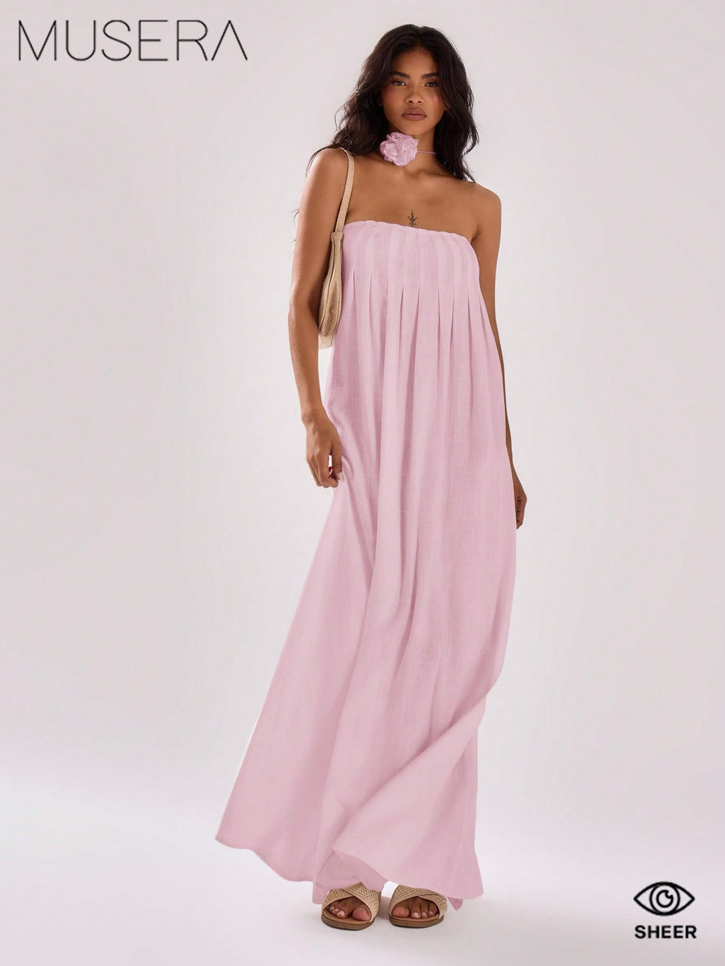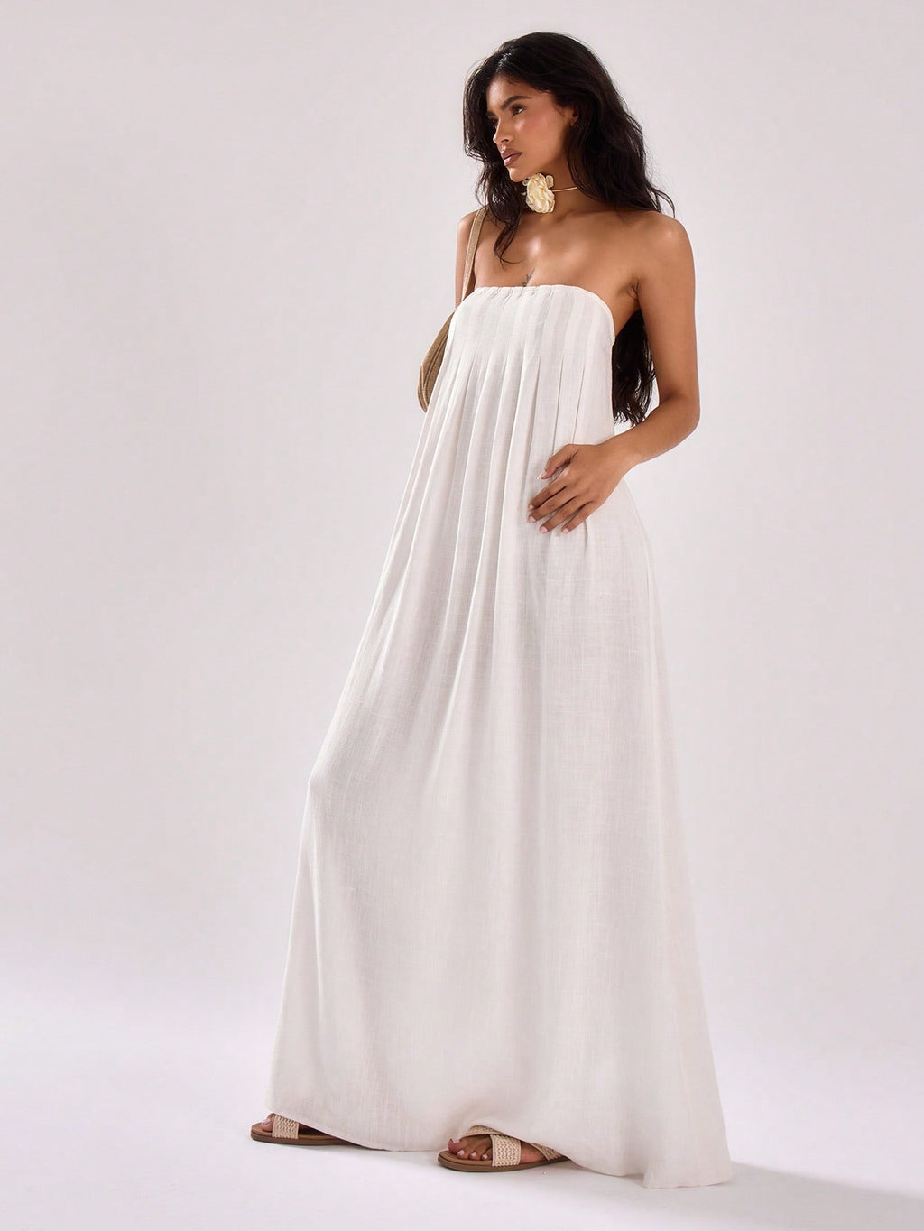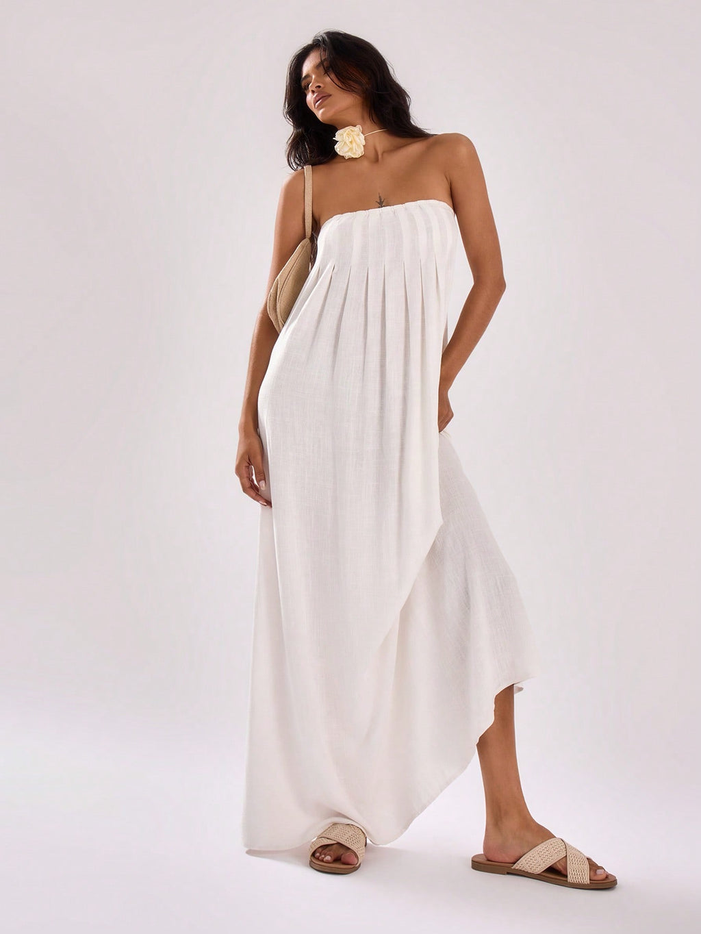 BELLAVOG Bandeau Loose Fit Pleated Maxi Dress Vacation Summer Wedding Guest, Graduation
