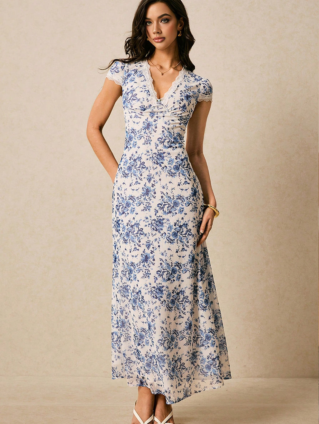 BELLAVOG Plava haljina s printom, Čipkasta haljina s patchwork uzorkom, Elegantna duga haljina, Cvjetna haljina, Ženske odjevne kombinacije za rođendan, Ženska haljina za Uskrs, Ženska elegantna haljina s cvjetnim printom po cijeloj površini, Poeselle