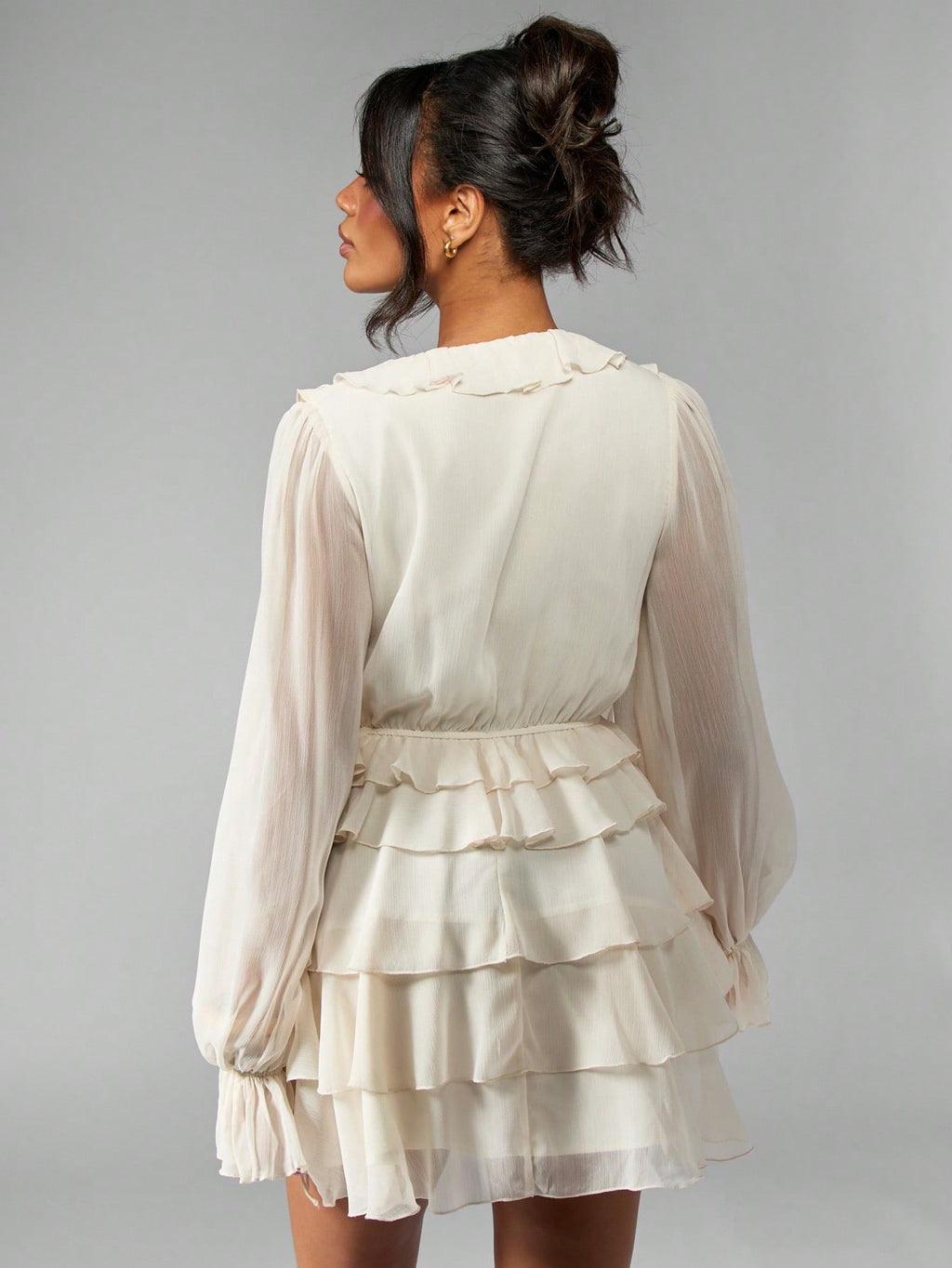 BELLAVOG Chiffon Tiered Ruffle Mini Dress Long Balloon Sleeve Bohemian Wedding Guest Party Special Occasion Spring Summer Elegant Feminine Pleated Flowy Dress