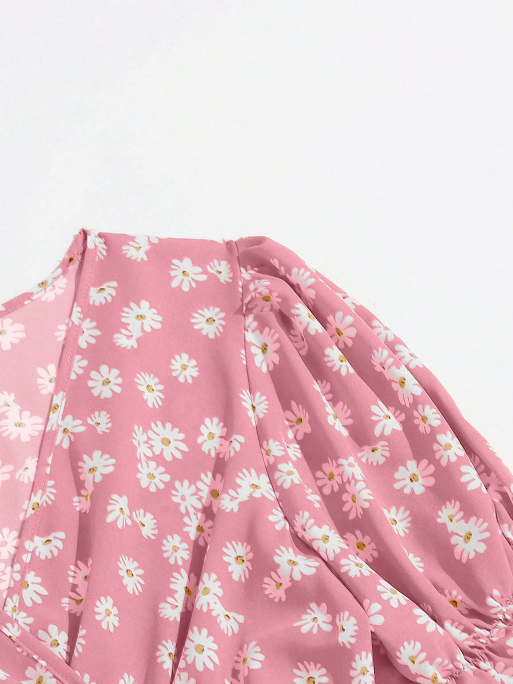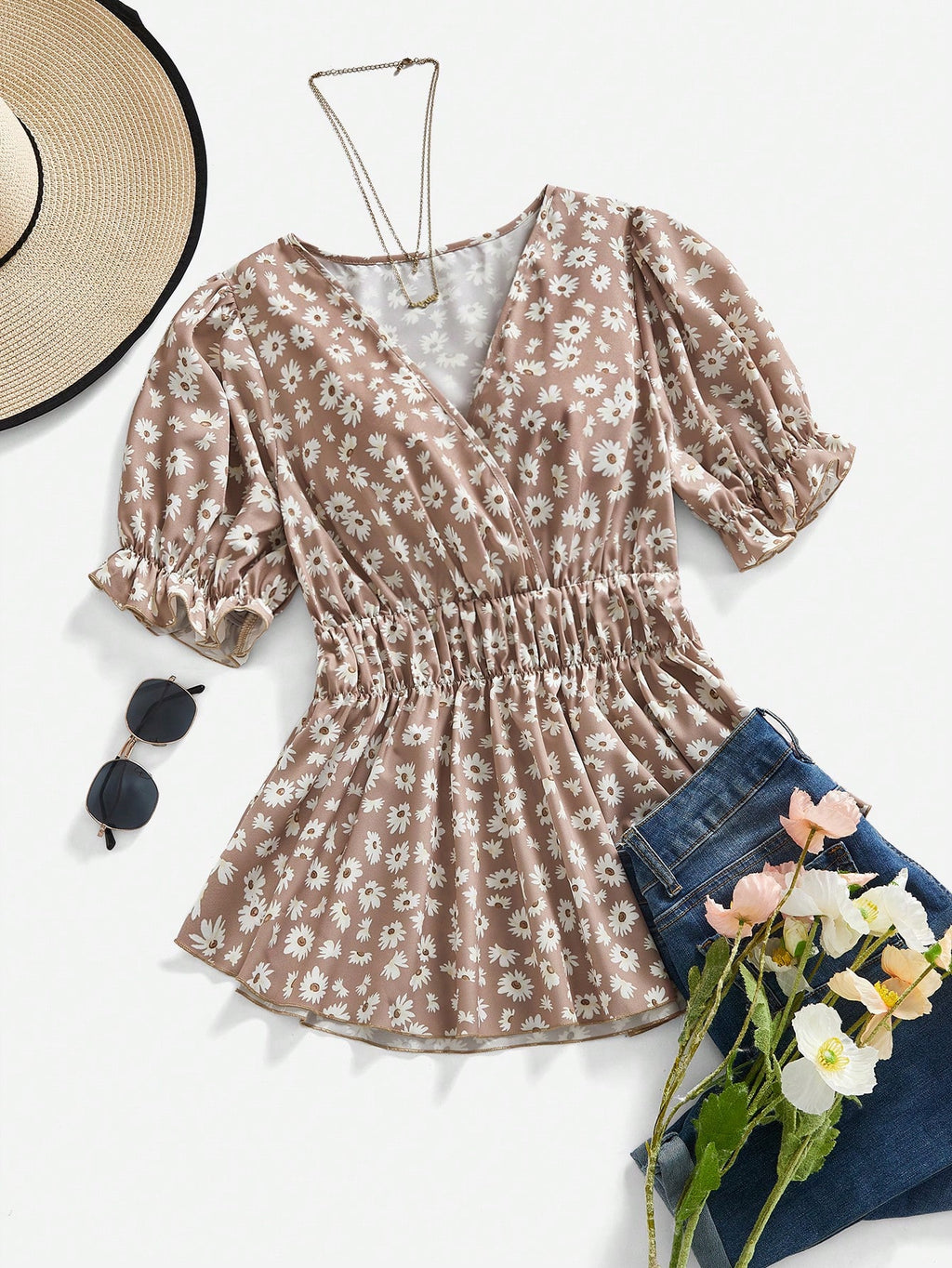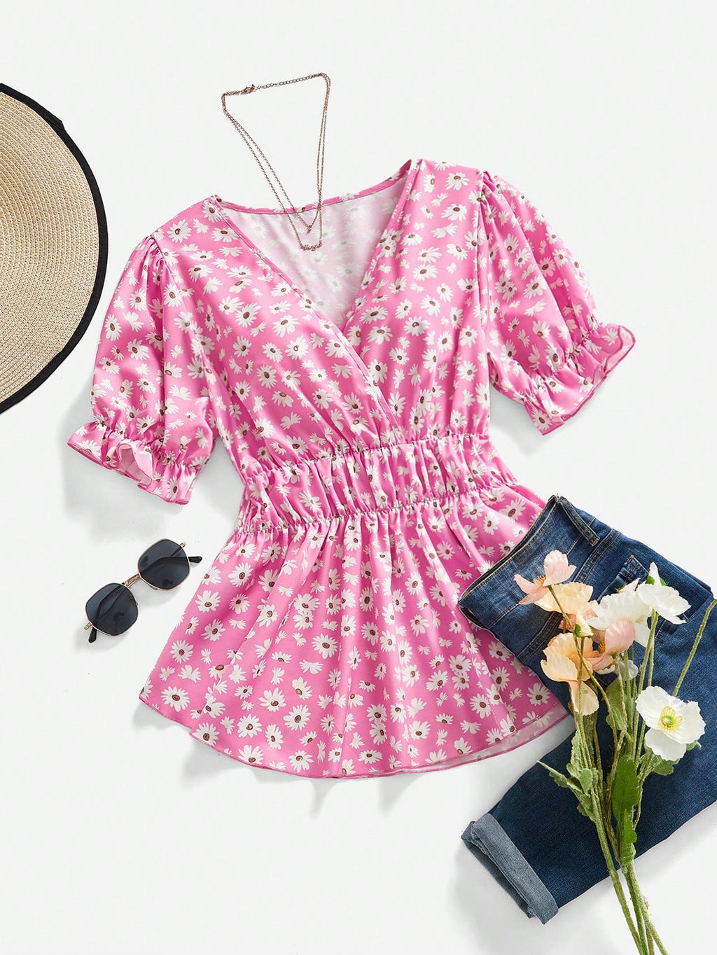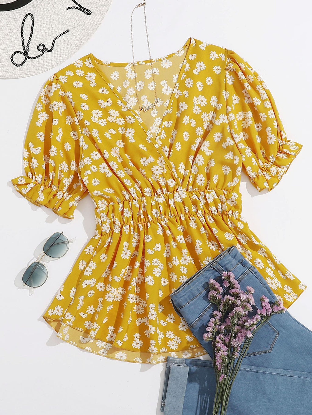 BELLAVOG majica kratkih rukava s printom tratinčica i stezanjem struka za ljetni odmor