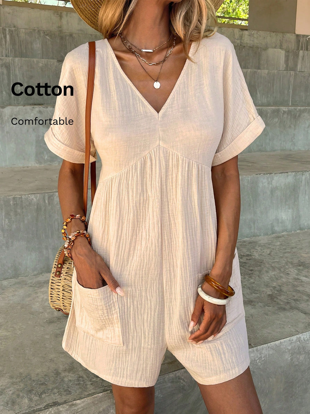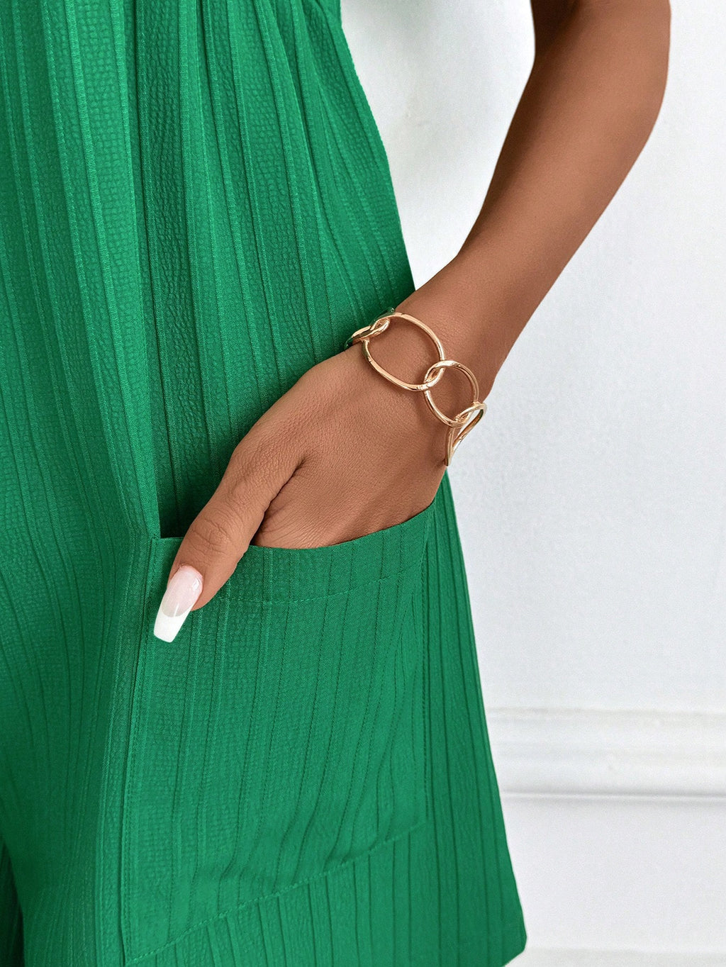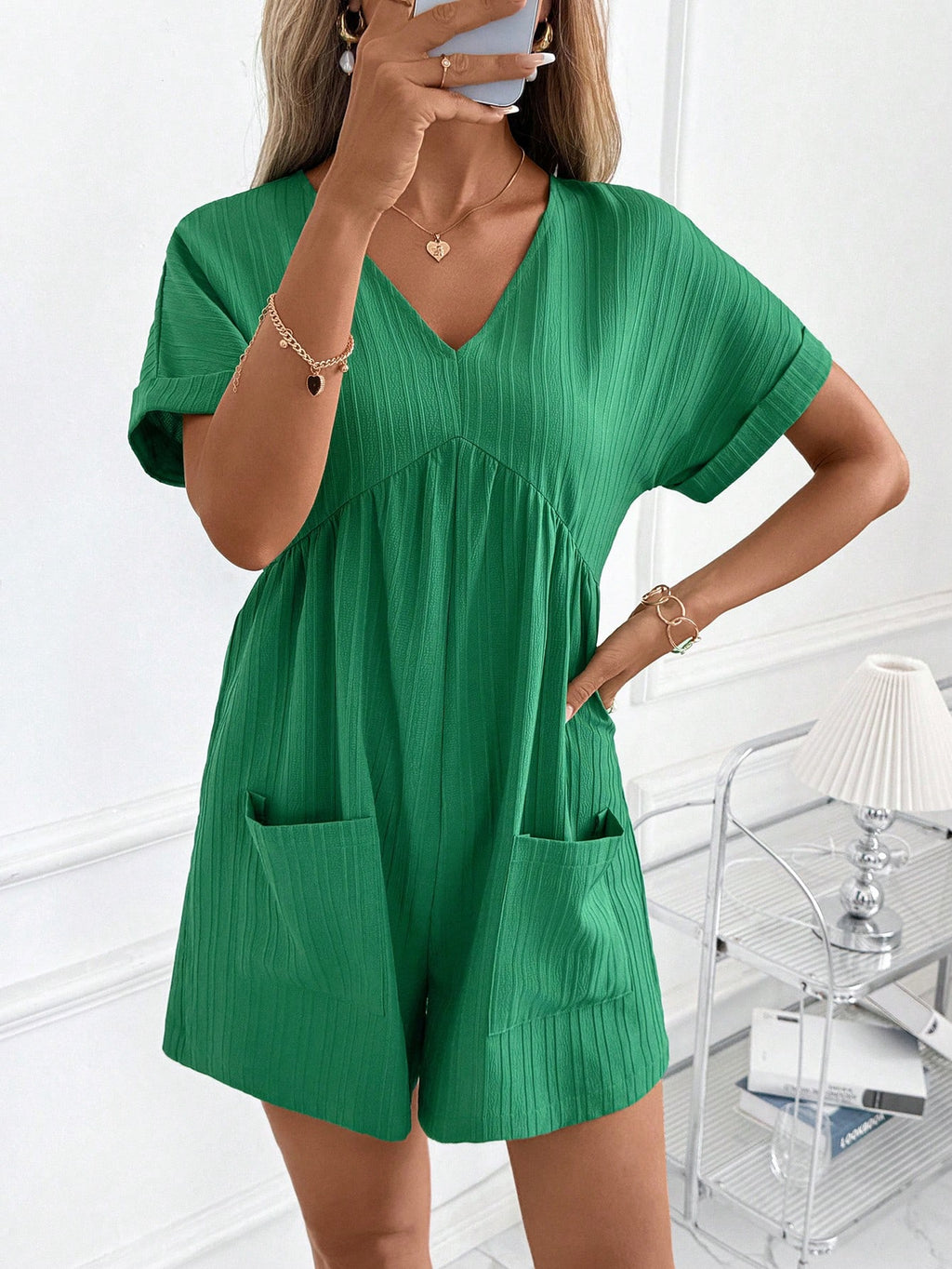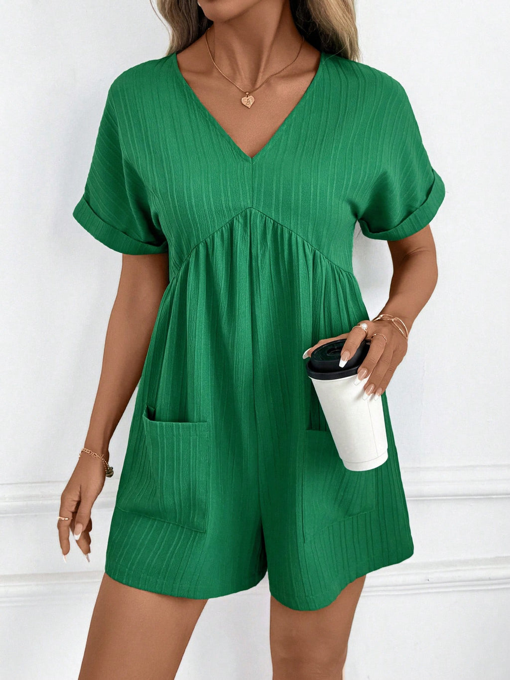 BELLAVOG Clasi Ženski kombinezon kratkih rukava s V-izrezom, zelenim žakardom i morskim valovima - Elegantna svakodnevna odjevna kombinacija, proljeće/ljeto