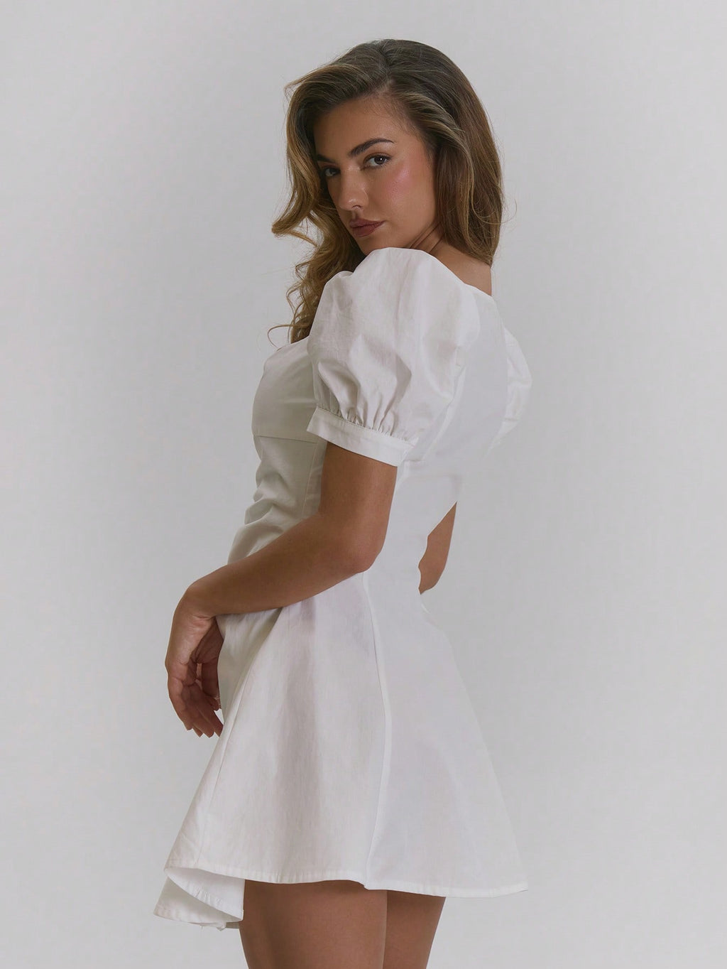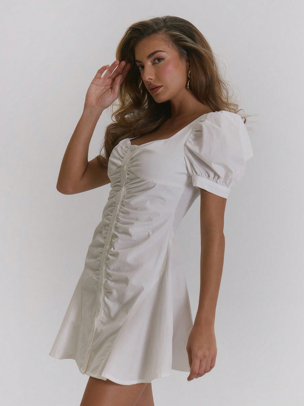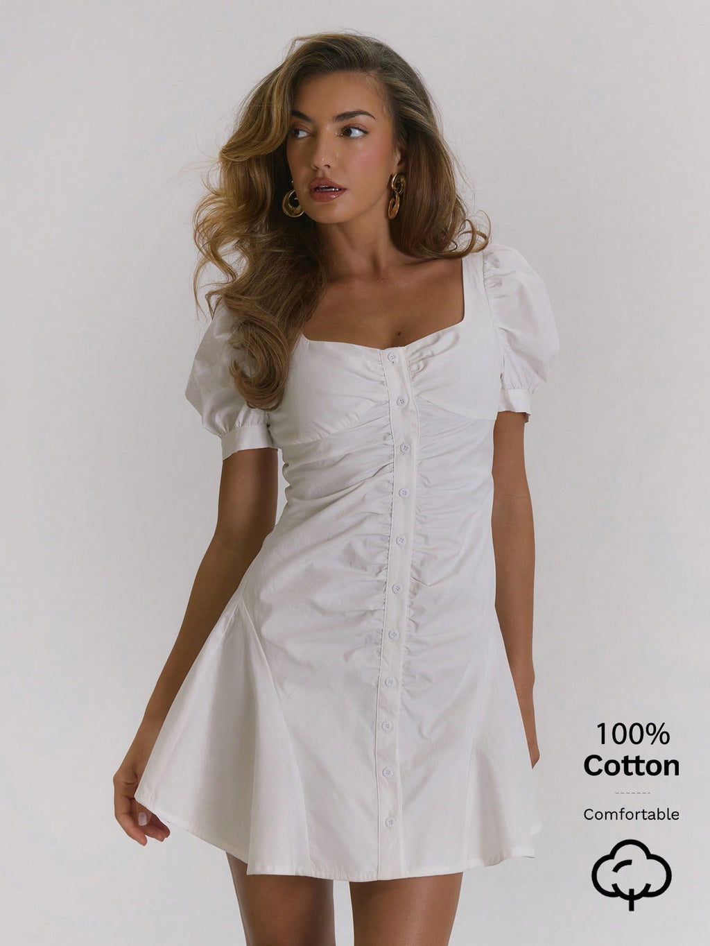 BELLAVOG Cotton Puff Sleeve Full Button Up Ruched Mini Dress Spring Summer Boho, Elegant, Holiday Dainty Fields