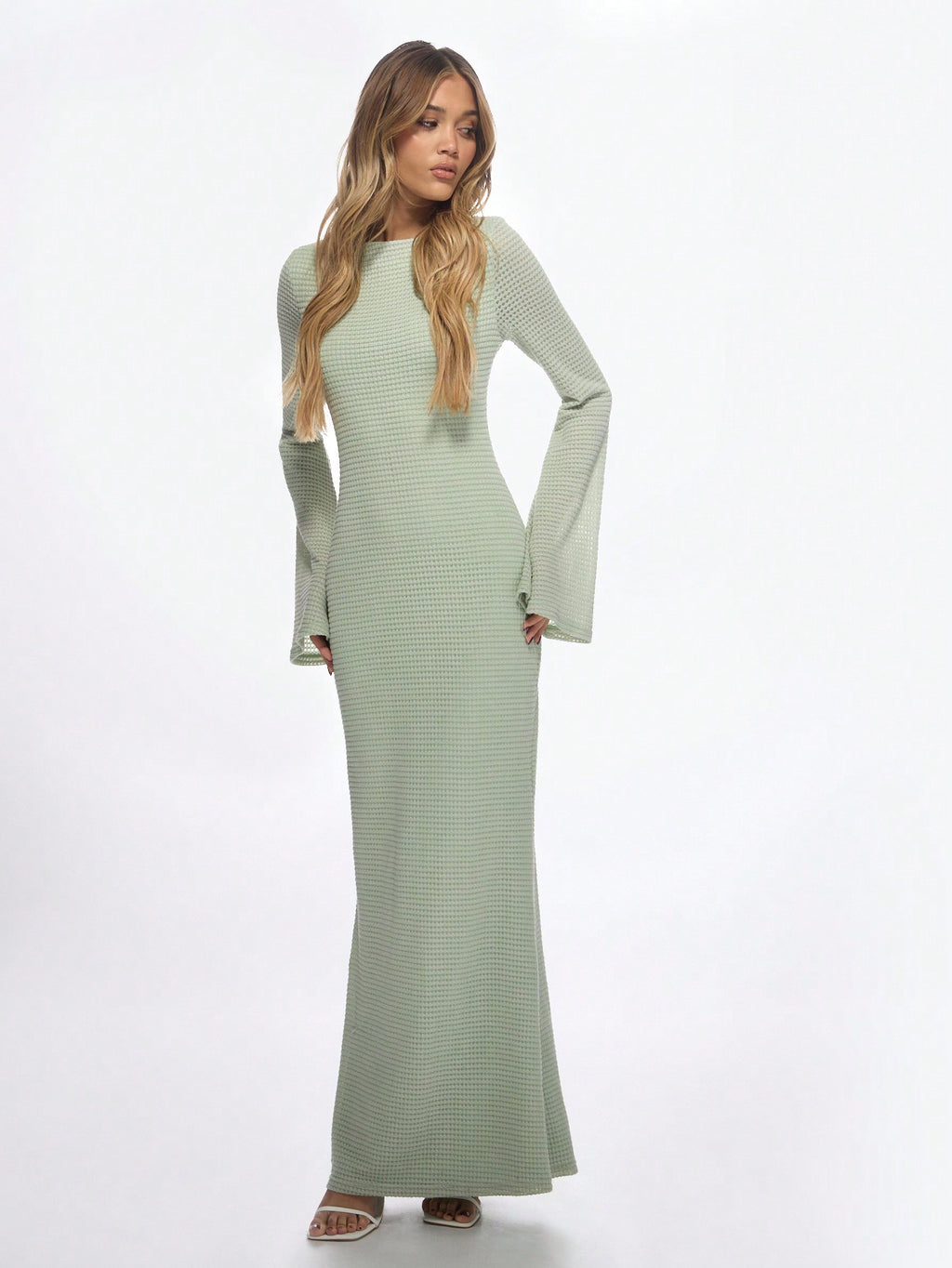 BELLAVOG Elegant Knit Bell Sleeve Maxi Dress Evening Gown Form Fitting Textured Ribbed Floor Length Party Wedding Guest Spring Summer