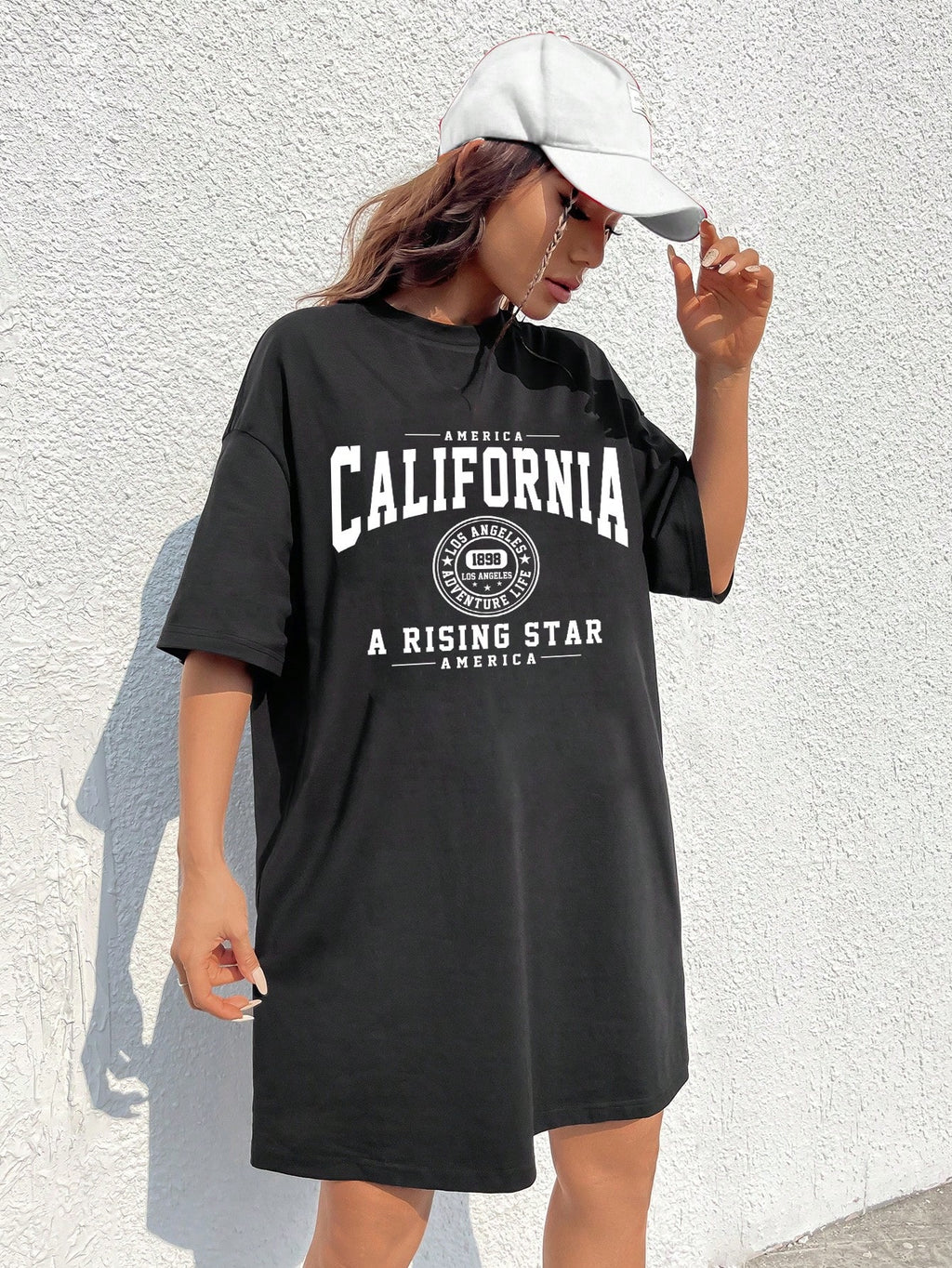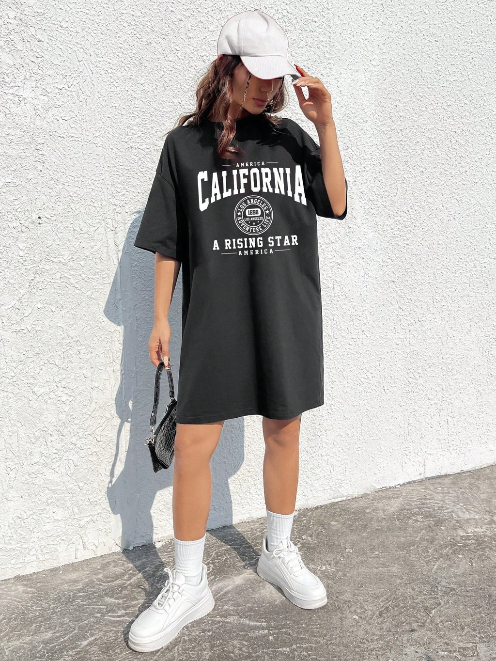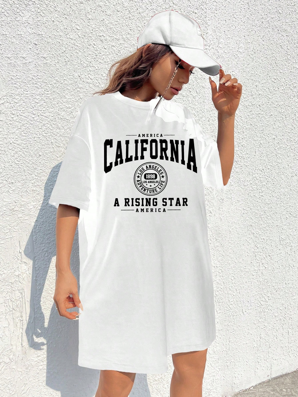 BELLAVOG EZwear Ležerna bijela kalifornijska engleska printana crna široka kratka haljina s okruglim izrezom i kratkim rukavima za žene, pogodna za ljetnu sportsku sezonu, pamuk uključen