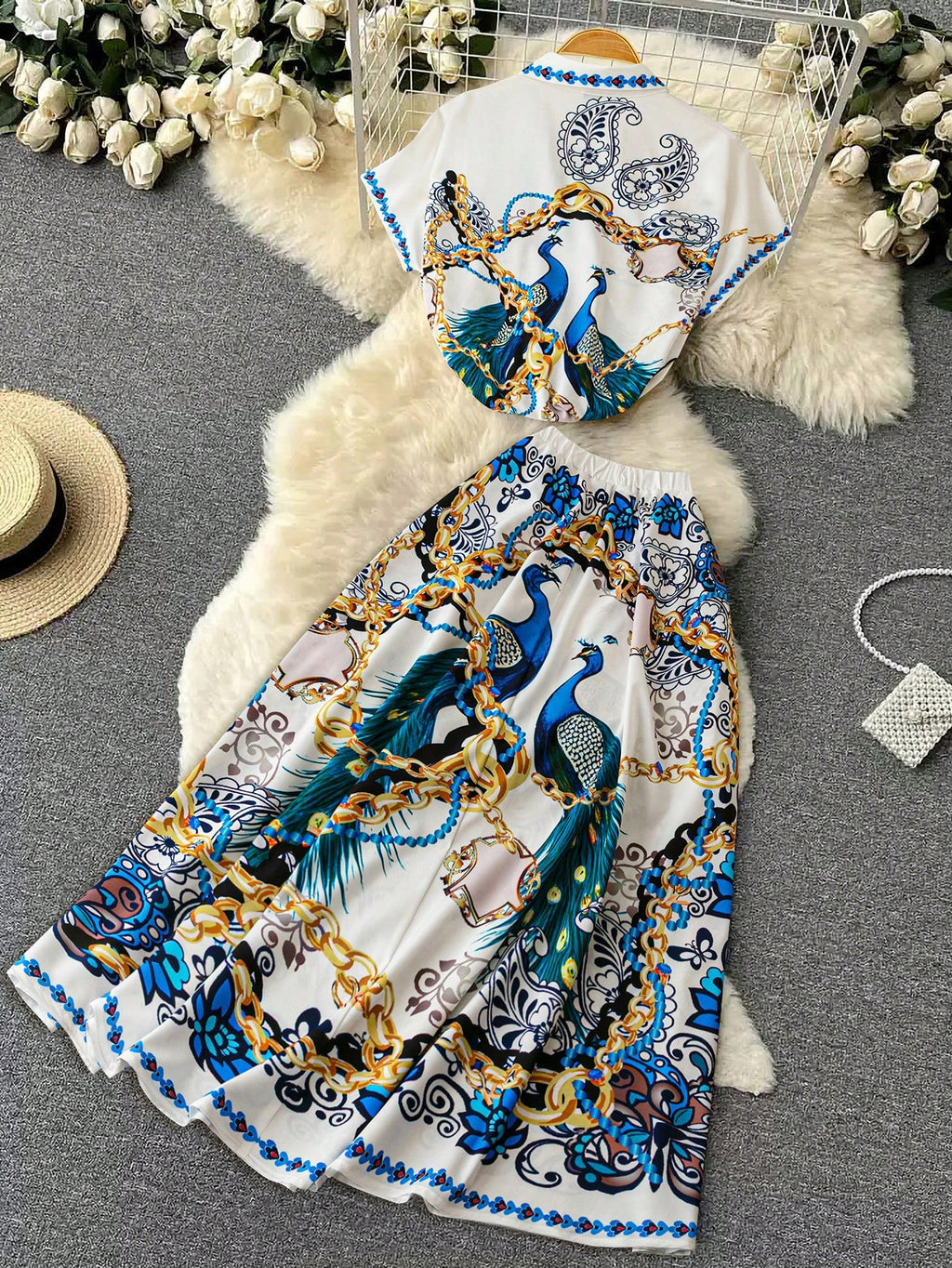 BELLAVOG Moderan set od dva dijela s ovratnikom i printom pauna, plus veličina, pogodan za nošenje u odmaralištu